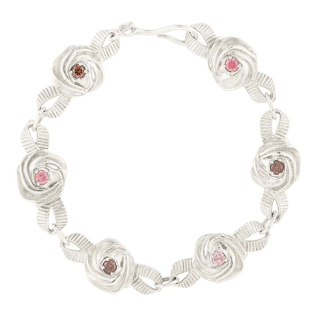 The ribbon “leaves” of the rosette motif serve as linking components in this sterling silver bracelet.