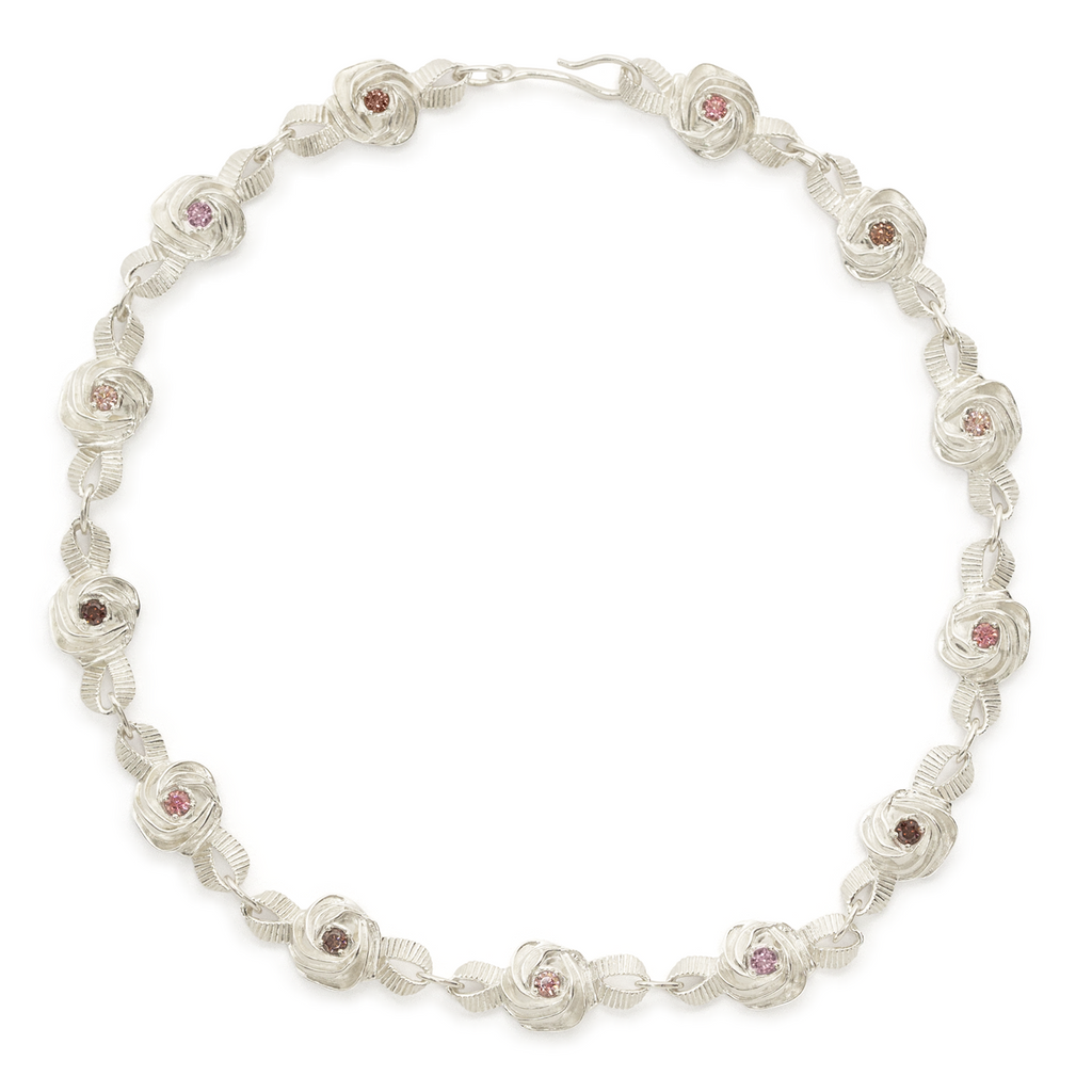 The ribbon “leaves” of the rosette motif serve as linking components in this sterling silver necklace.