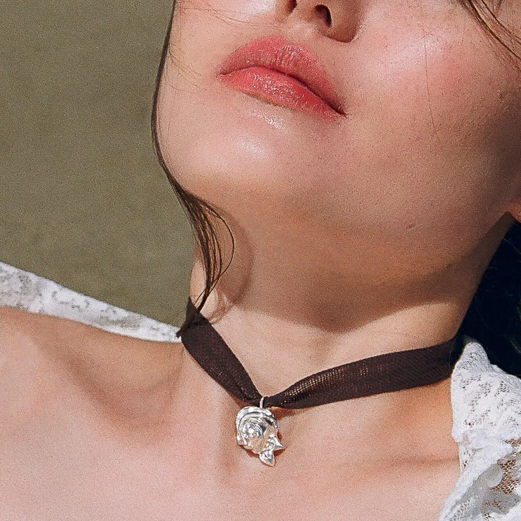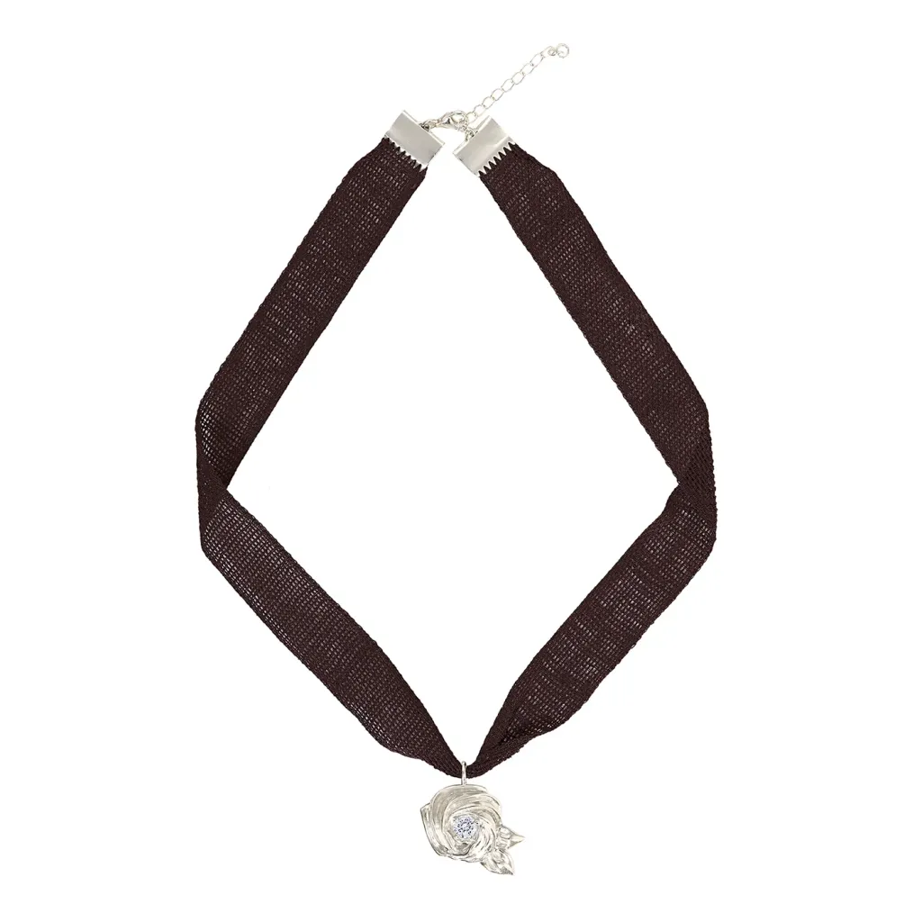 A sterling silver rosette hangs from a chocolate brown loose weave Italian ribbon.
