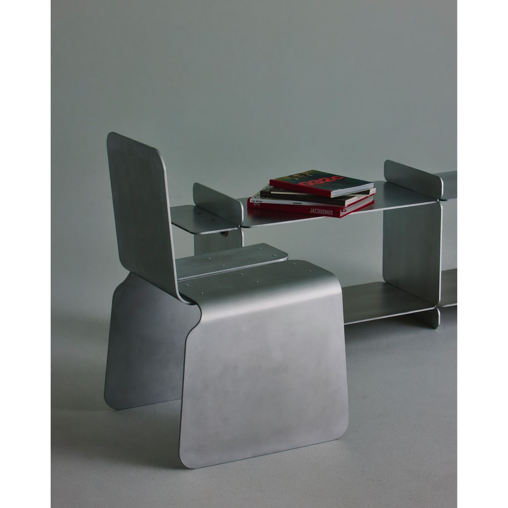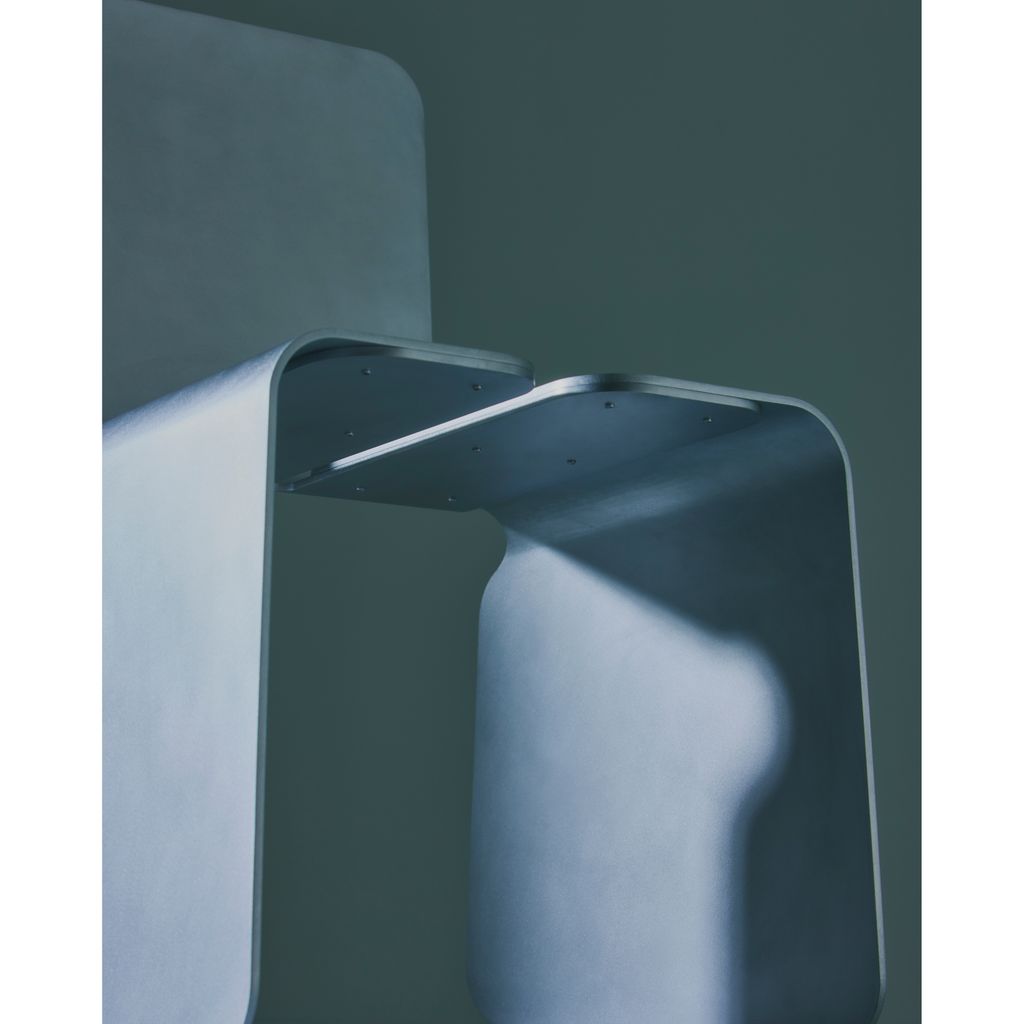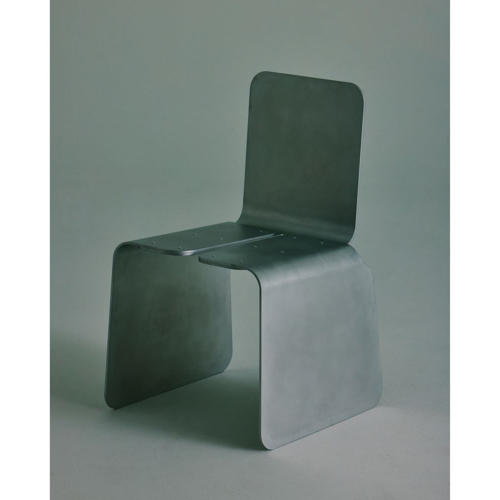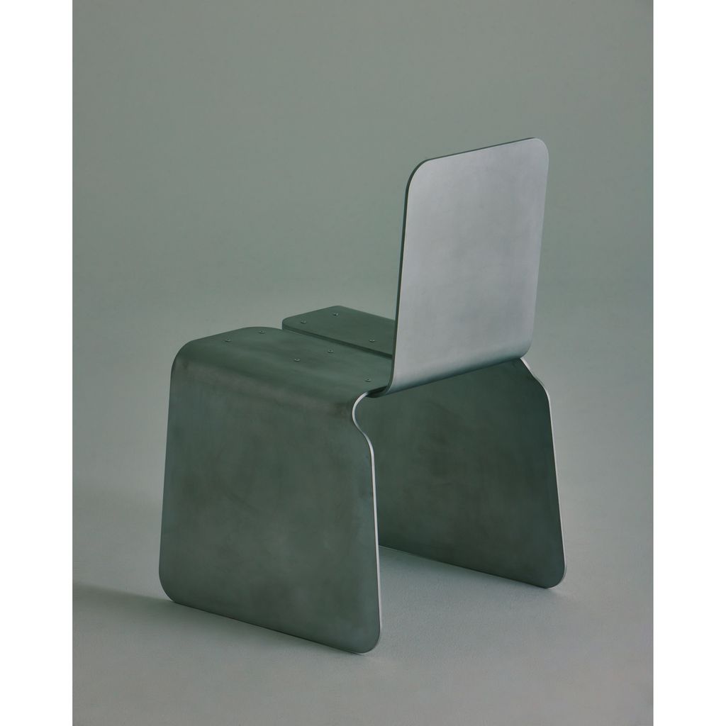 The Rounded Edges Chair advances the collection’s essential simplicity. Three folded aluminum plates are joined together by rivets at the seat to form the chair’s sleek silhouette. Composed of quarter inch thick sheets, the chair is available in two distinct colours; clearbrushed aluminum and pale green.