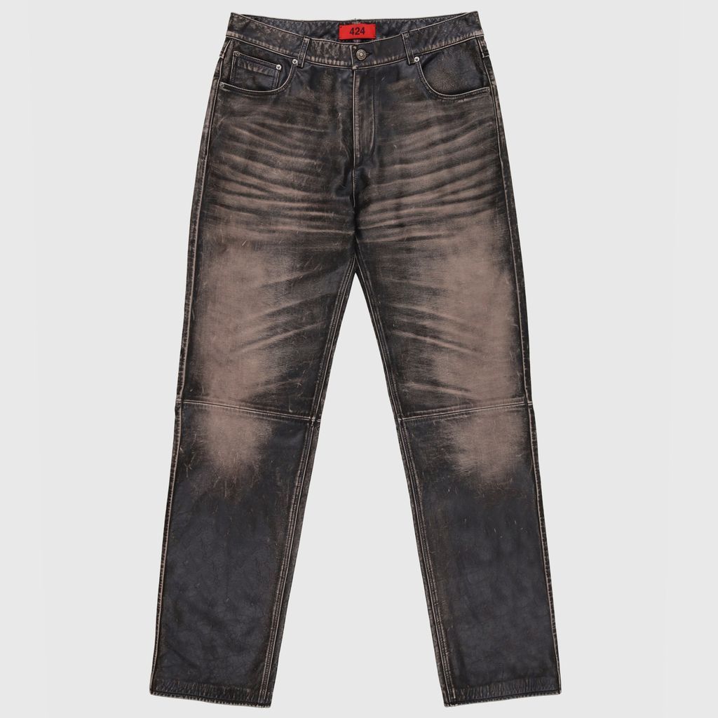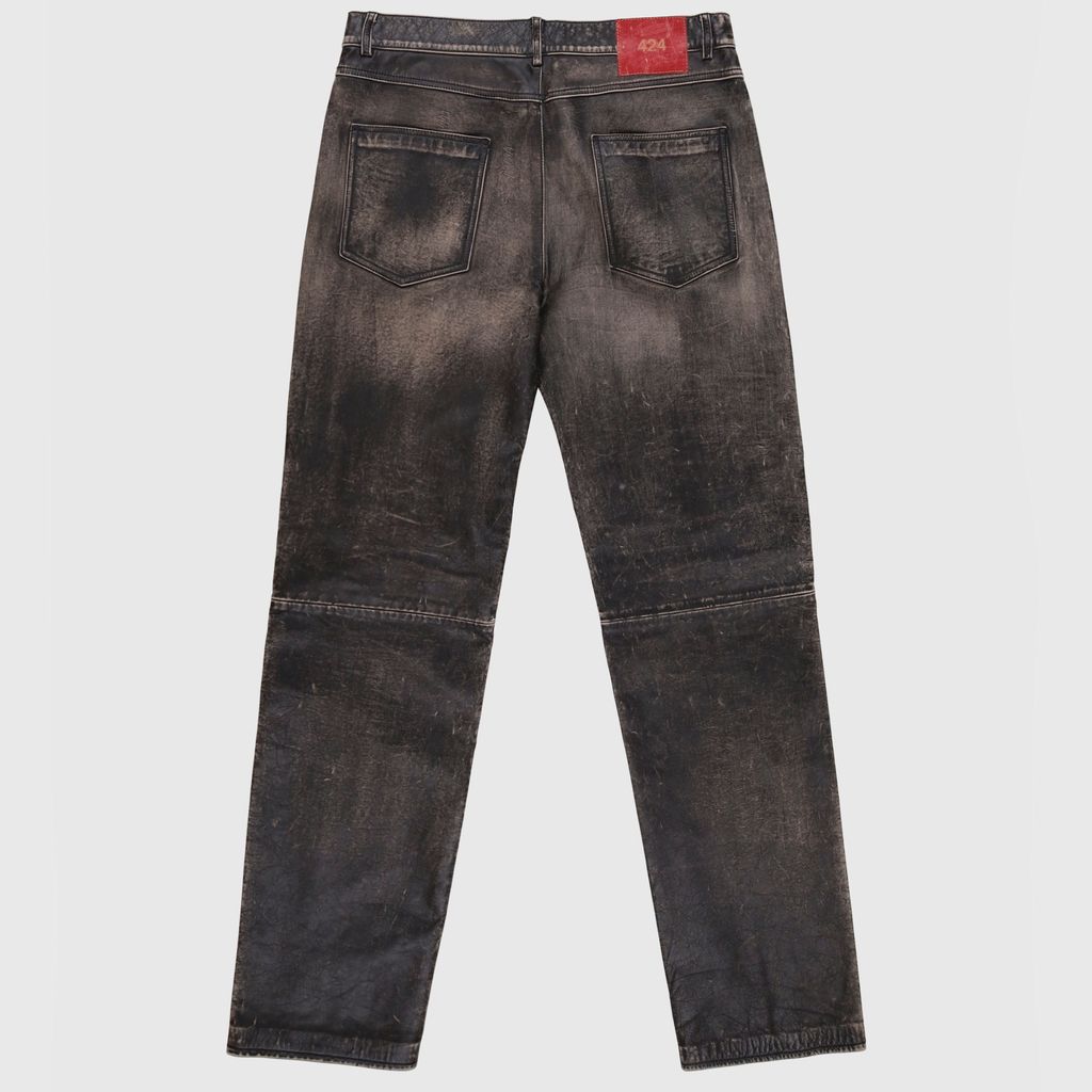 424 Leather jean features calf rub off leather, denim dye treatment, distressed red leather patch, 5 pocket design, 424 embossed hardware.