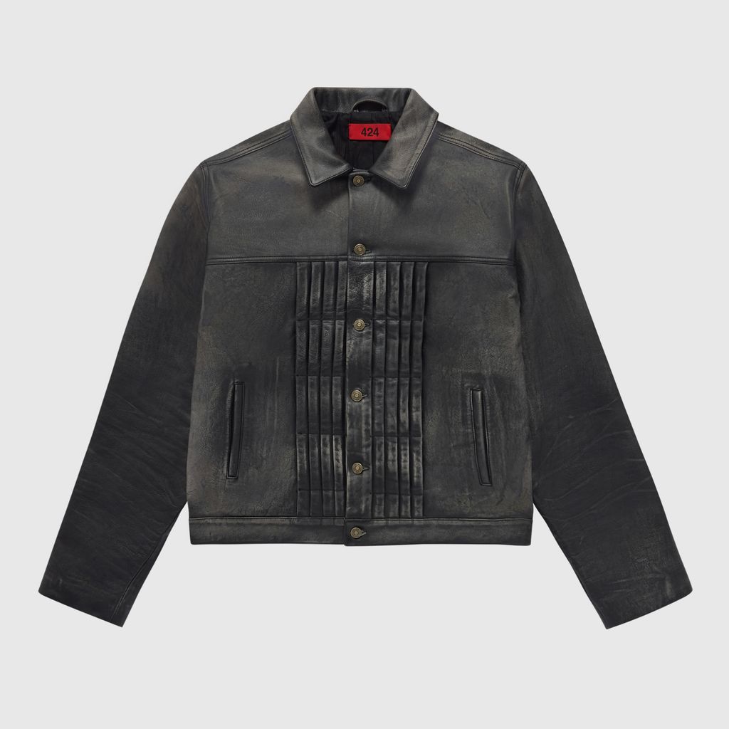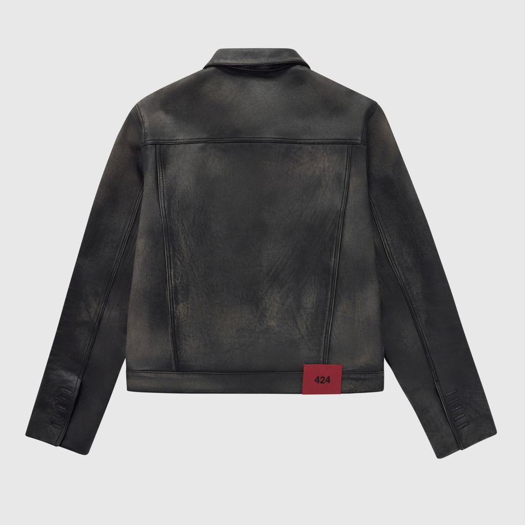 424 Leather Trucker Jacket features vintage washed dye, sanding treatment, button closure, embossed 424 hardware, washed treatment, fold down collar, and denim treatment dye.