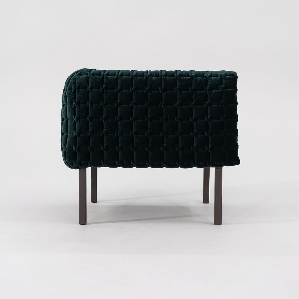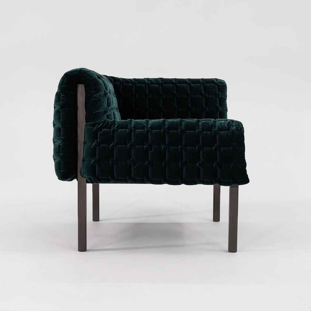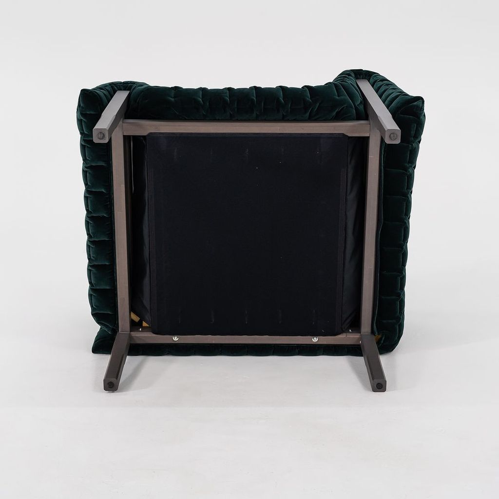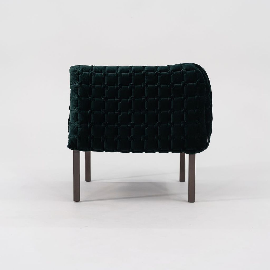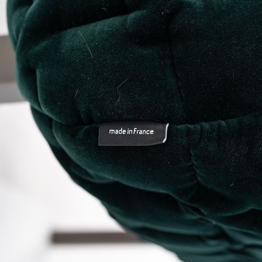 Listed for sale is a Ruche Armchair Left made of a wood base and steel frame covered in an evergreen cotton velvet fabric. The chair was designed by Inga Sempe and produced by Ligne Roset in France. It was made circa 2023 and is guaranteed as authentic. Condition is excellent. See photos. This came directly from Ligne Roset and was likely either used as a display model or was a showroom floor model.