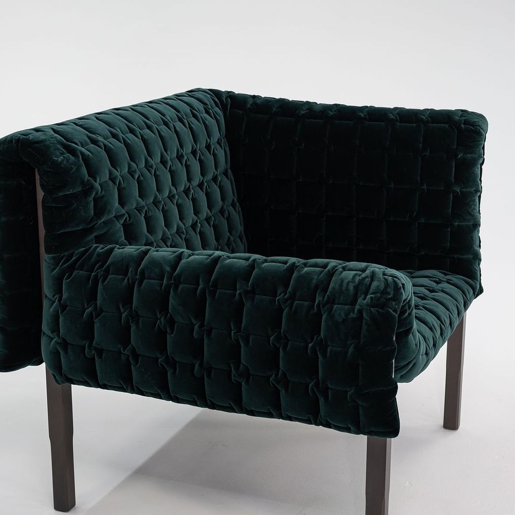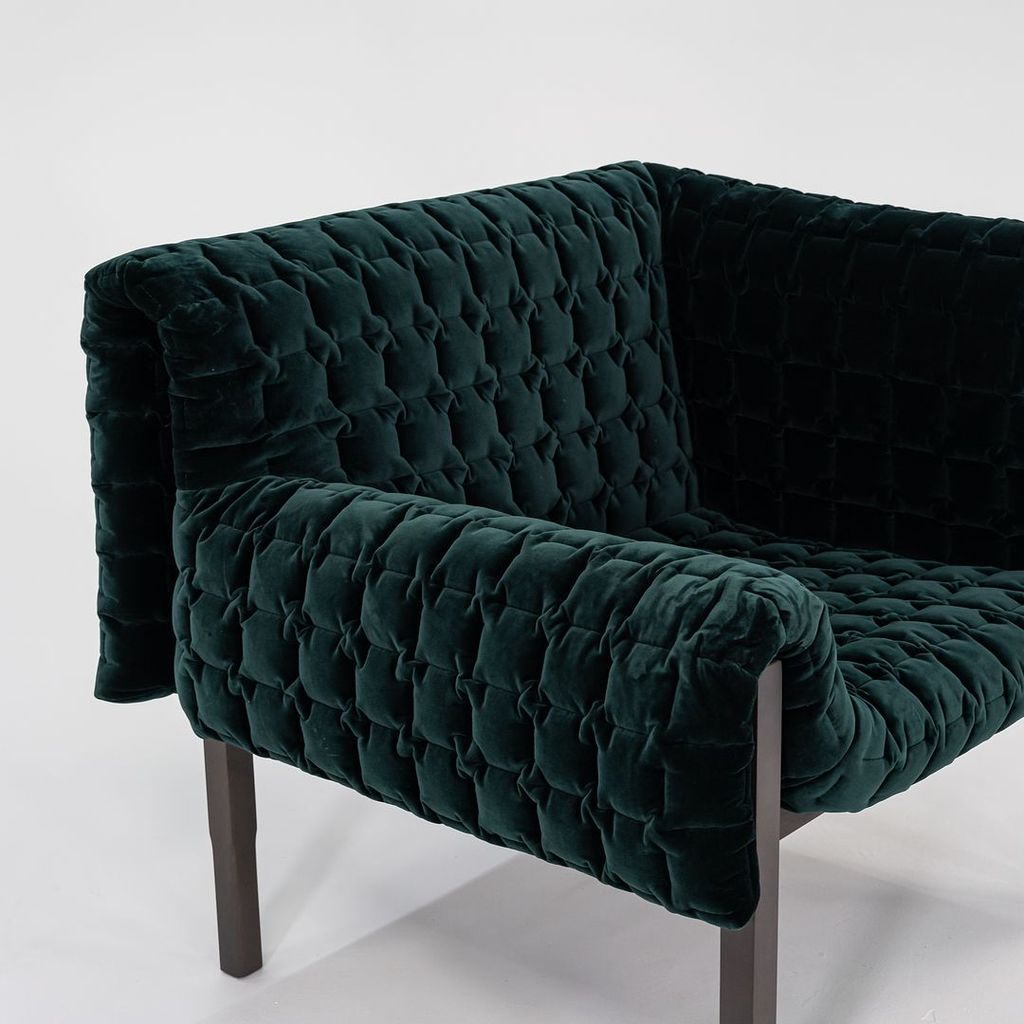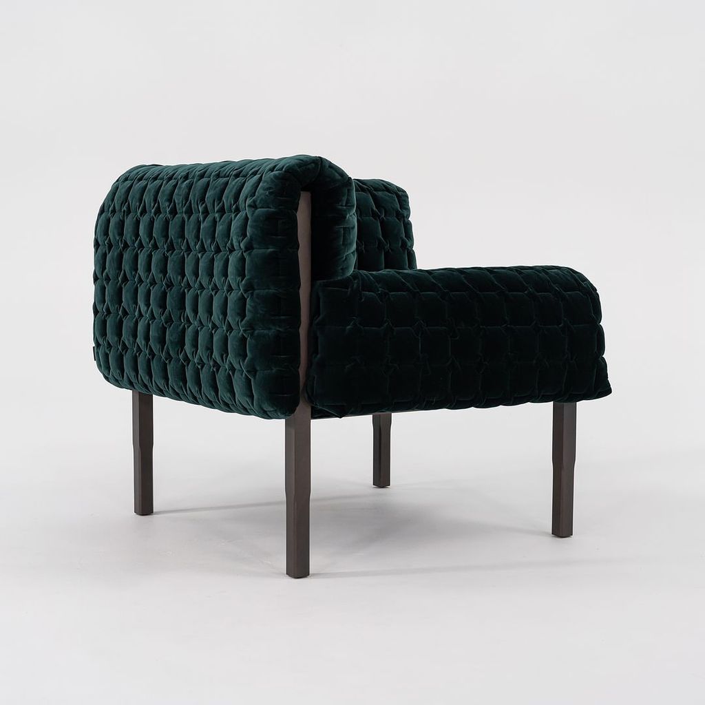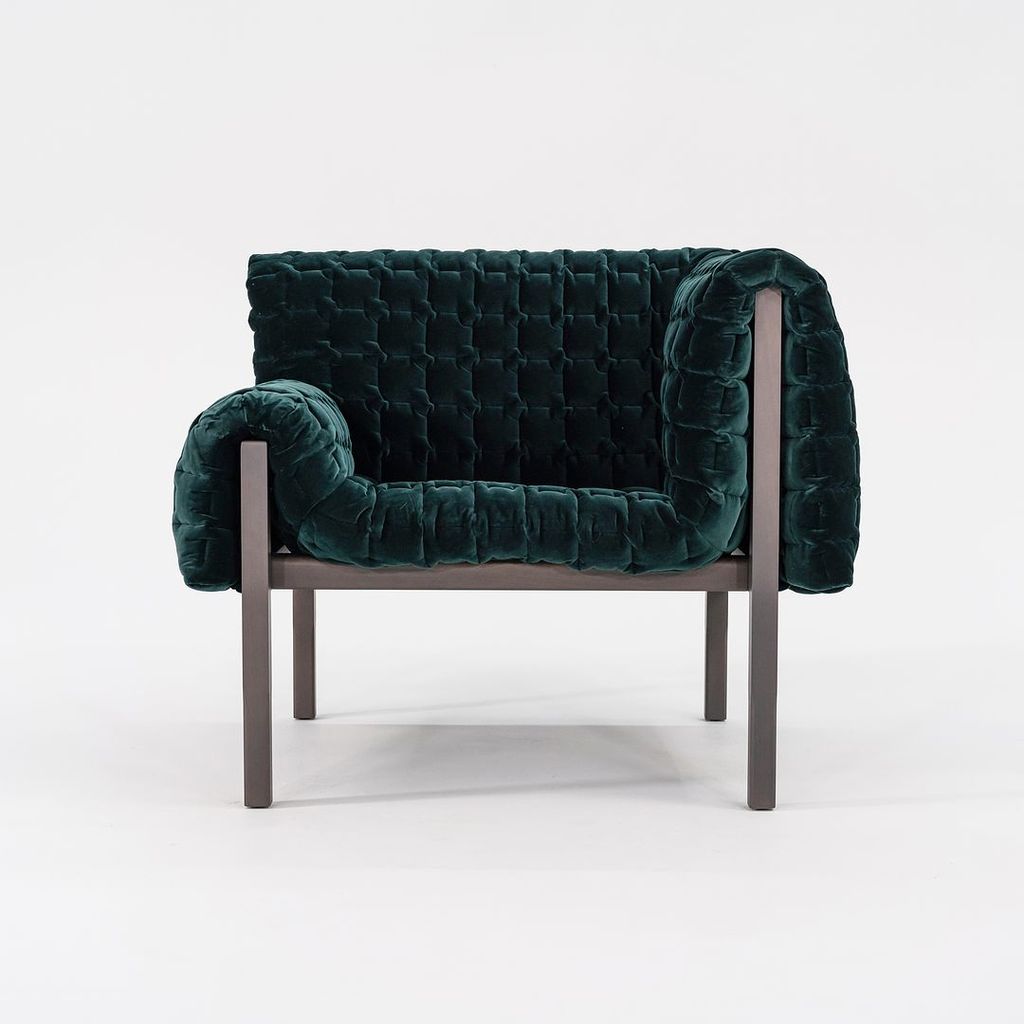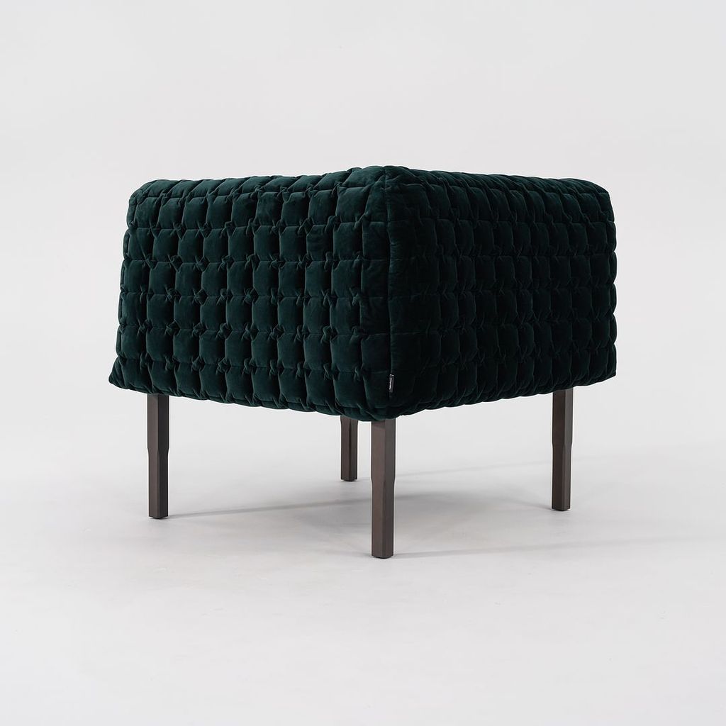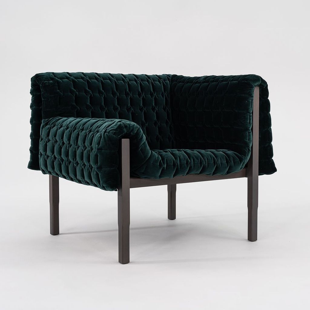 Listed for sale is a Ruche Armchair Left made of a wood base and steel frame covered in an evergreen cotton velvet fabric. The chair was designed by Inga Sempe and produced by Ligne Roset in France. It was made circa 2023 and is guaranteed as authentic. Condition is excellent. See photos. This came directly from Ligne Roset and was likely either used as a display model or was a showroom floor model.