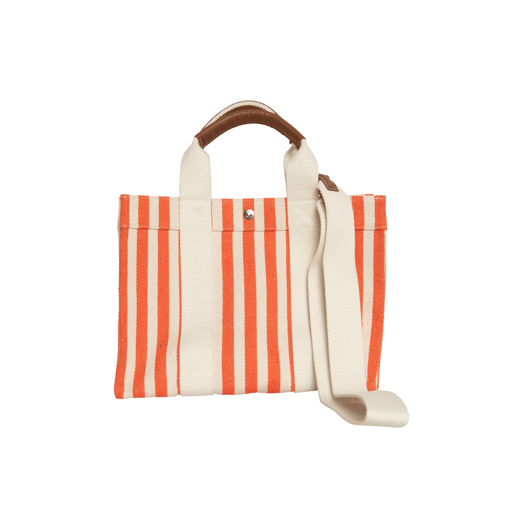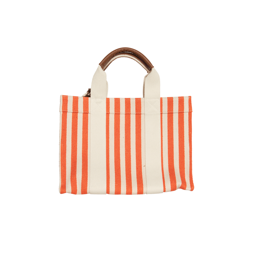 Rue De Verneuil Orange Palais Royale Tote is handcrafted with large orange and white striped and cow leather bag cuff.