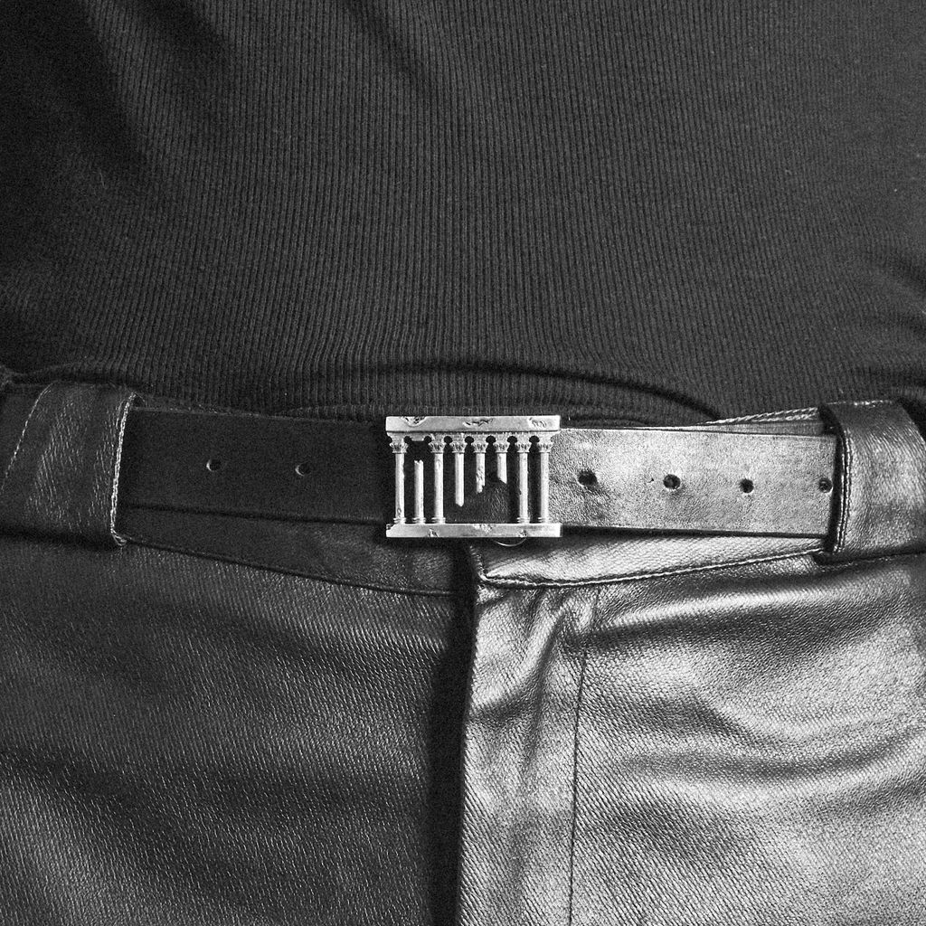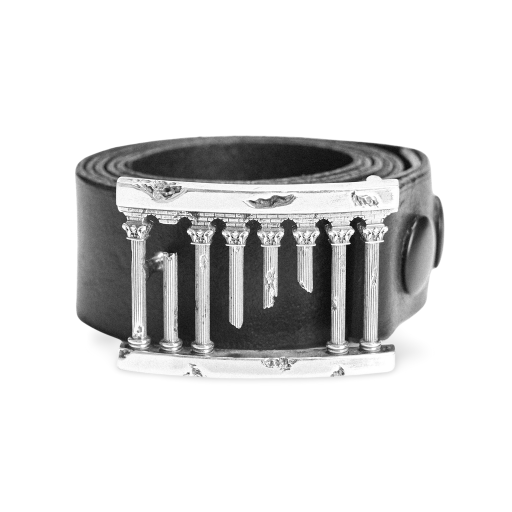 Highly wearable buckle rendered in solid Sterling Silver. Secured on a Tuscan leather strap.