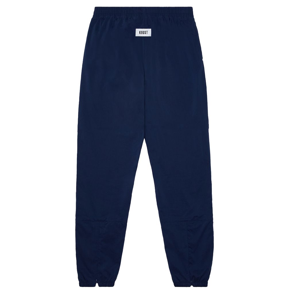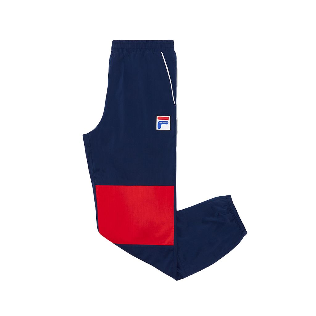 Rylan Track Pant features colored block seams on the front, double cuff construction detail, mesh lining from waist back to mid calf, exterior label at the back, and PVC patch at the front.