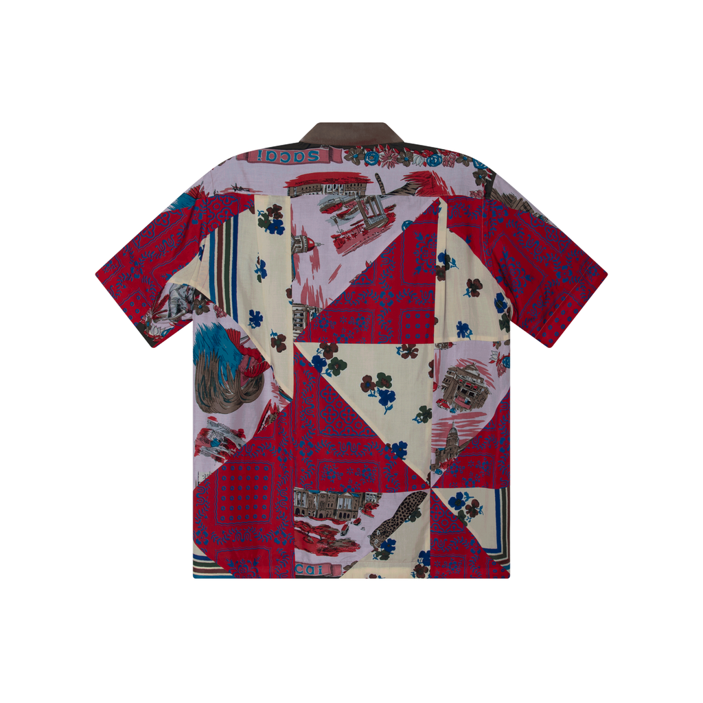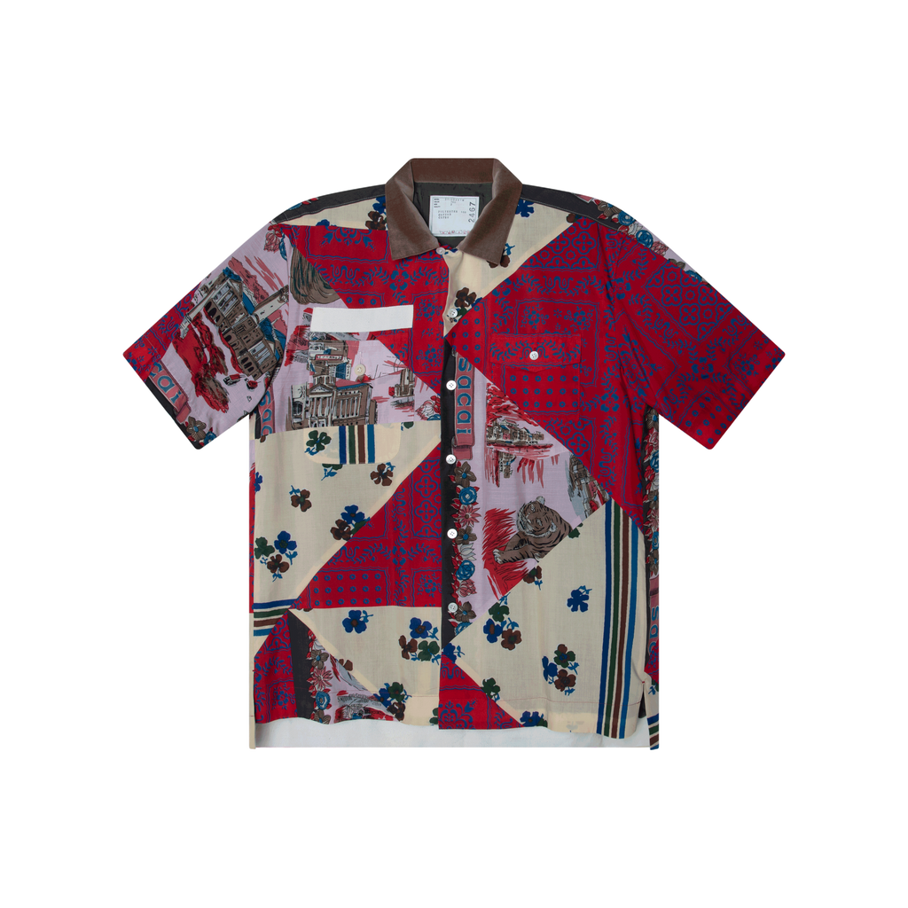 Sacai Hank Willis Thomas Edition Mix Print Archive SS Shirt features camp collar, front button closure, two front flap pockets, and multi color print all over.