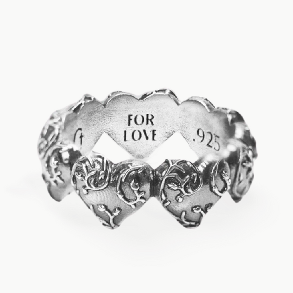 A band of Sacred Hearts envelops the finger. Intricate flowering vines adorn each heart. "For Love" engraving inside band.