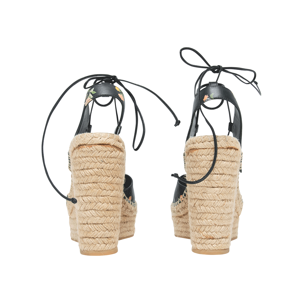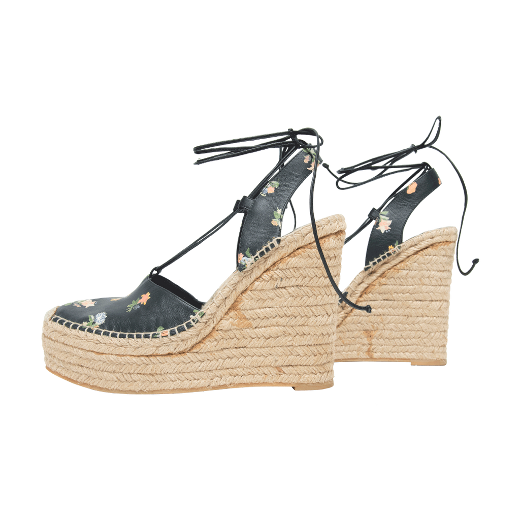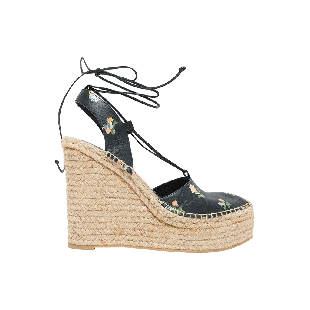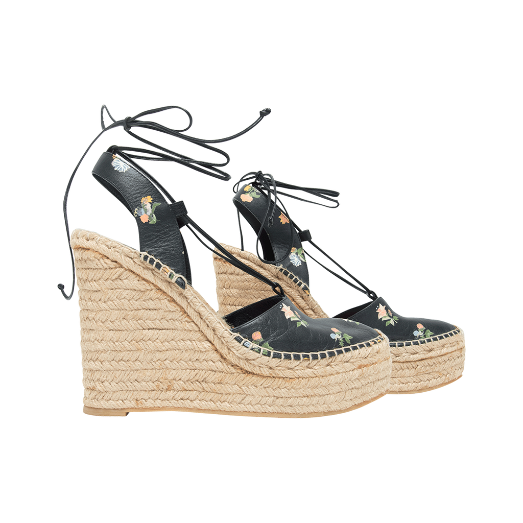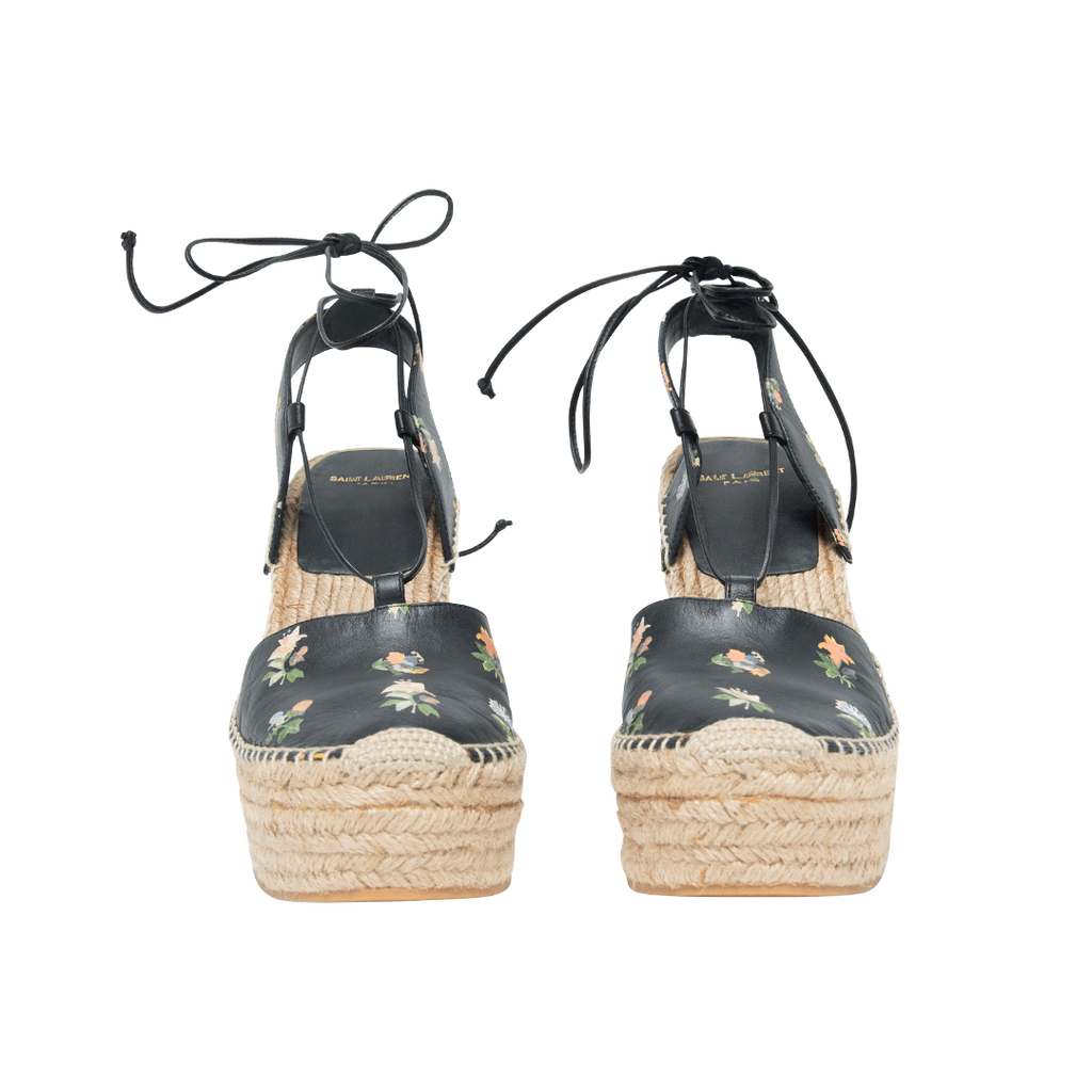 Saint Laurent Leather Floral Print Espadrilles feature wrap around strap closure, and woven design platform.