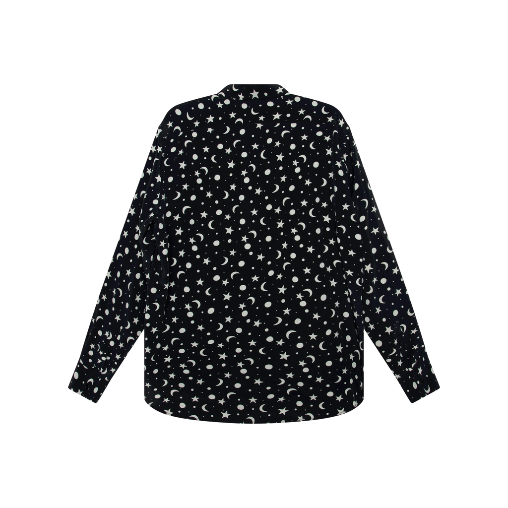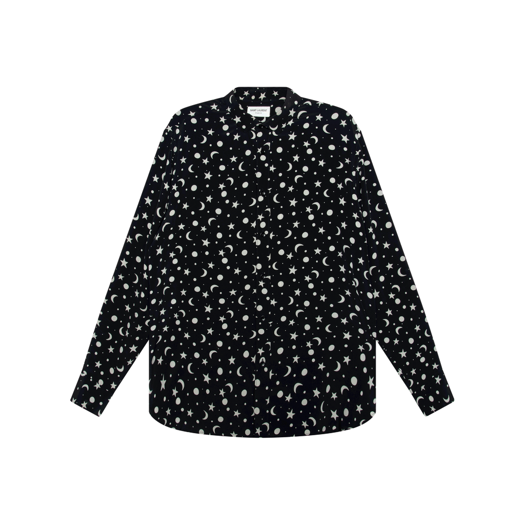 Saint Laurent Silk Galaxy Button Up features front button closure, 100% silk, moon and stars galaxy print.