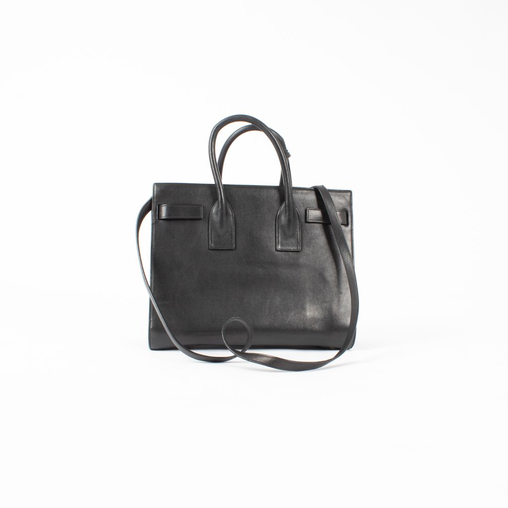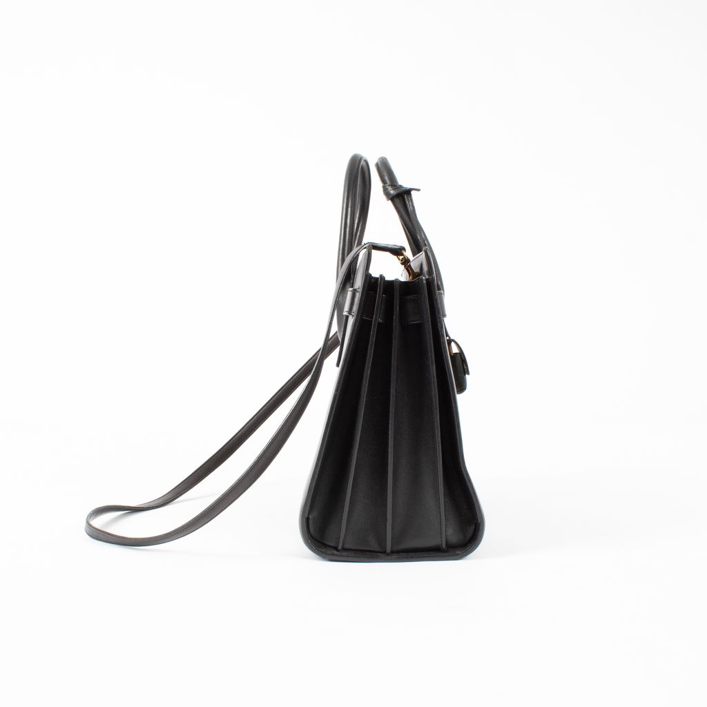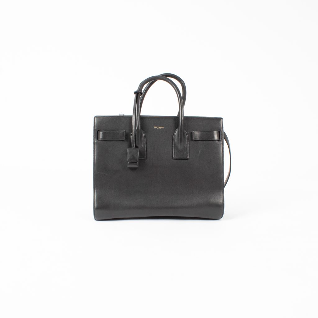 One of the most recognizable designs from the Saint Laurent line of handbags, the Sac du Jour is a fantastic everyday bag that looks sleek and feels chic. Features leather fabrication, accordion pleated sides, removable shoulder/crossbody strap, standing pegs on bottom, gold embossed Saint Laurent logo on front, and hangtag on handle.