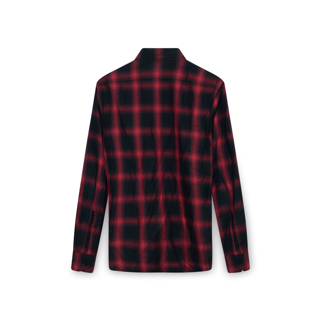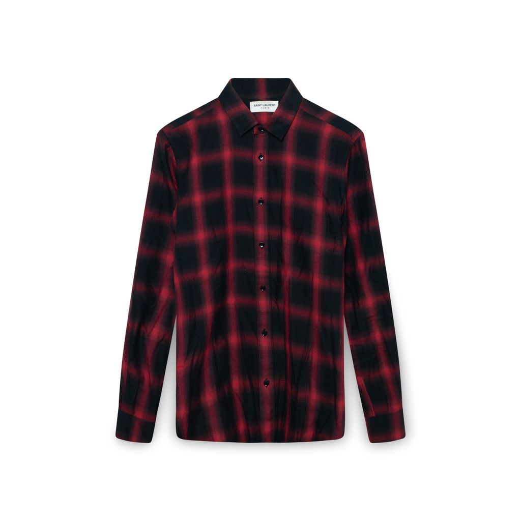 Saint Laurent Yves Collar Red & Black Plaid Shirt feature front button closure, all over plaid print, and button closure cuffs