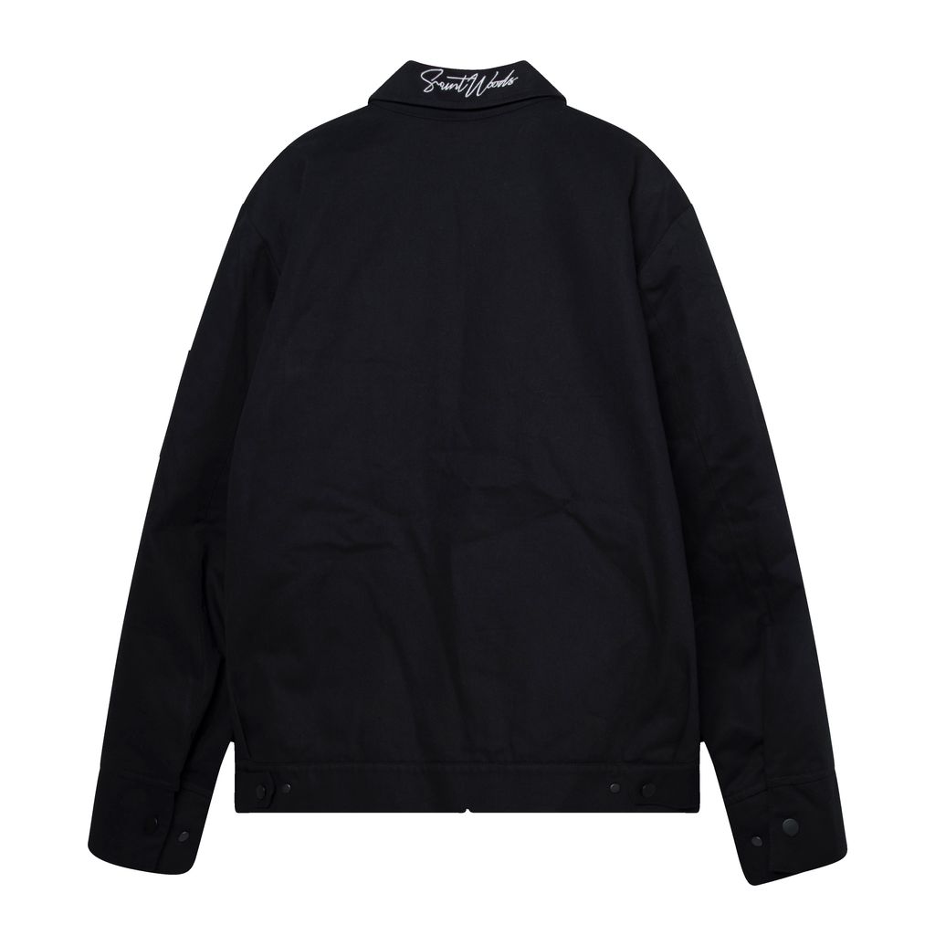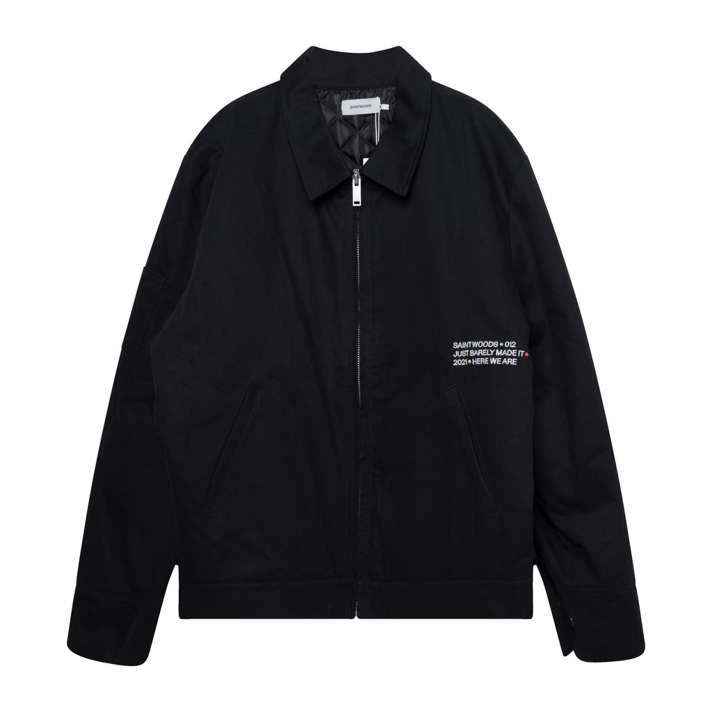 Saintwoods "Barely Made It" Ricky jacket in black features dual pockets, zipper, and text at the chest.