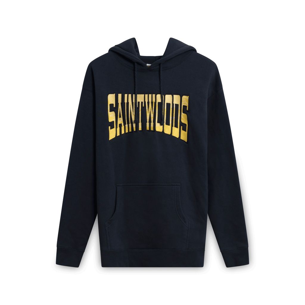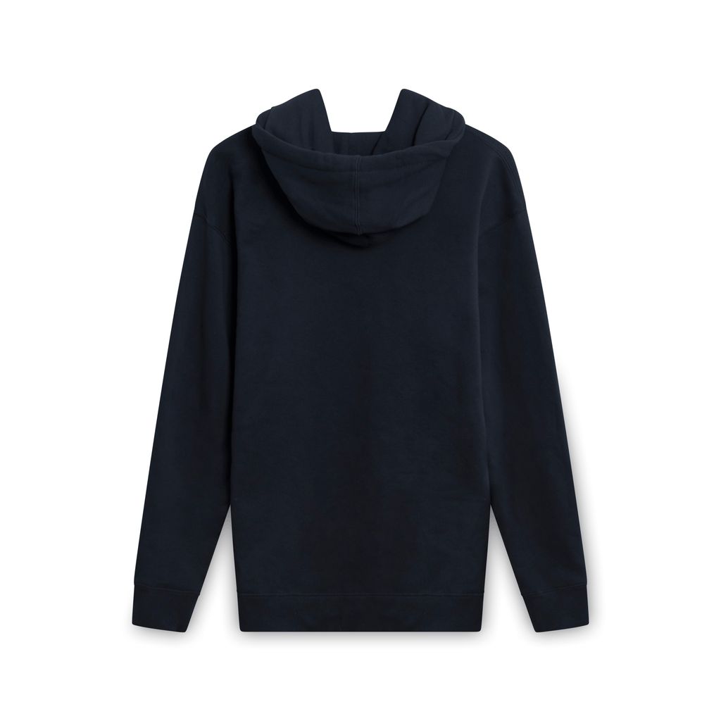 Long sleeve cotton-blend fleece hoodie in navy. Drawstring at hood. Logo embroidered in yellow and black at front. Kangaroo pocket at waist.