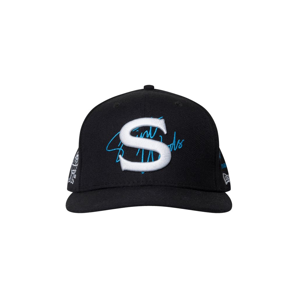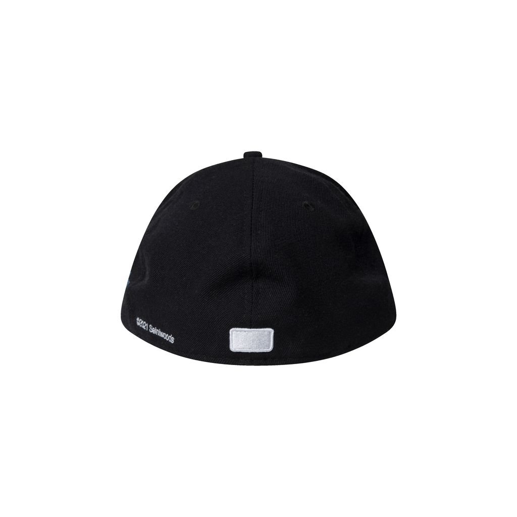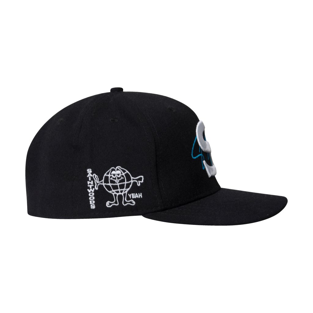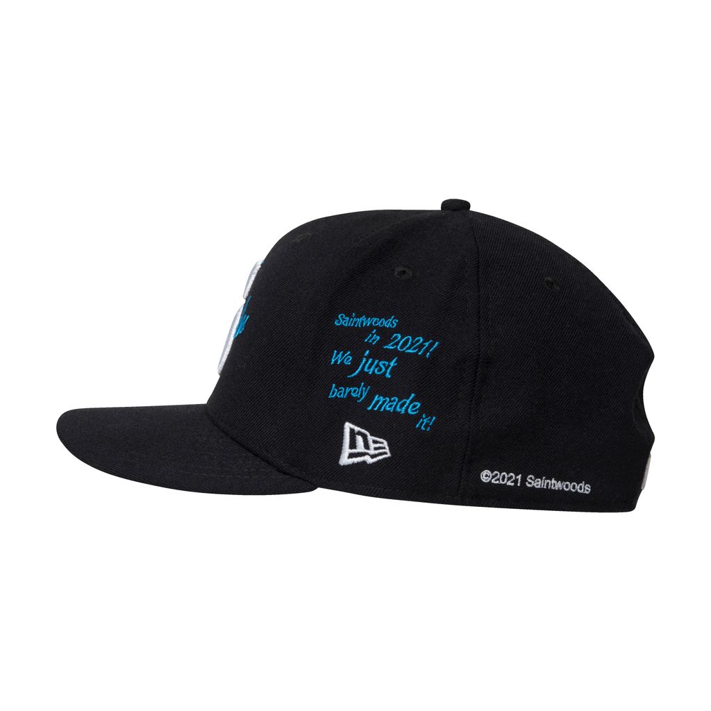 Saintwoods x New Era Edition Fitted 59Fifty Cap features wool twill in black and logo graphics embroidered in blue and white throughout.