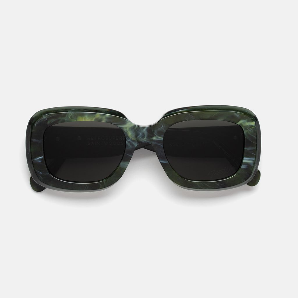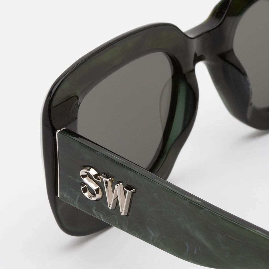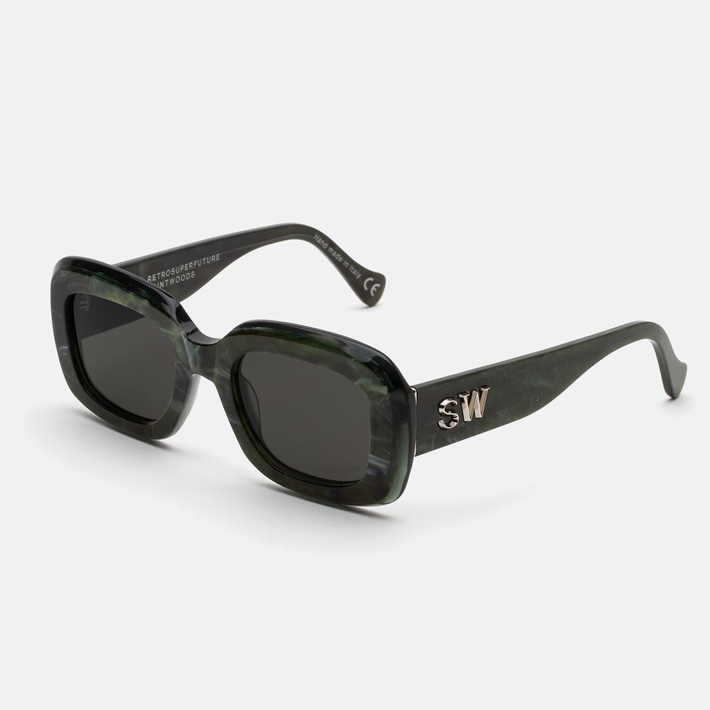 RSF Sunglasses are designed for an exclusive collaboration with Montreal-based lifestyle brand Saintwoods. This model celebrates an authentic approach to contemporary style. Virgo is a playful and oversized silhouette characterized by carefully sculpted rims with an oblique finish around the lenses. It captures the essence of the 90s vibes, with its chunky and curvy profile and wide lens. The model is elevated with bold Saintwoods 'SW' metal decors on the temples, elevating the design with distinctive sculptural detailing. This version comes in an eclectic green tortoise acetate with black lenses and silver metal detailing. Handmade in Italy.