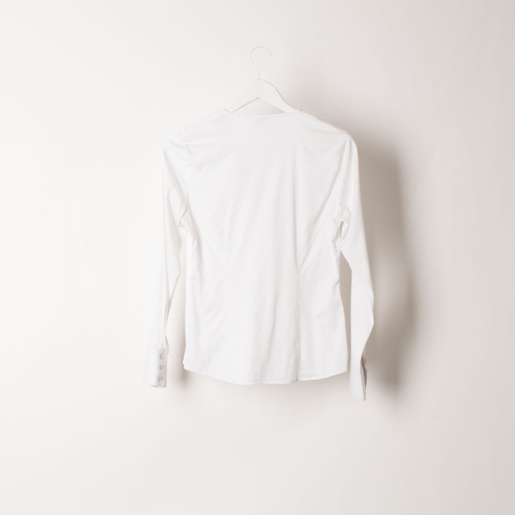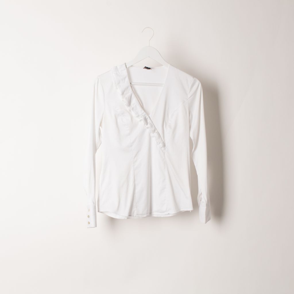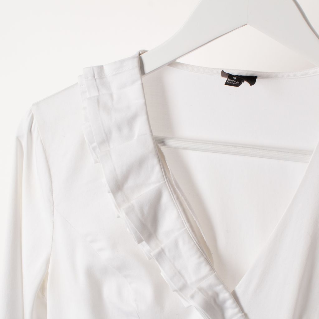 Gently worn, Saks Fifth Avenue ruffle style top. 100% cotton featuring a v-neck opening front and concealed side zip.