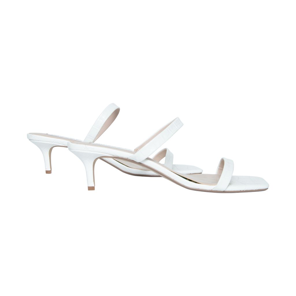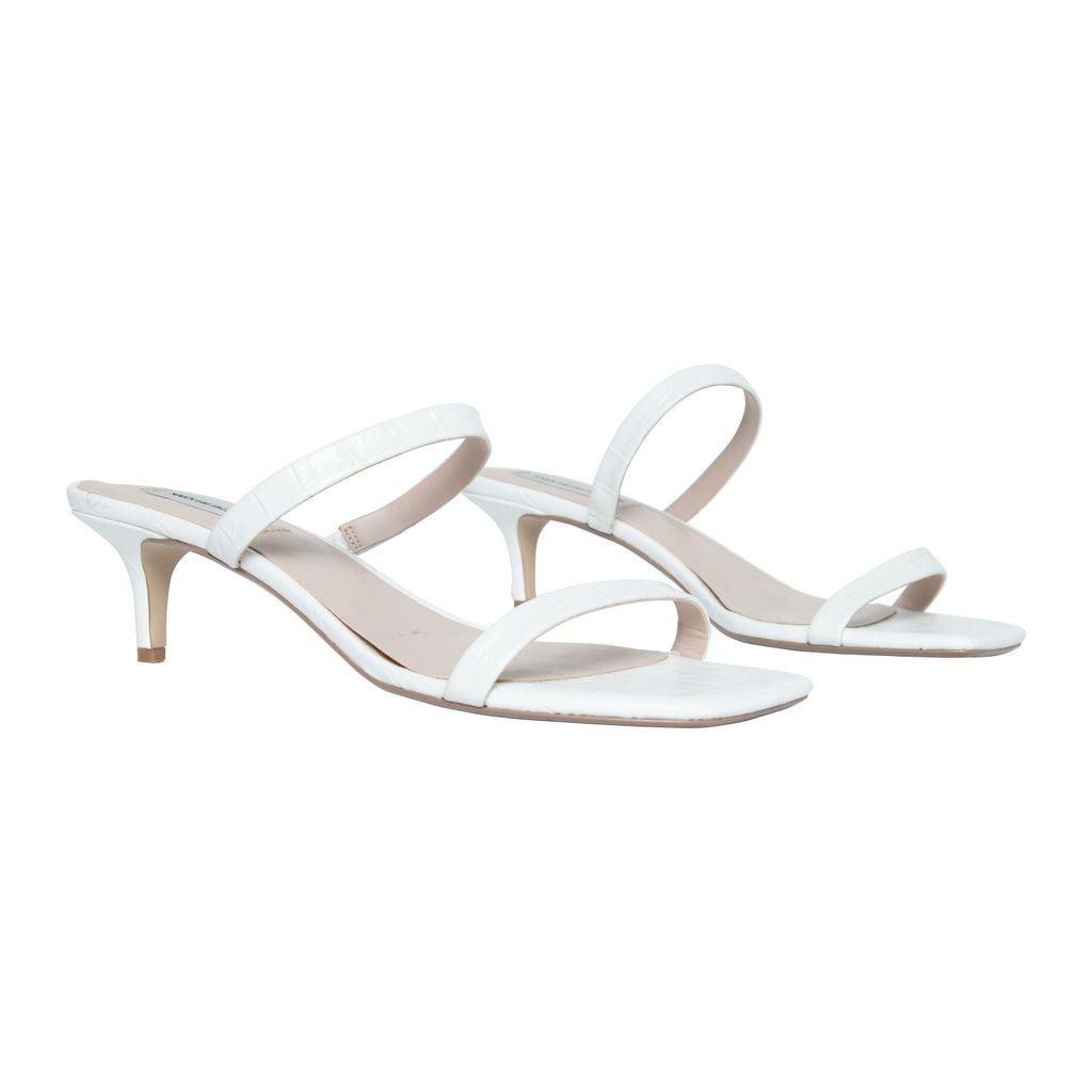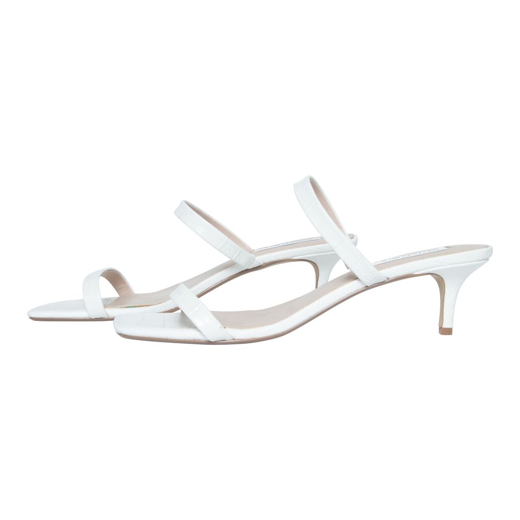 Saks Fifth Avenue sandals features, square toes, embossed leather throughout, and two thin straps at upper.