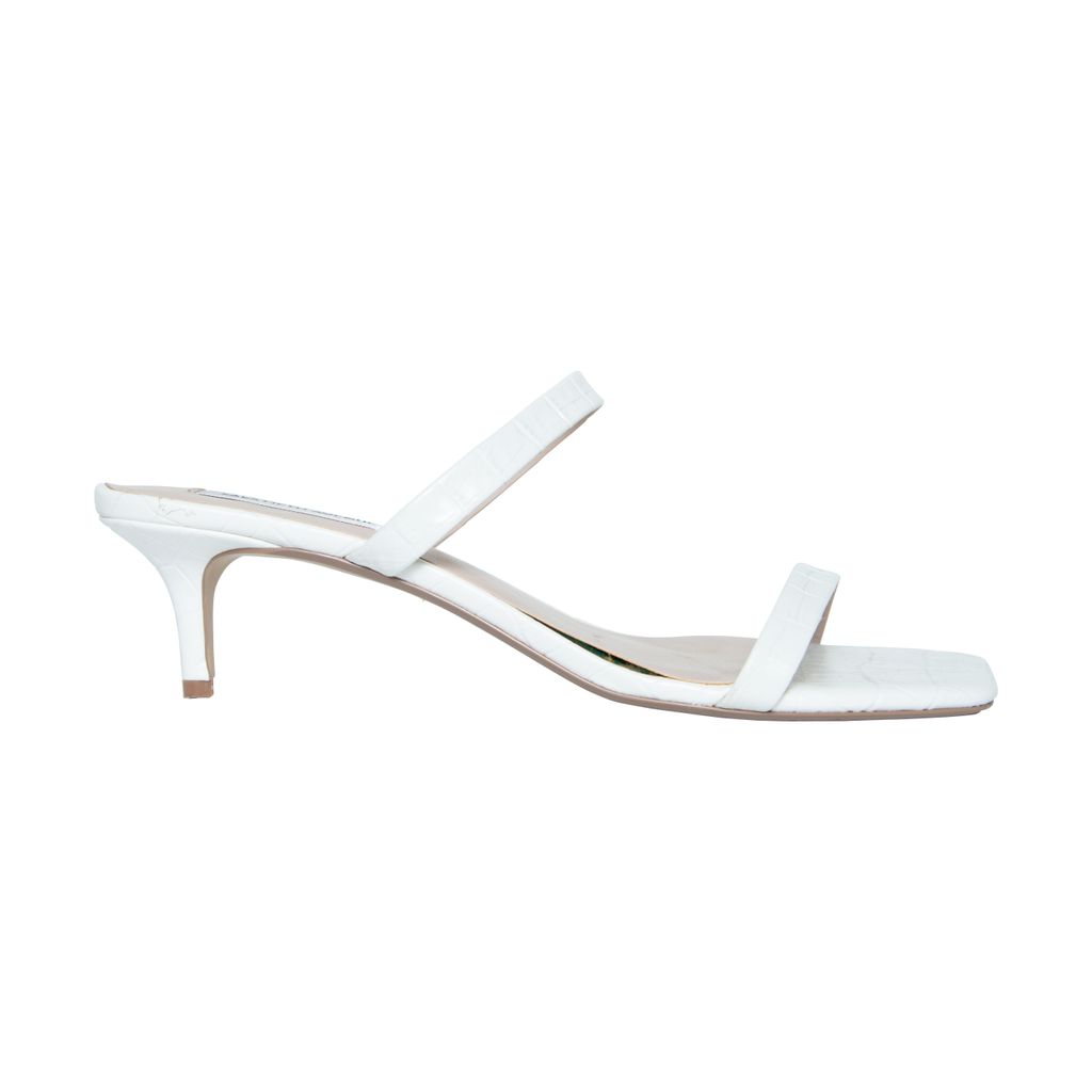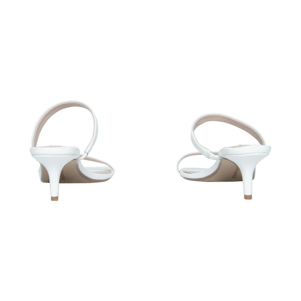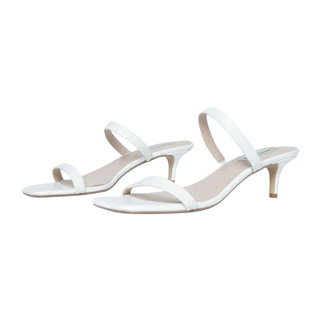 Saks Fifth Avenue sandals features, square toes, embossed leather throughout, and two thin straps at upper.