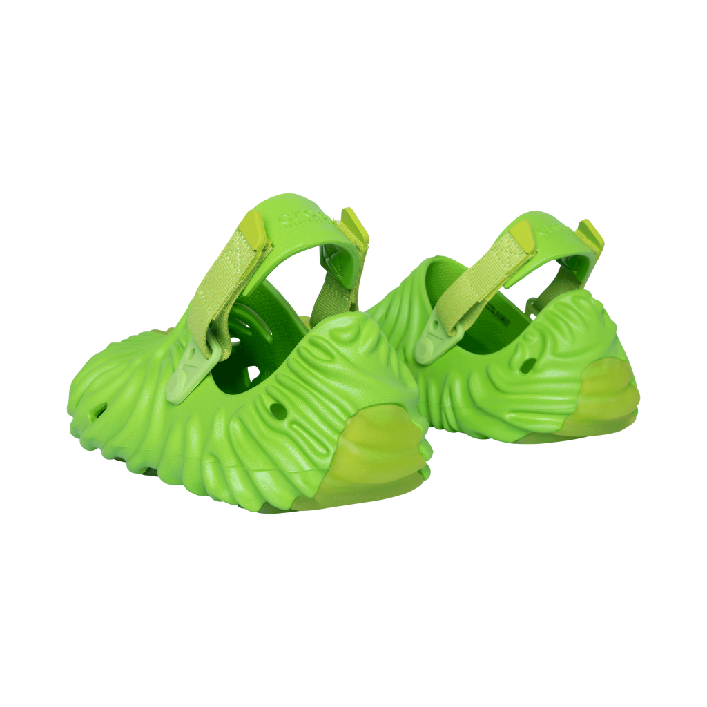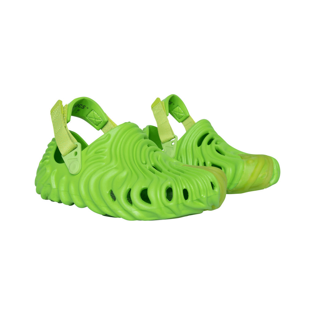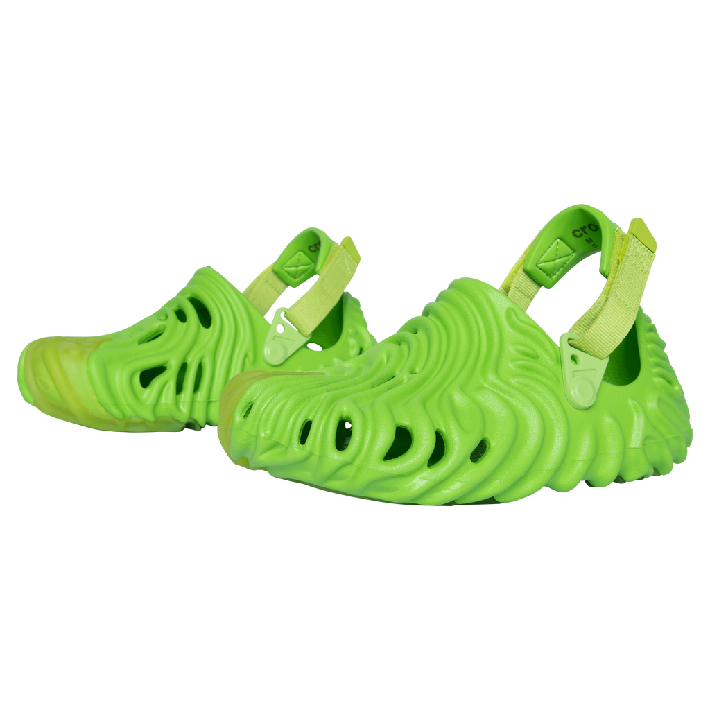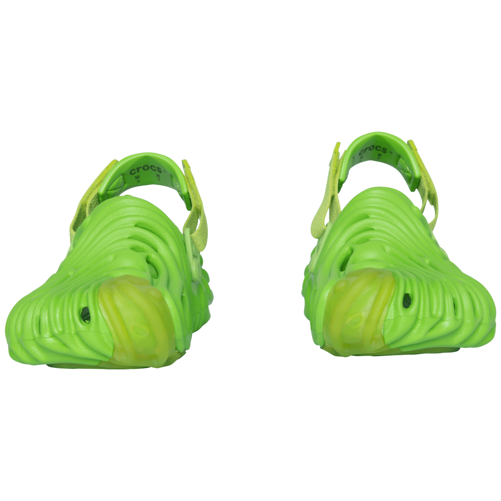 Salehe Bembury x Crocs Pollex Crocodile Clogs features exo-skeletal styled construction with dramatic, fingerprint-like concave ridges, ventilation holes, and removable canvas strap at ankle.