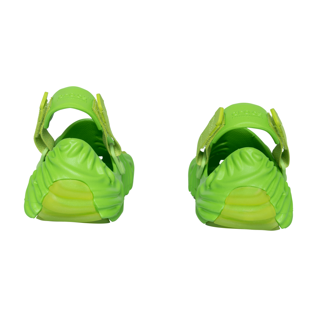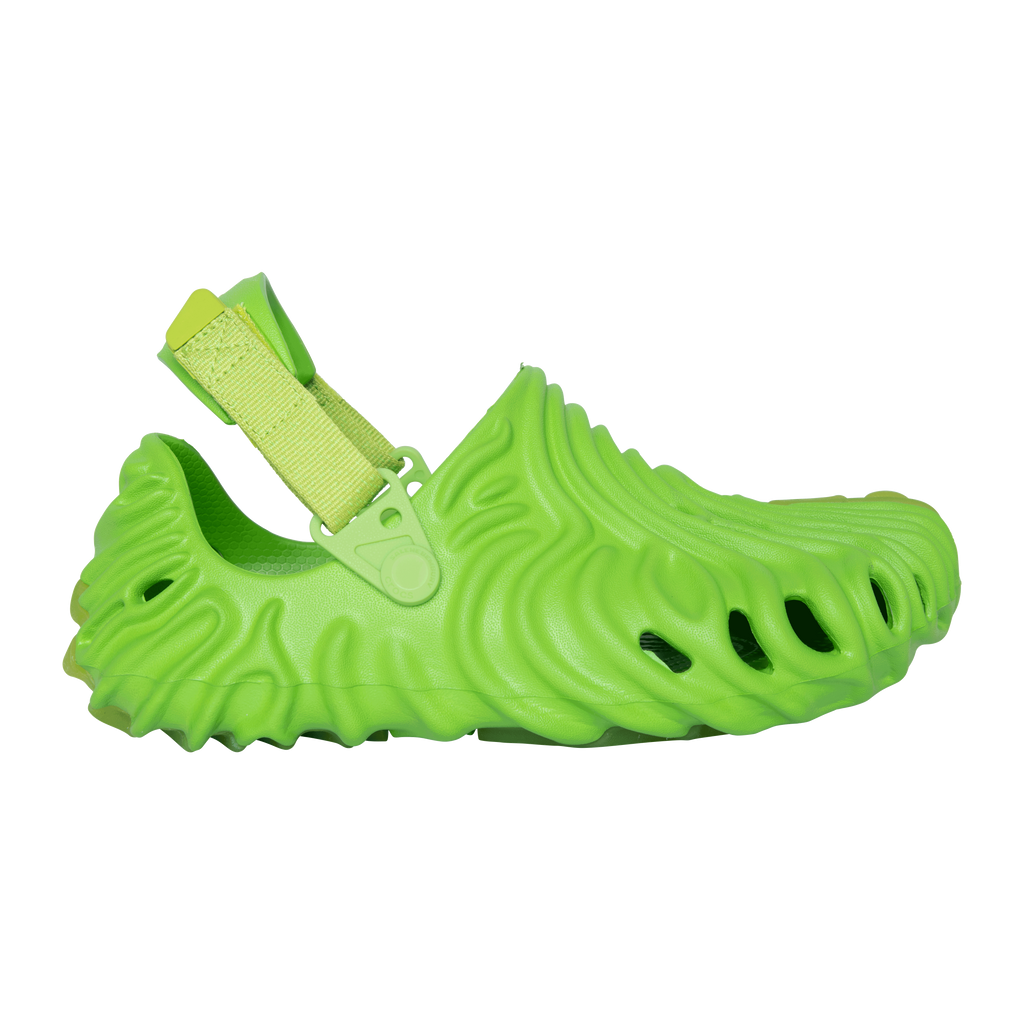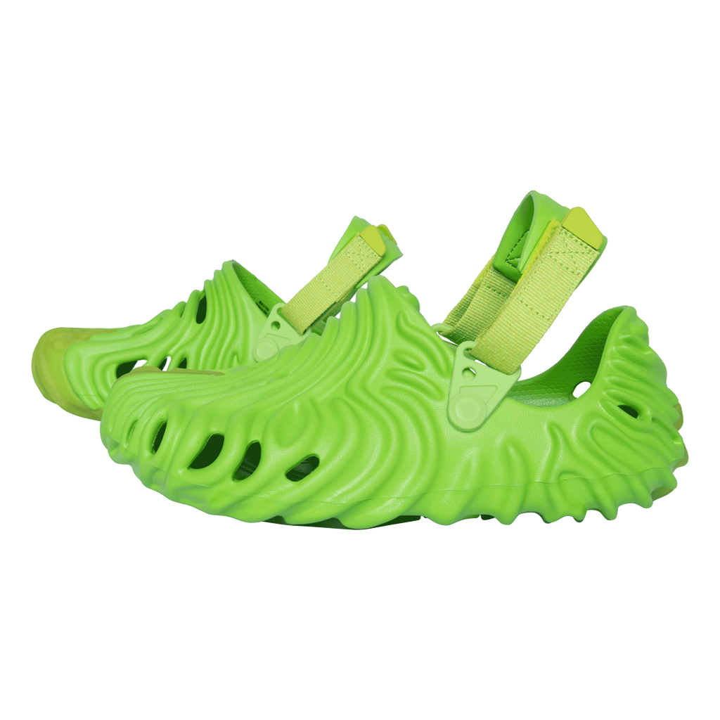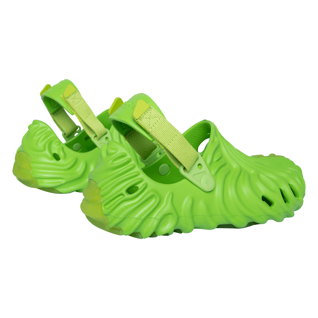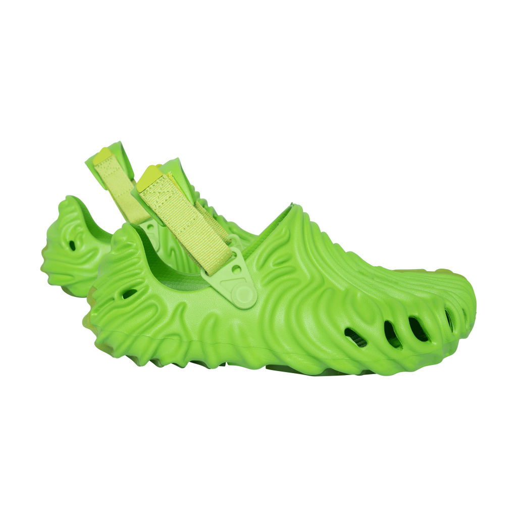 Salehe Bembury x Crocs Pollex Crocodile Clogs features exo-skeletal styled construction with dramatic, fingerprint-like concave ridges, ventilation holes, and removable canvas strap at ankle.