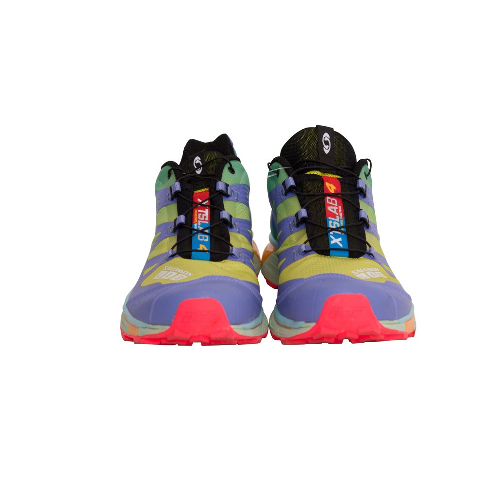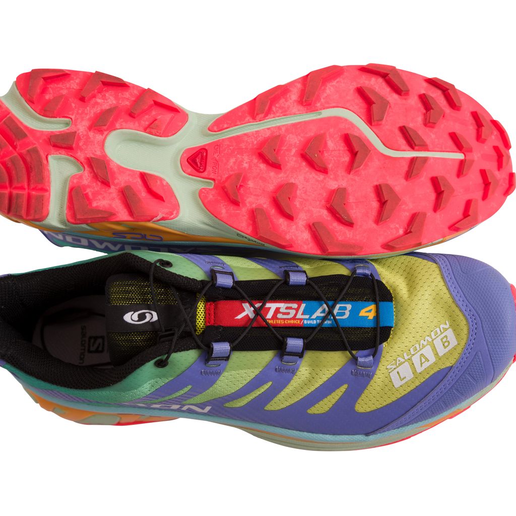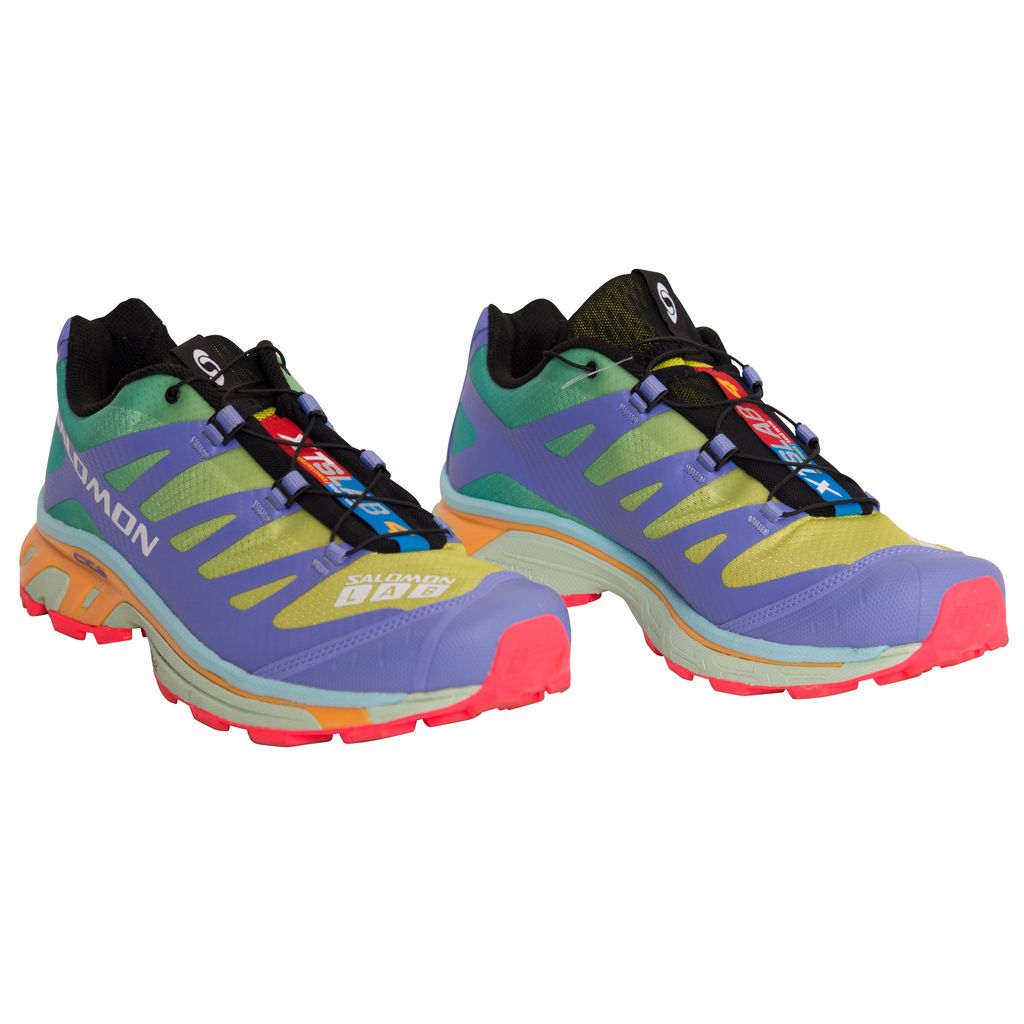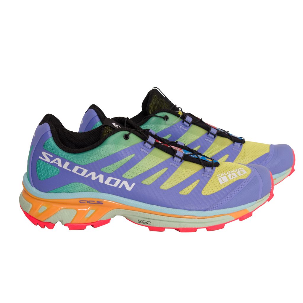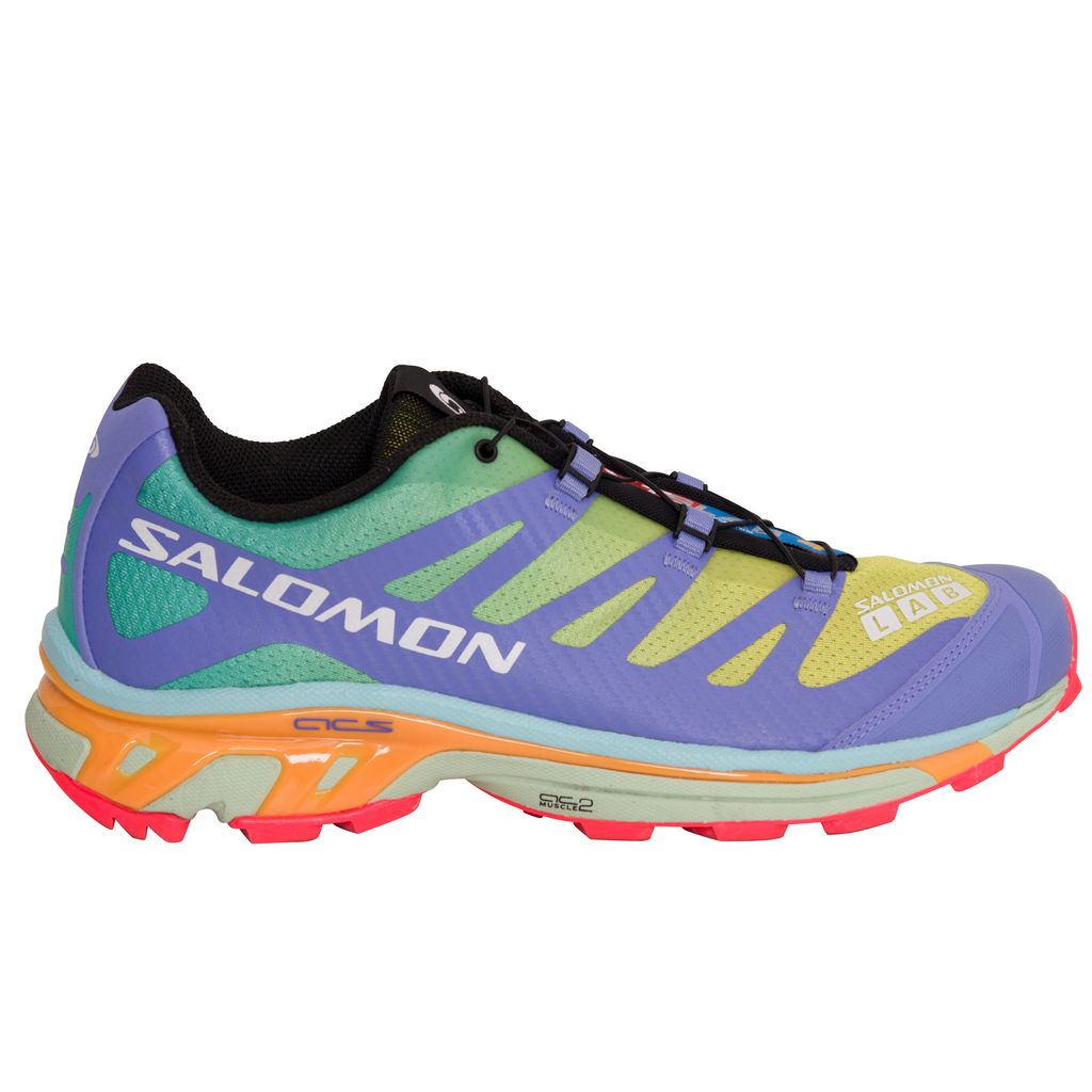 Salomon XT-4 'Evening Primrose/Mint Leaf/Lolite' features intarsia knit, logo print on side, logo patch at the tongue, almond toe, front lace-up, branded insole, and chunky rubber sole.