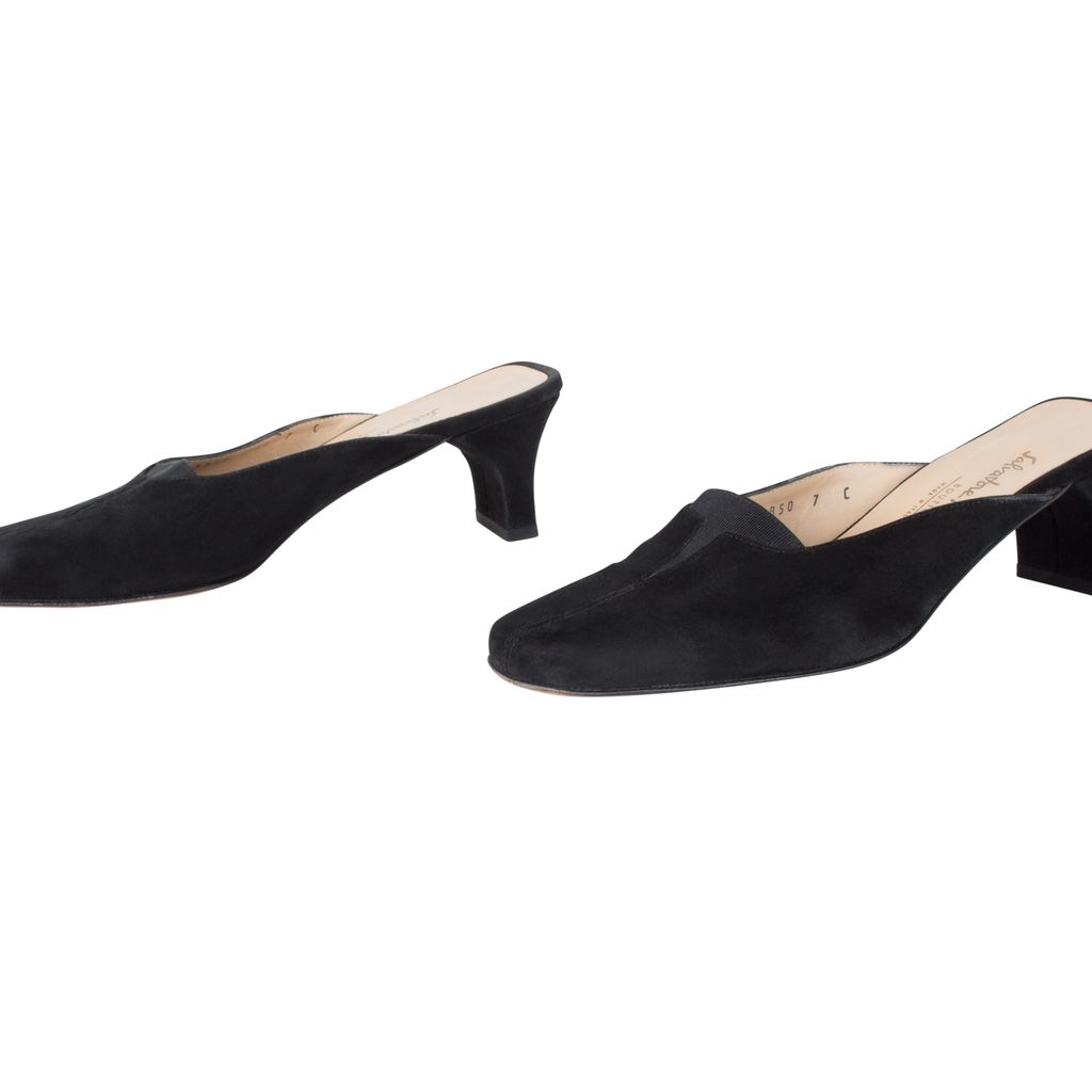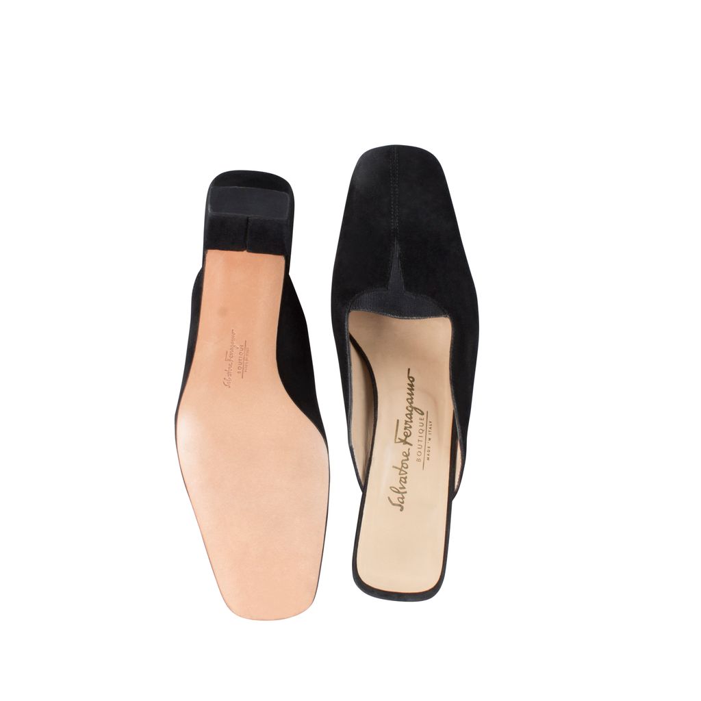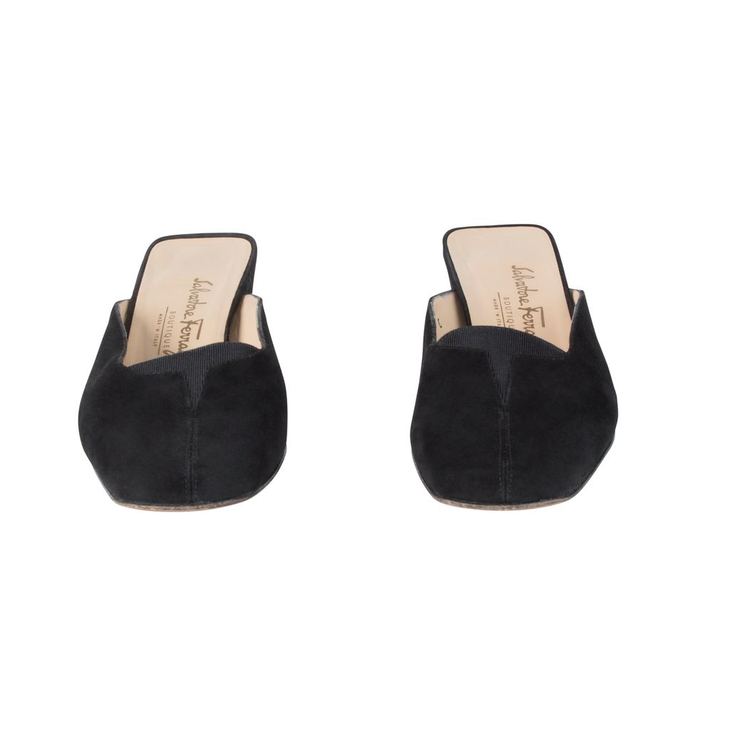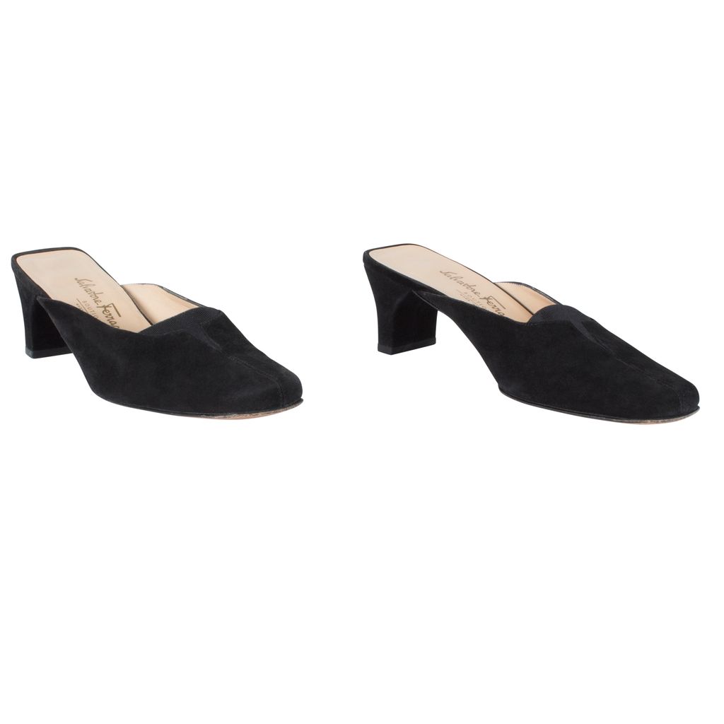These Ferragamo Velvet mules feature a leather sole and a black velvet outer. They have a skinny block heel and round toe. Gently worn, marks and scuffs as pictured.