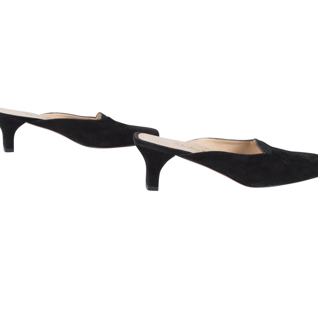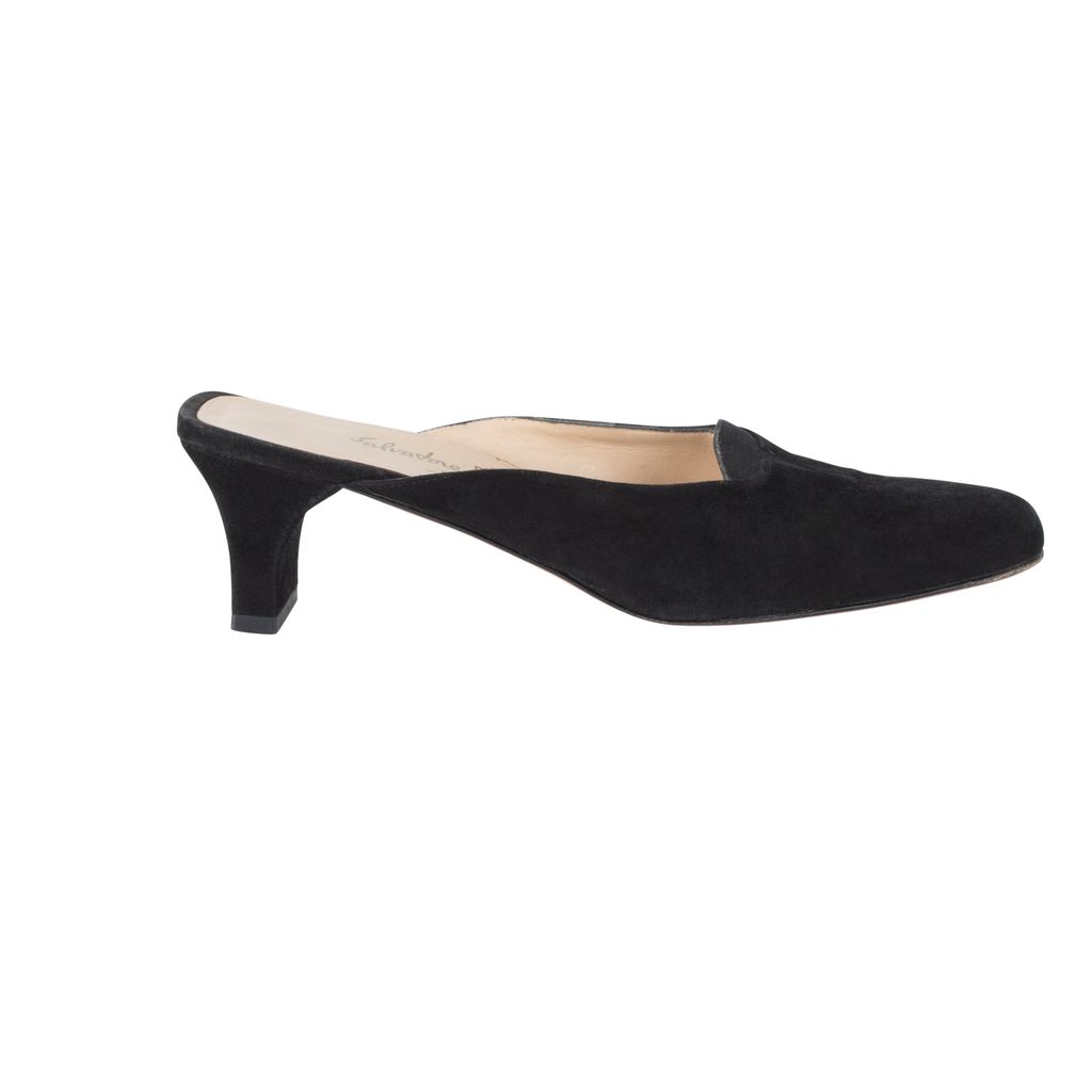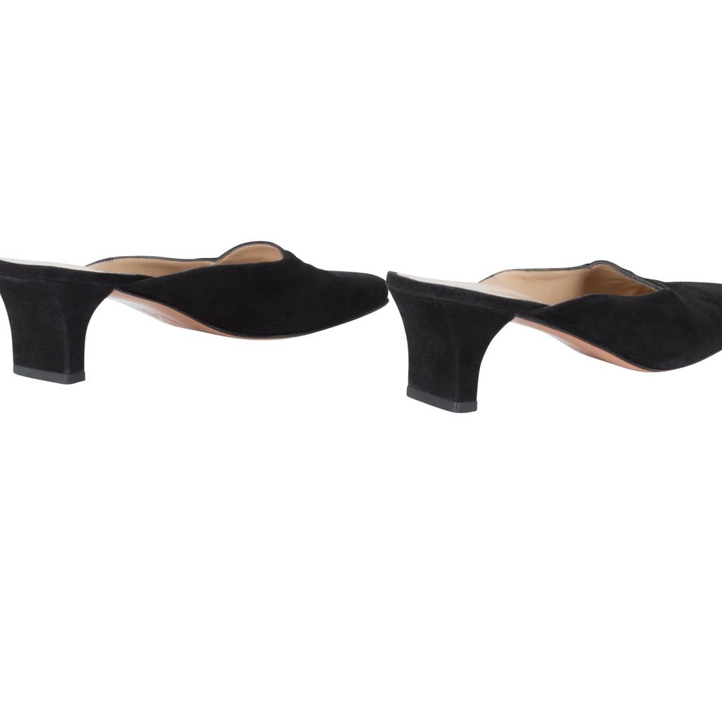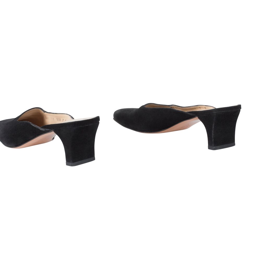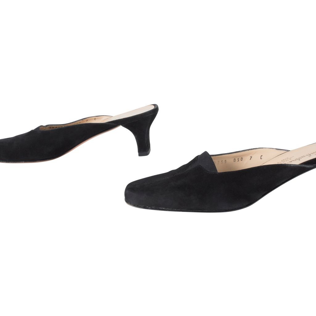 These Ferragamo Velvet mules feature a leather sole and a black velvet outer. They have a skinny block heel and round toe. Gently worn, marks and scuffs as pictured.