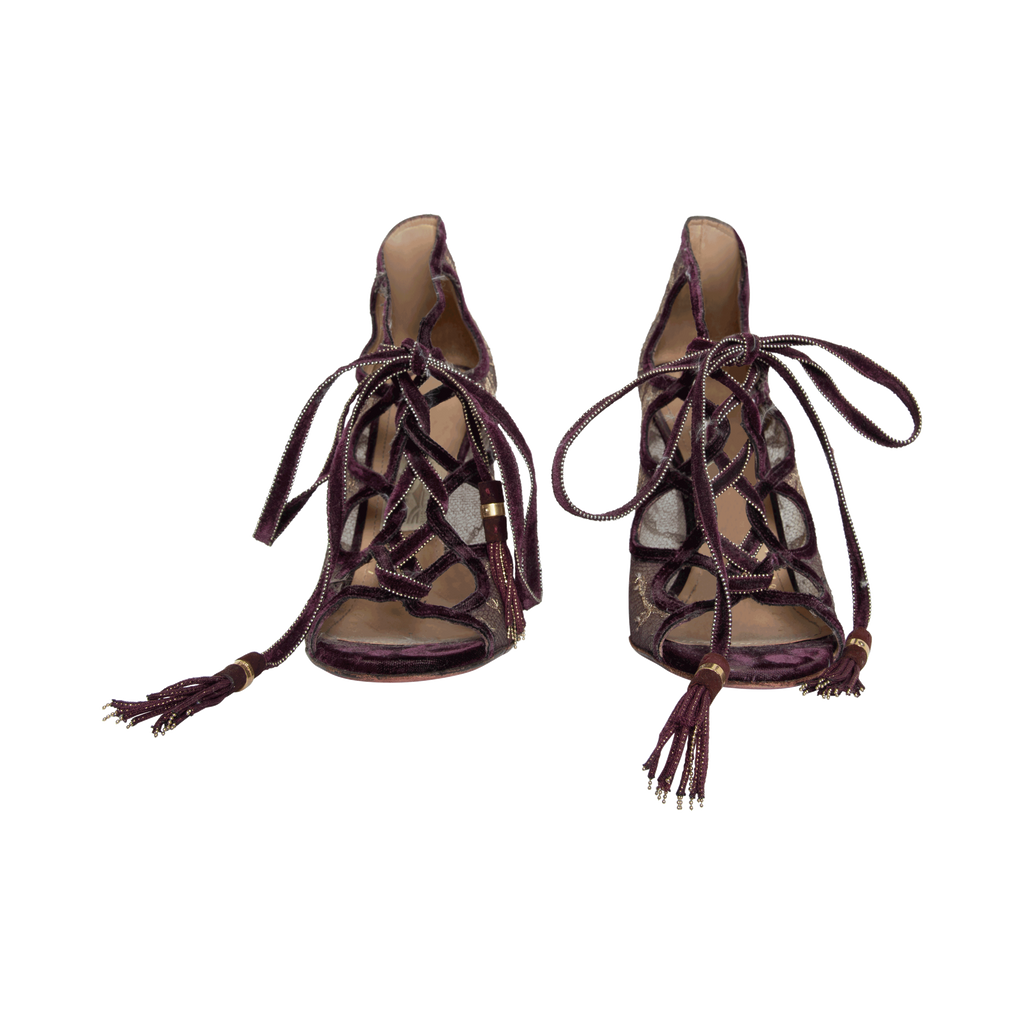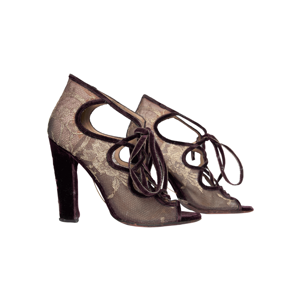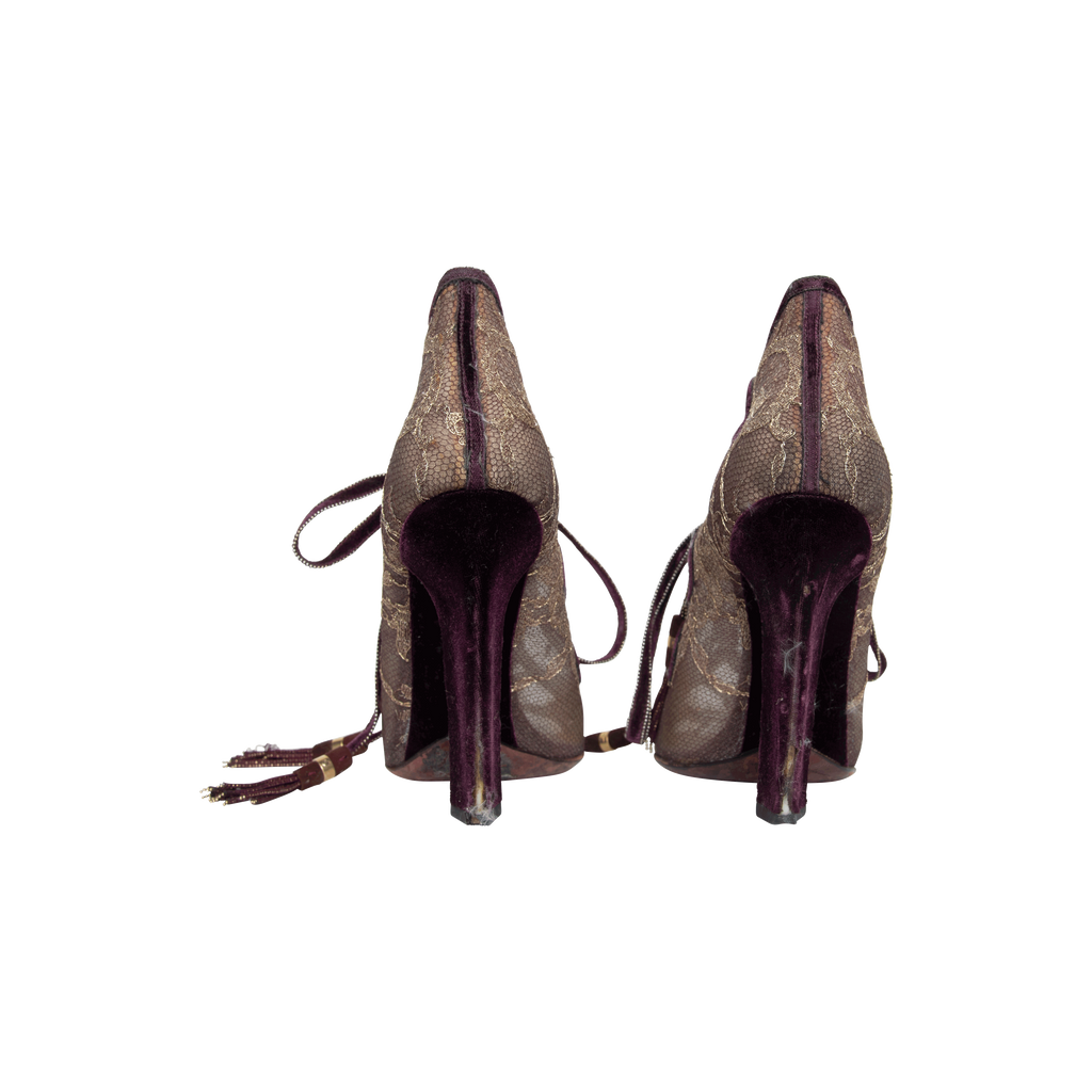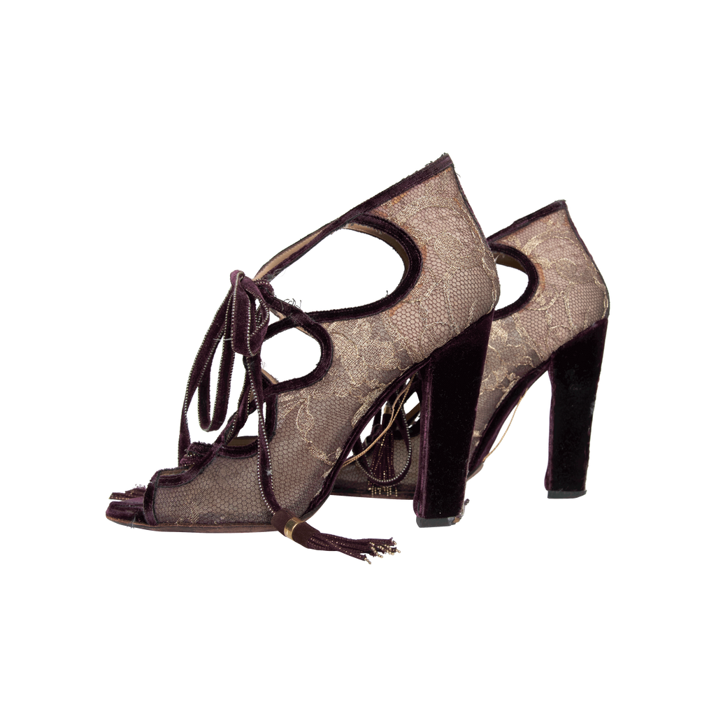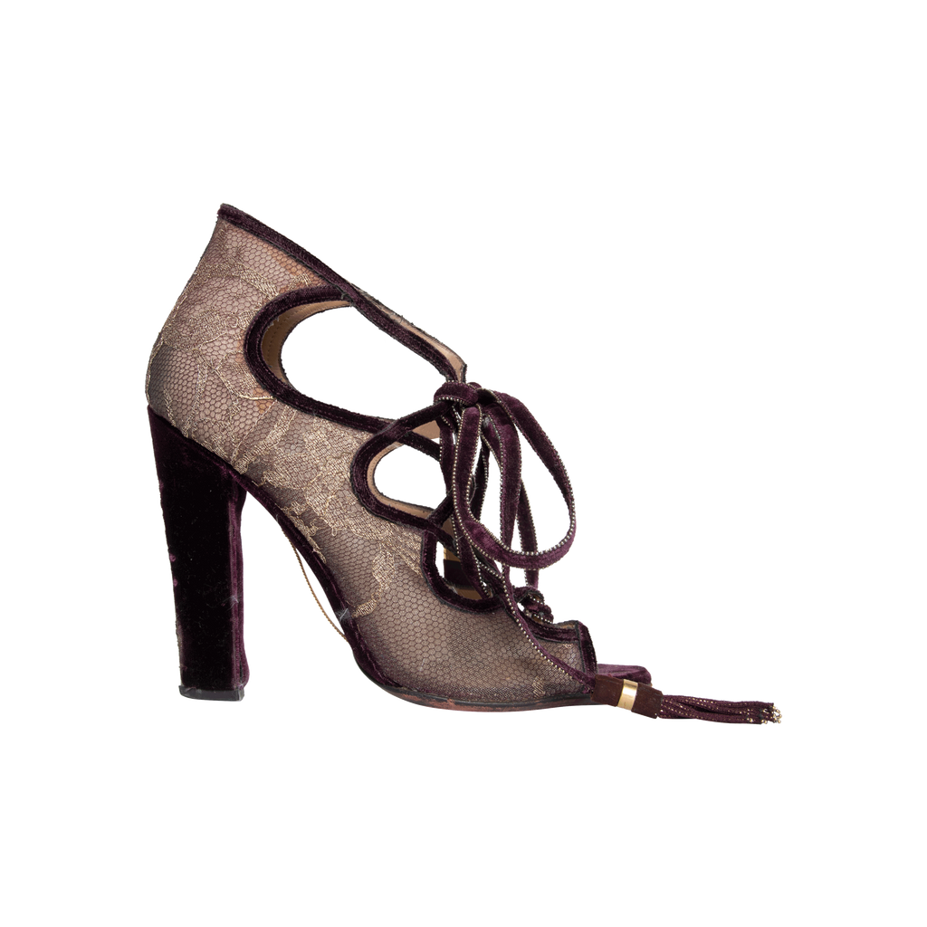 Salvatore Ferragamo Tokara Lace Pumps features open toe, gold lace detailing on sides, velvet front tie closure with tassels, and velvet block heel.