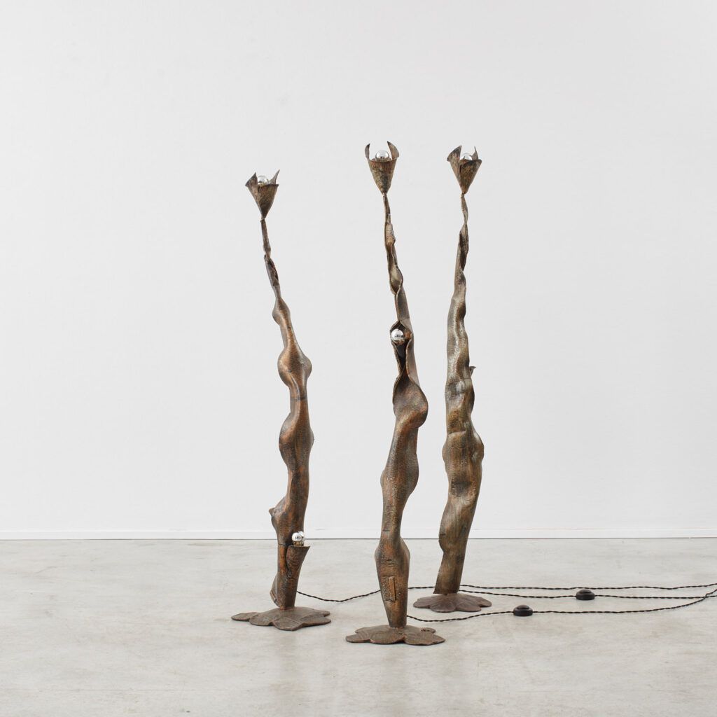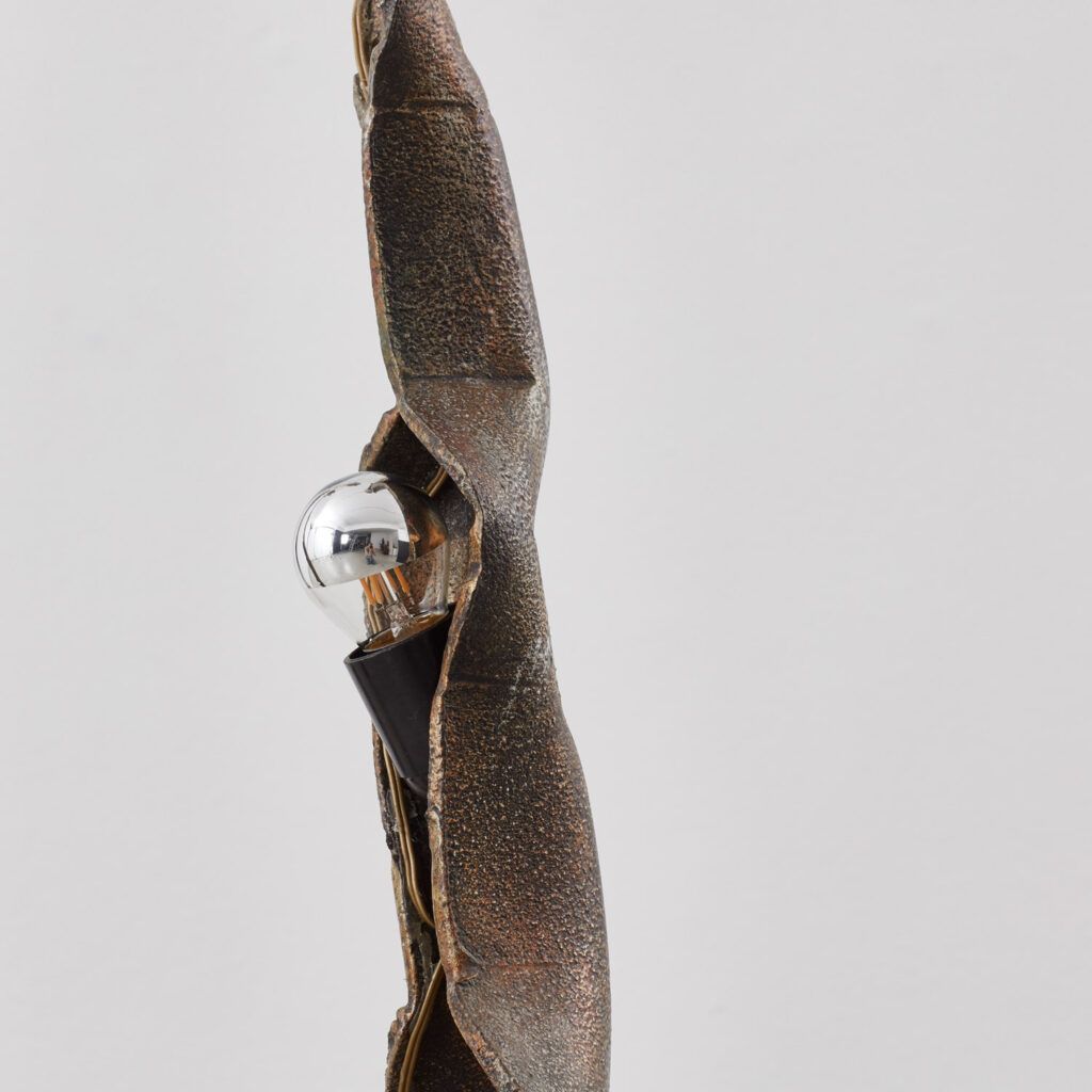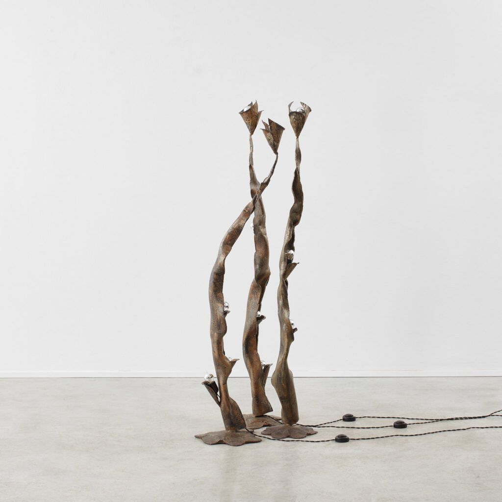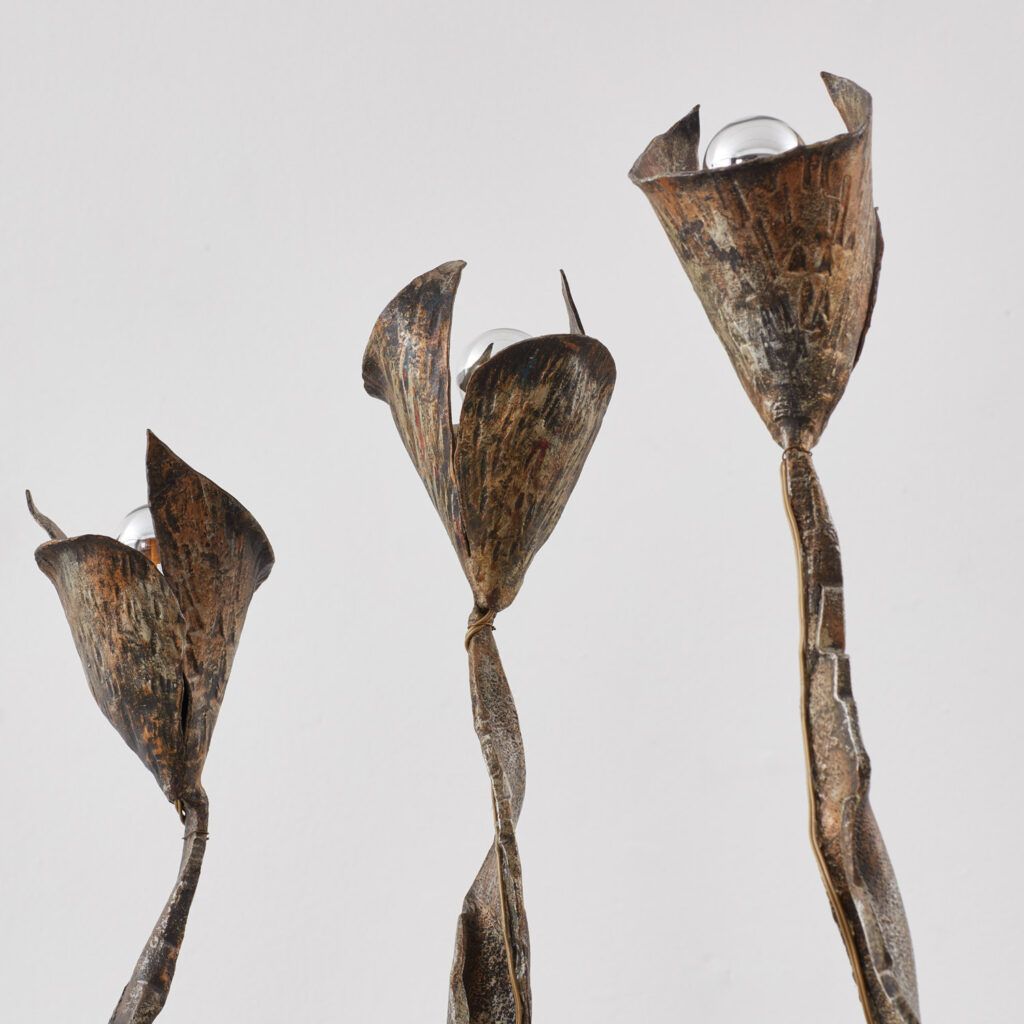 One of a unique trio produced by Marsura in the 1970s, this metal floor lamp marries an almost Art Nouveau sensuality of form with experimental metalwork techniques. Bulbs emerge from a sinuous stem that rises from a puddle-like base, twisting to sheath a final bulb in metal ‘petals’. The surface of the metal is beautifully patinated and carries an engraved signature by the artist.