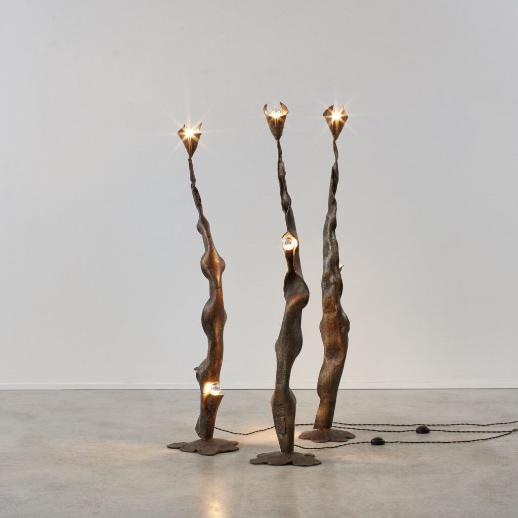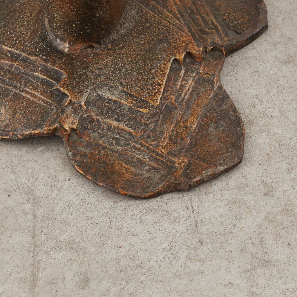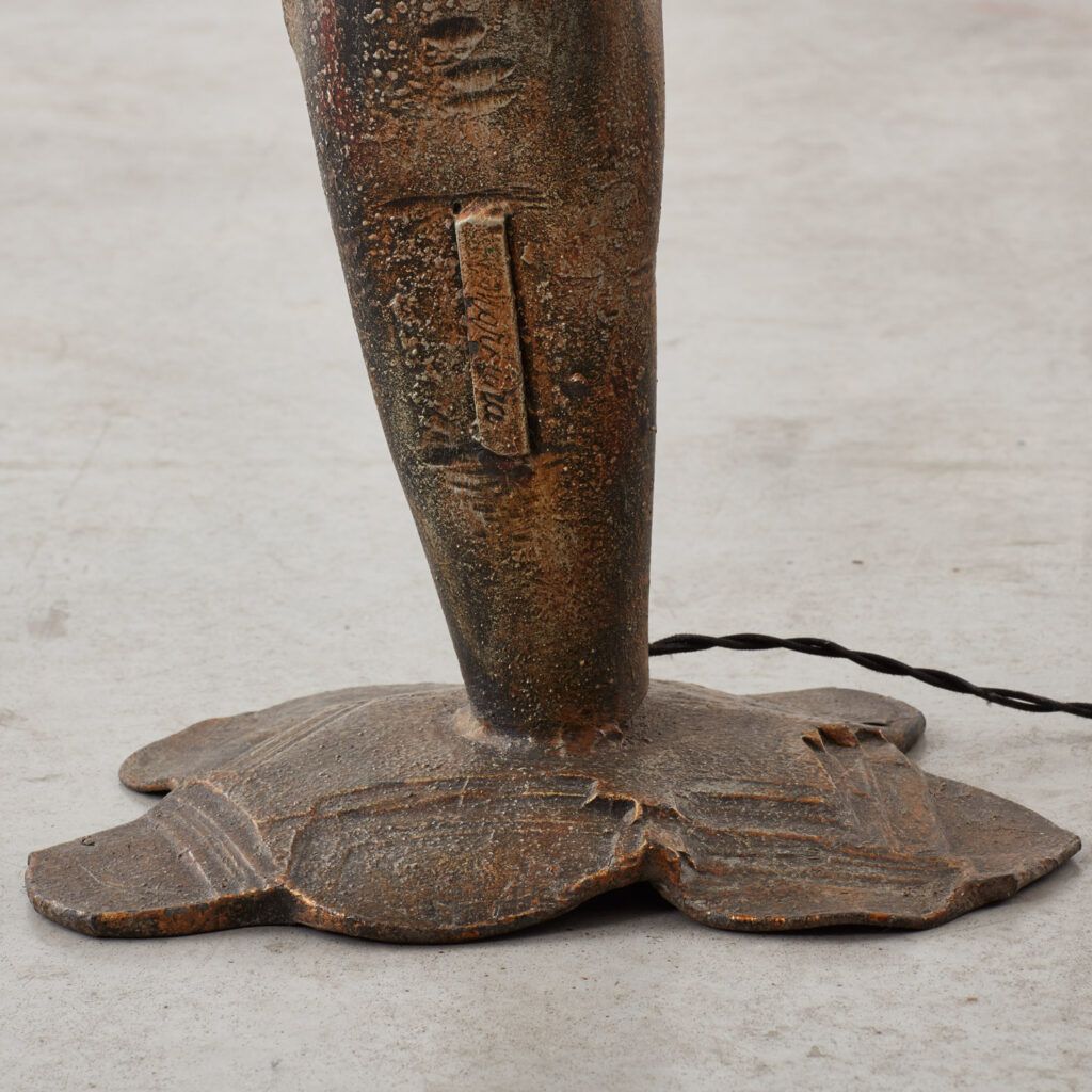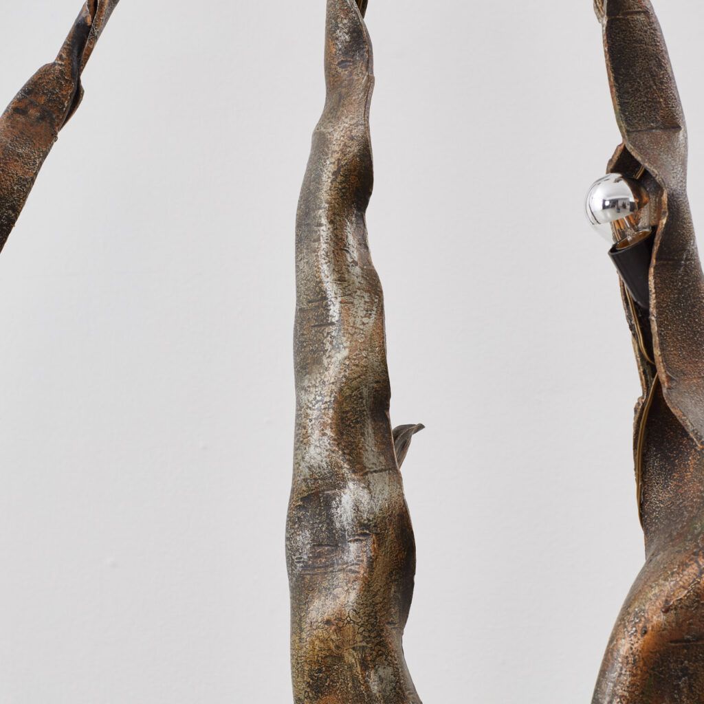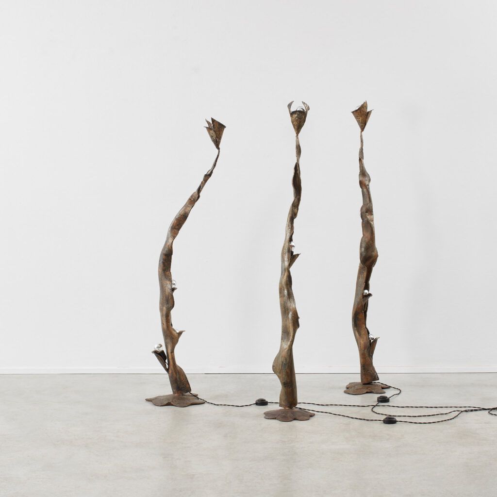 One of a unique trio produced by Marsura in the 1970s, this metal floor lamp marries an almost Art Nouveau sensuality of form with experimental metalwork techniques. Bulbs emerge from a sinuous stem that rises from a puddle-like base, twisting to sheath a final bulb in metal ‘petals’. The surface of the metal is beautifully patinated and carries an engraved signature by the artist.