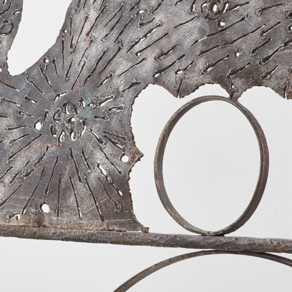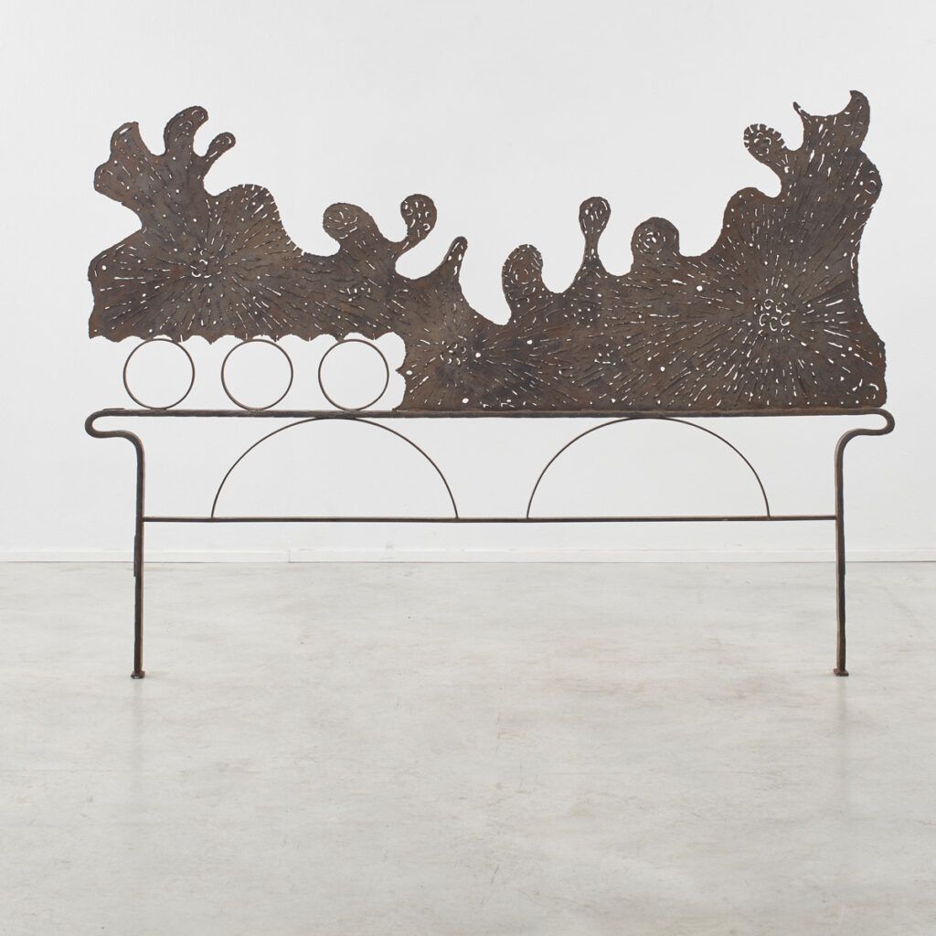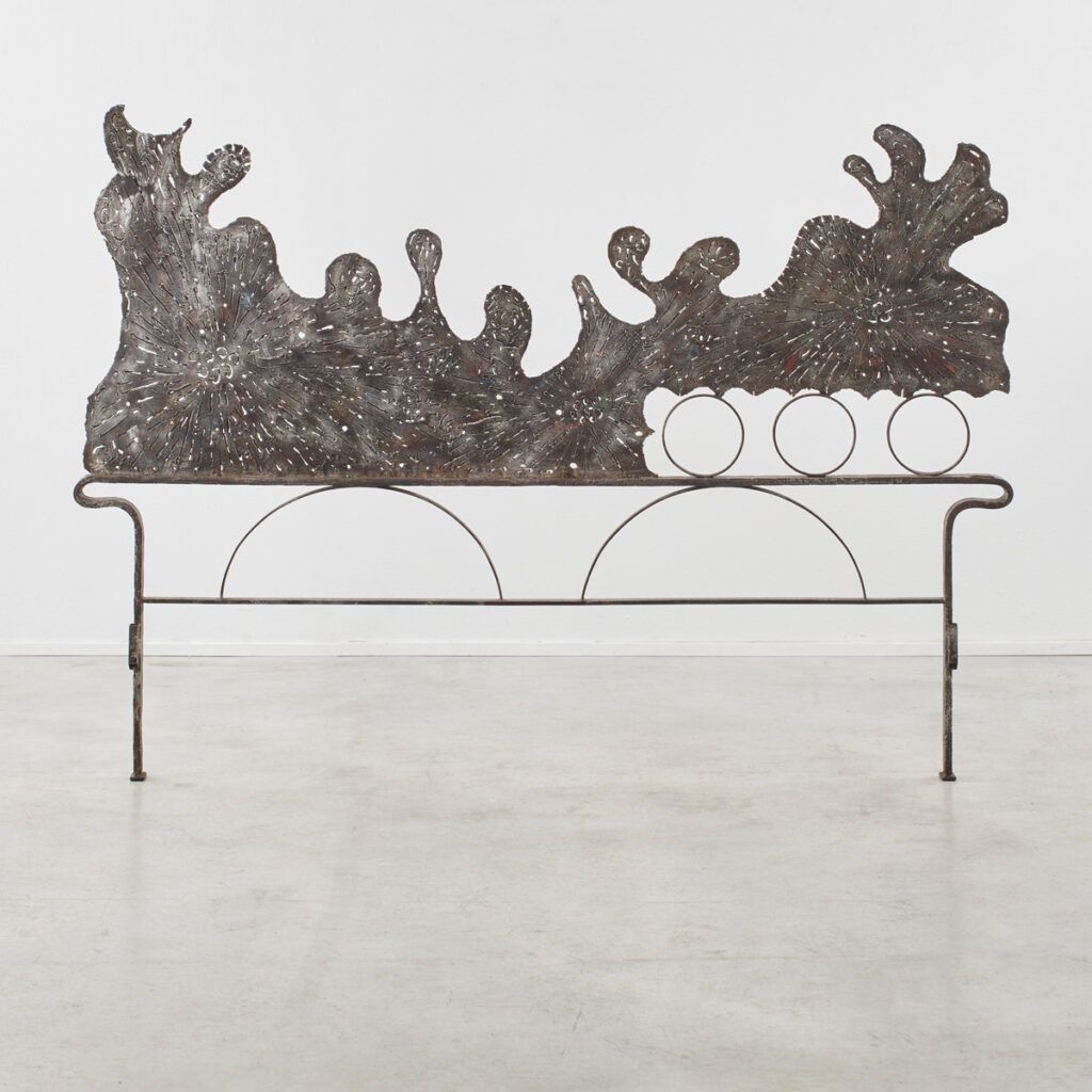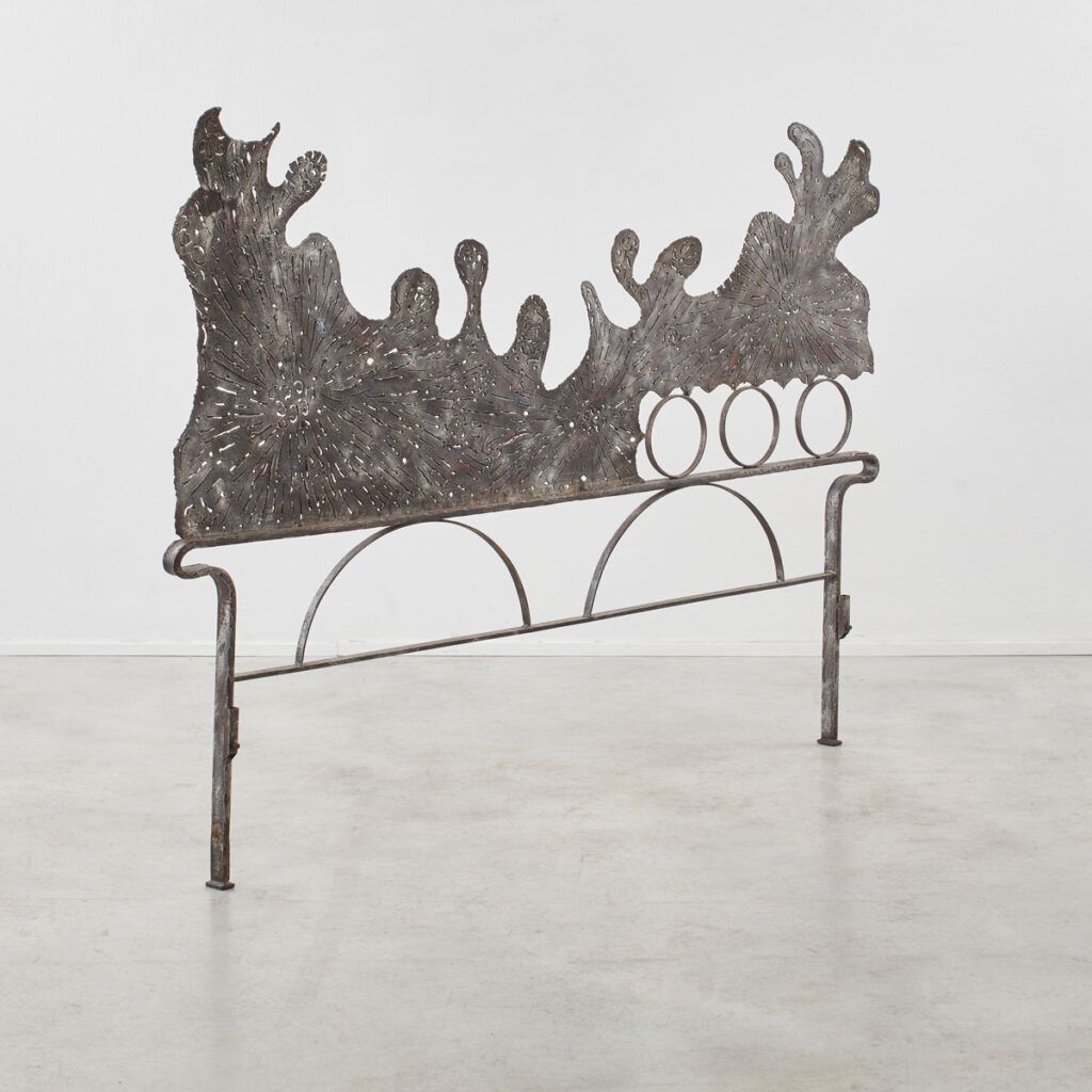 Salvino Marsura was born in Treviso in 1938 and learnt his craft in the dynamic workshop of sculptor Toni Benetton. His ironwork art and furniture relishes in the manual aesthetic of the forge, giving voice to the raw metal and the processes of its manipulation including sweltering heat, hammering, bending, and welding. The results can be beautifully abstract, geometric, or sensitively responsive to observation of natural forms. On this singular, stately headboard two semi-circular forms support a billowing cloud-like element in polished steel inscribed with radiating lines.