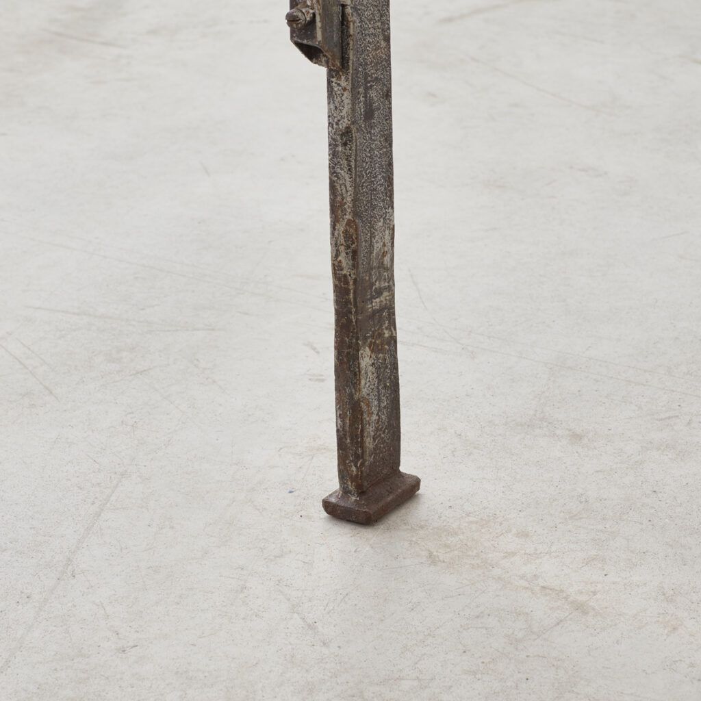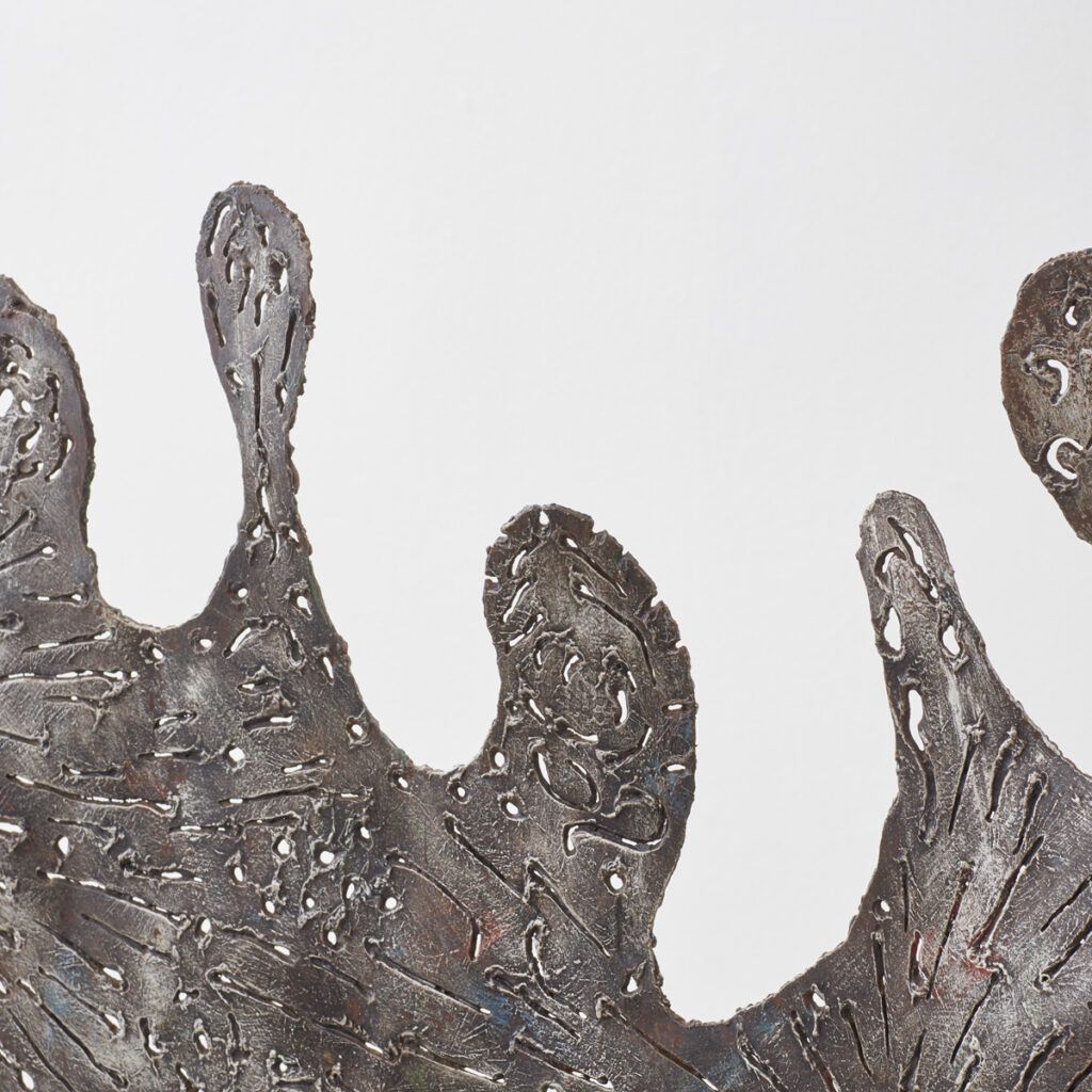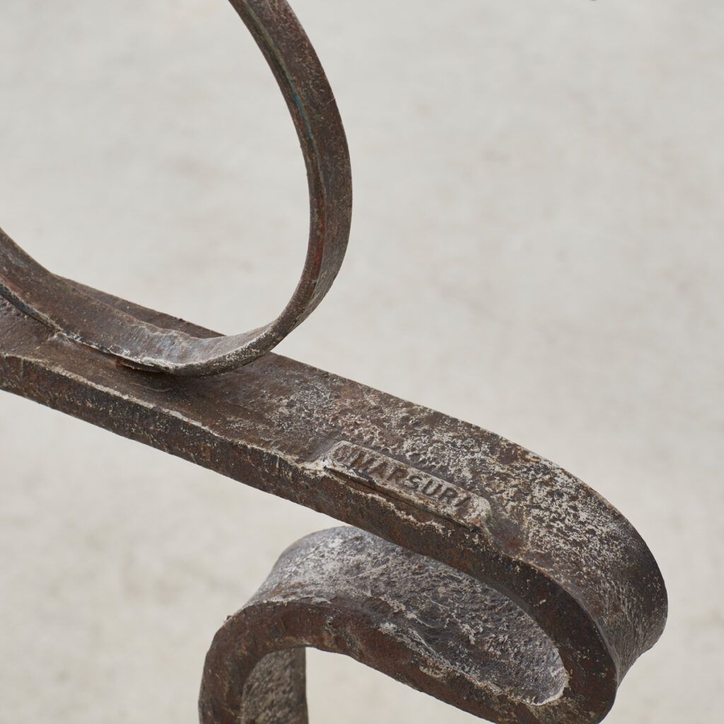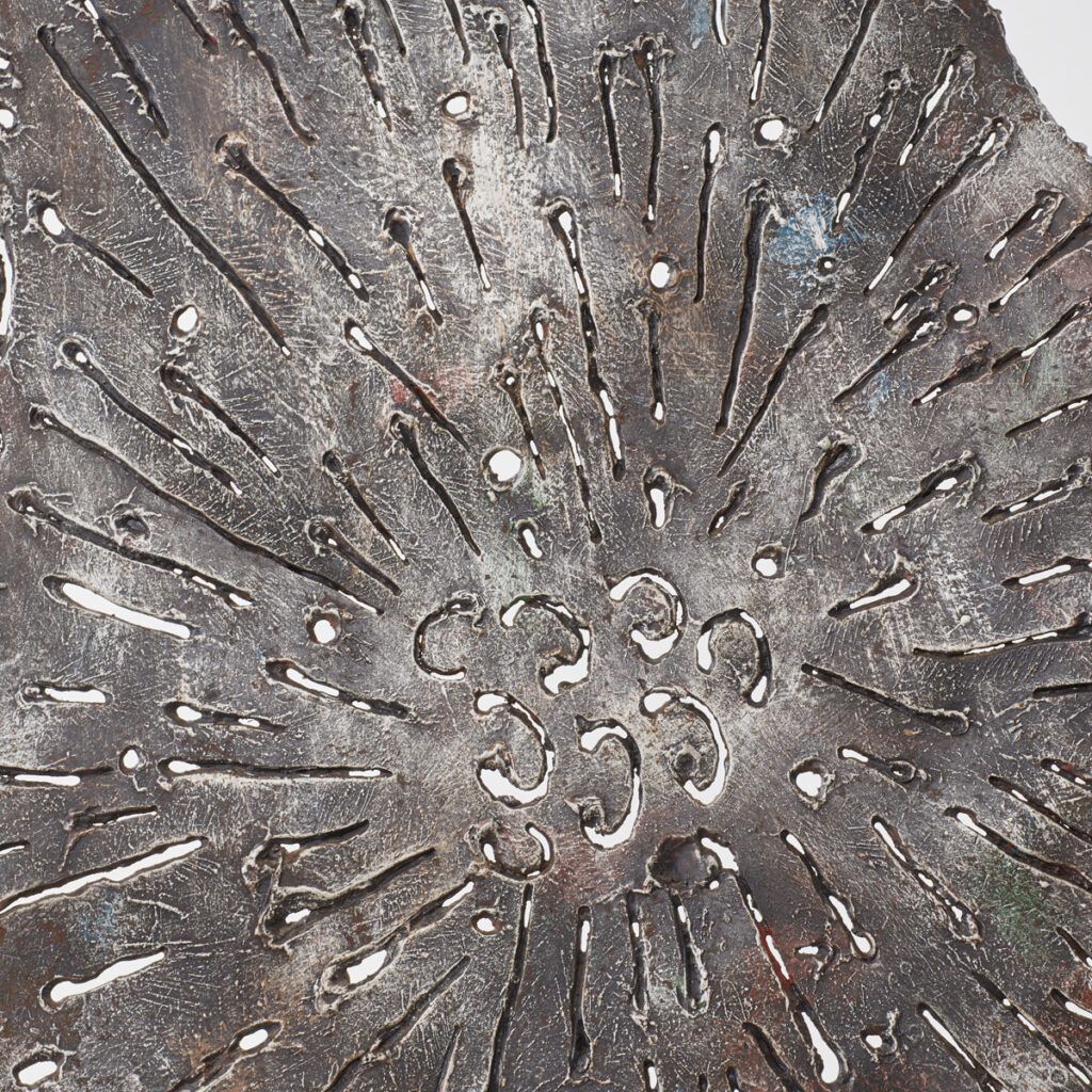 Salvino Marsura was born in Treviso in 1938 and learnt his craft in the dynamic workshop of sculptor Toni Benetton. His ironwork art and furniture relishes in the manual aesthetic of the forge, giving voice to the raw metal and the processes of its manipulation including sweltering heat, hammering, bending, and welding. The results can be beautifully abstract, geometric, or sensitively responsive to observation of natural forms. On this singular, stately headboard two semi-circular forms support a billowing cloud-like element in polished steel inscribed with radiating lines.