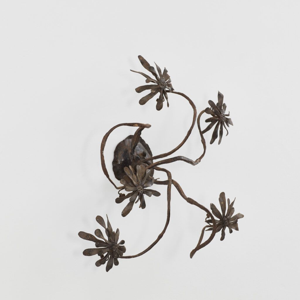 Five iron daisies, each with elaborately wrought petals, cradle the bulbs of the Margherite wall light. Its slender stems cast soft shadows against the wall, meeting at the centre to complete the piece.