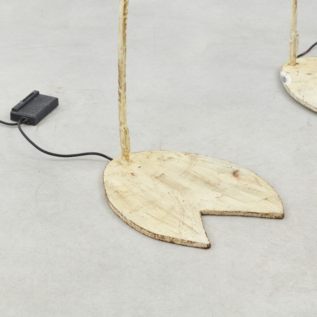 Produced by Salvino Marsura in the 2000s, this pair of delicate metal floor lamps exhibit an Art Nouveau sensibility with their botanic motif. Fresh leaves emerge from a curved stem that rises from a lily pad-like base.