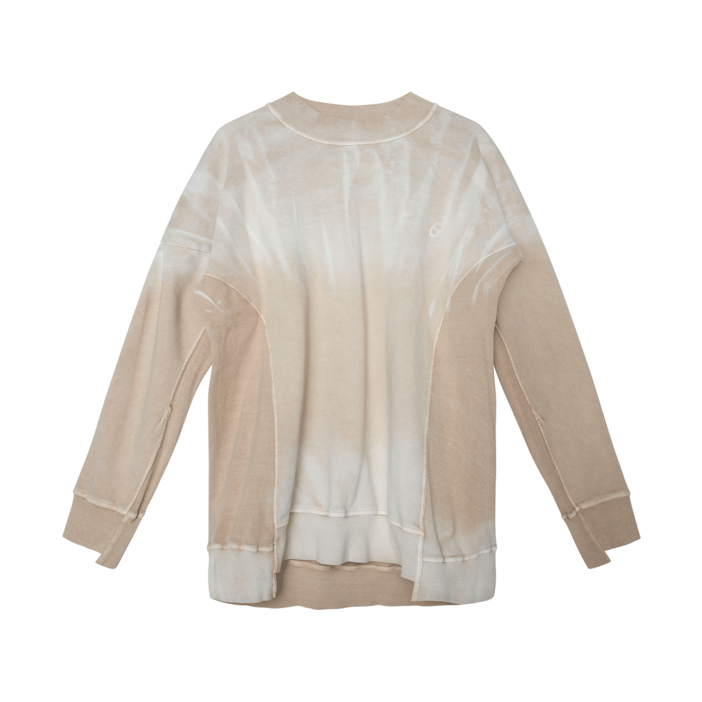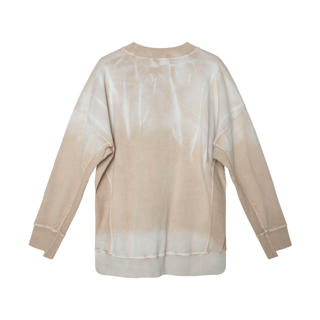 Sand Dye Crewneck features asymmetrical cuffs and hem, rib knit crewneck collar, cuffs, side panels, and hem, raw seams throughout, and tonal logo embroidery at chest.