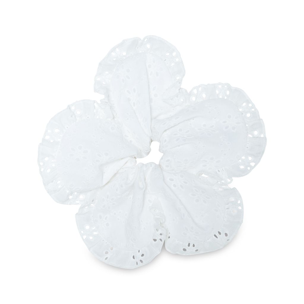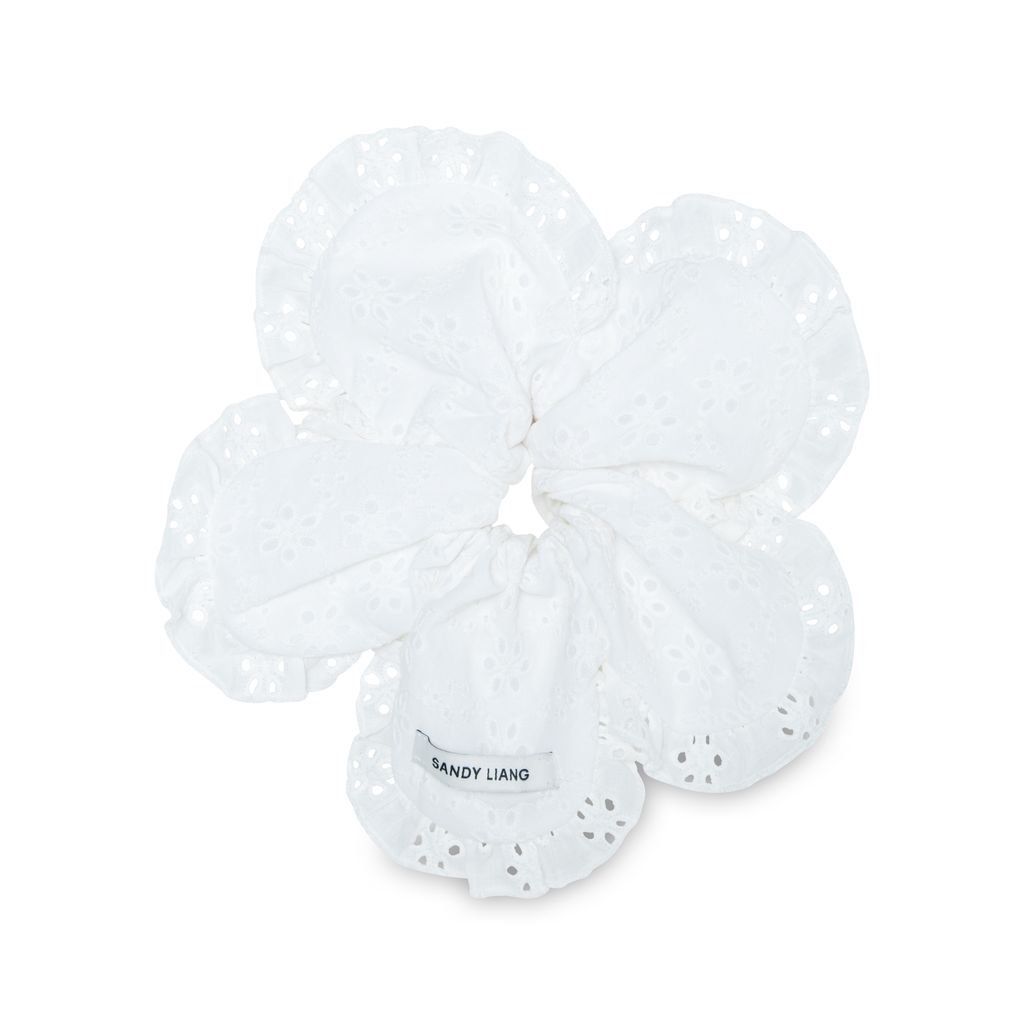 Sandy Liang White Flower Power Scrunchie features ruffled trim at edges, eyelet flower designs, and logo patch at back face.