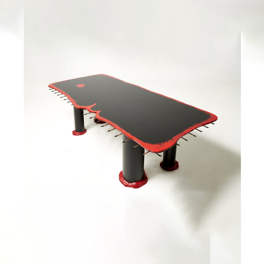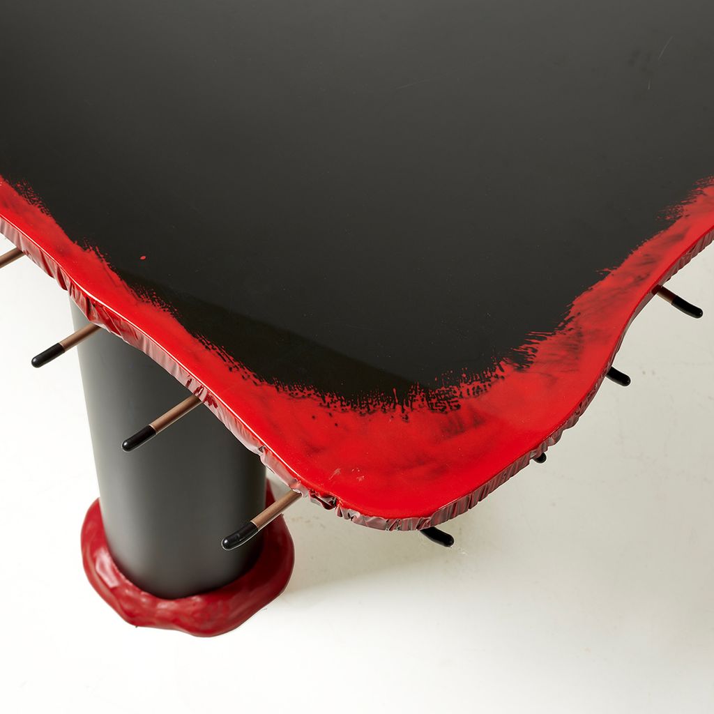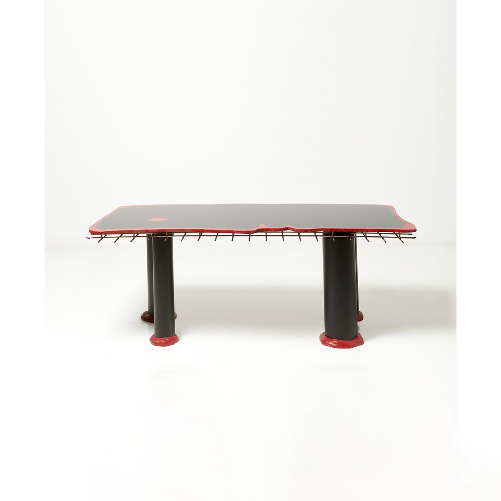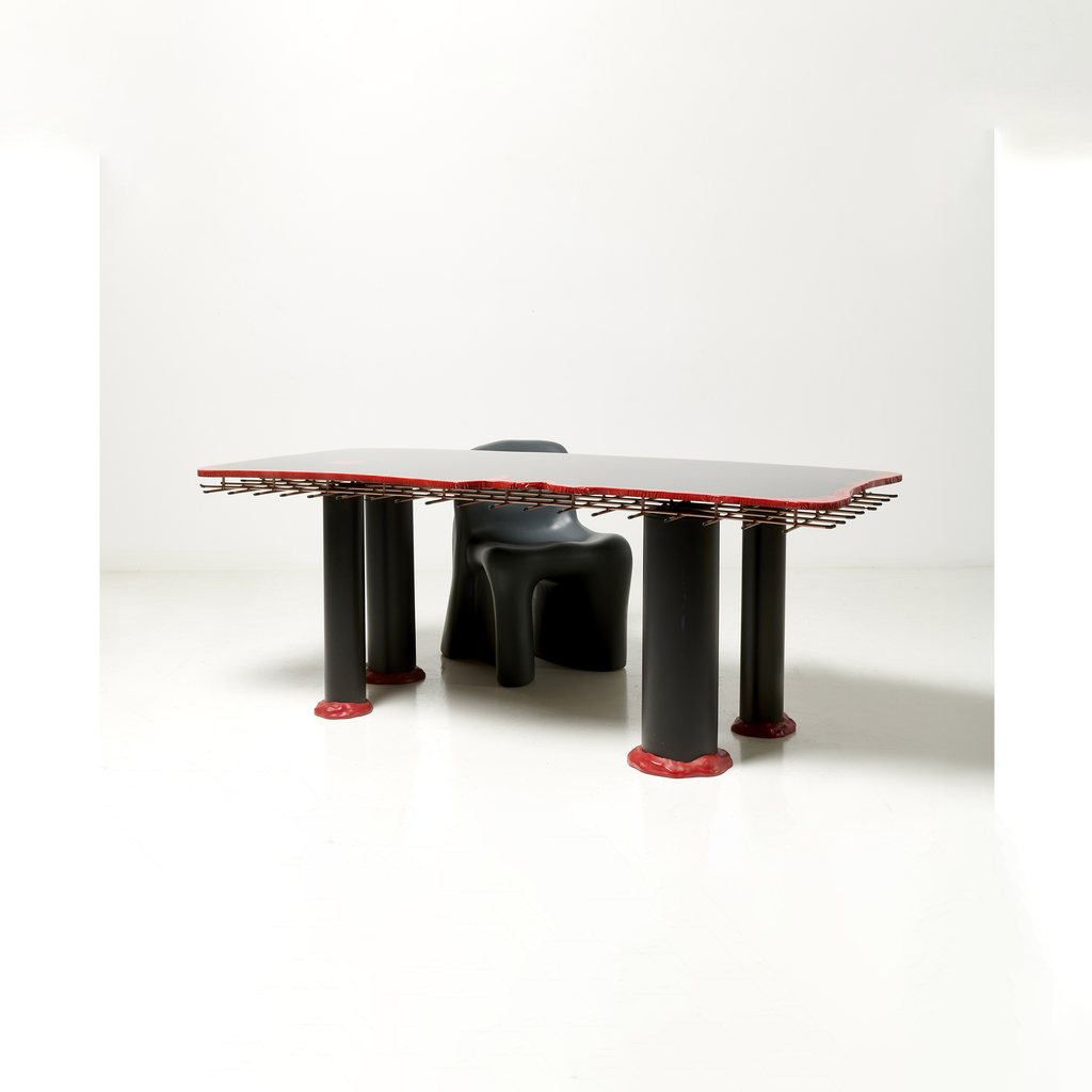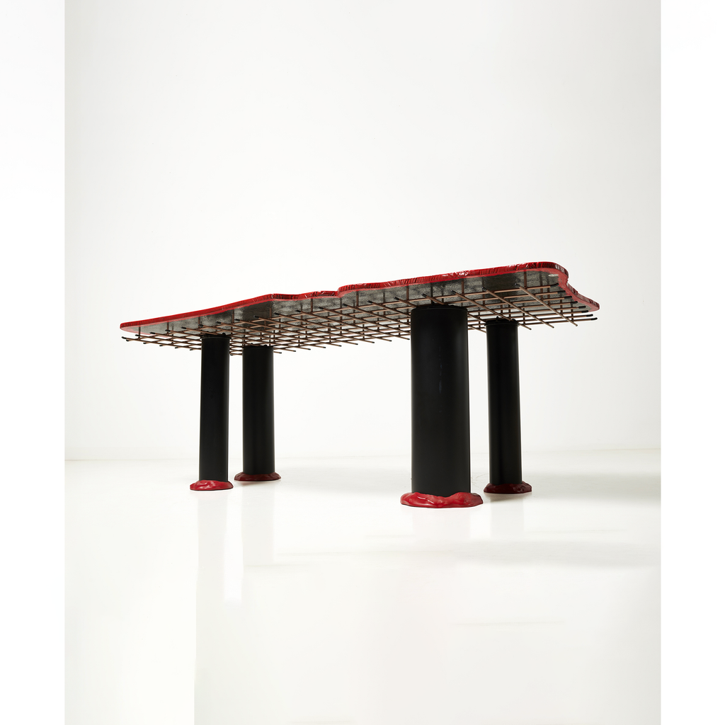 Table with four legs, in red and black epoxy resin, with a quadrangular top resting on a metal grid.