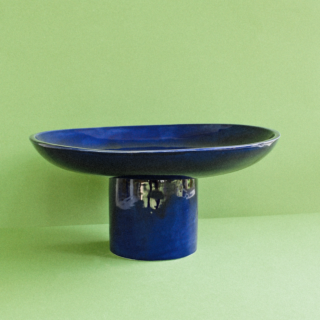 Hand-built and hand-painted bowl in a deep glaze with a coupe design; stamped. Food and liquid safe. Ideal for sharing portions or use as a fruit and vegetable storage.