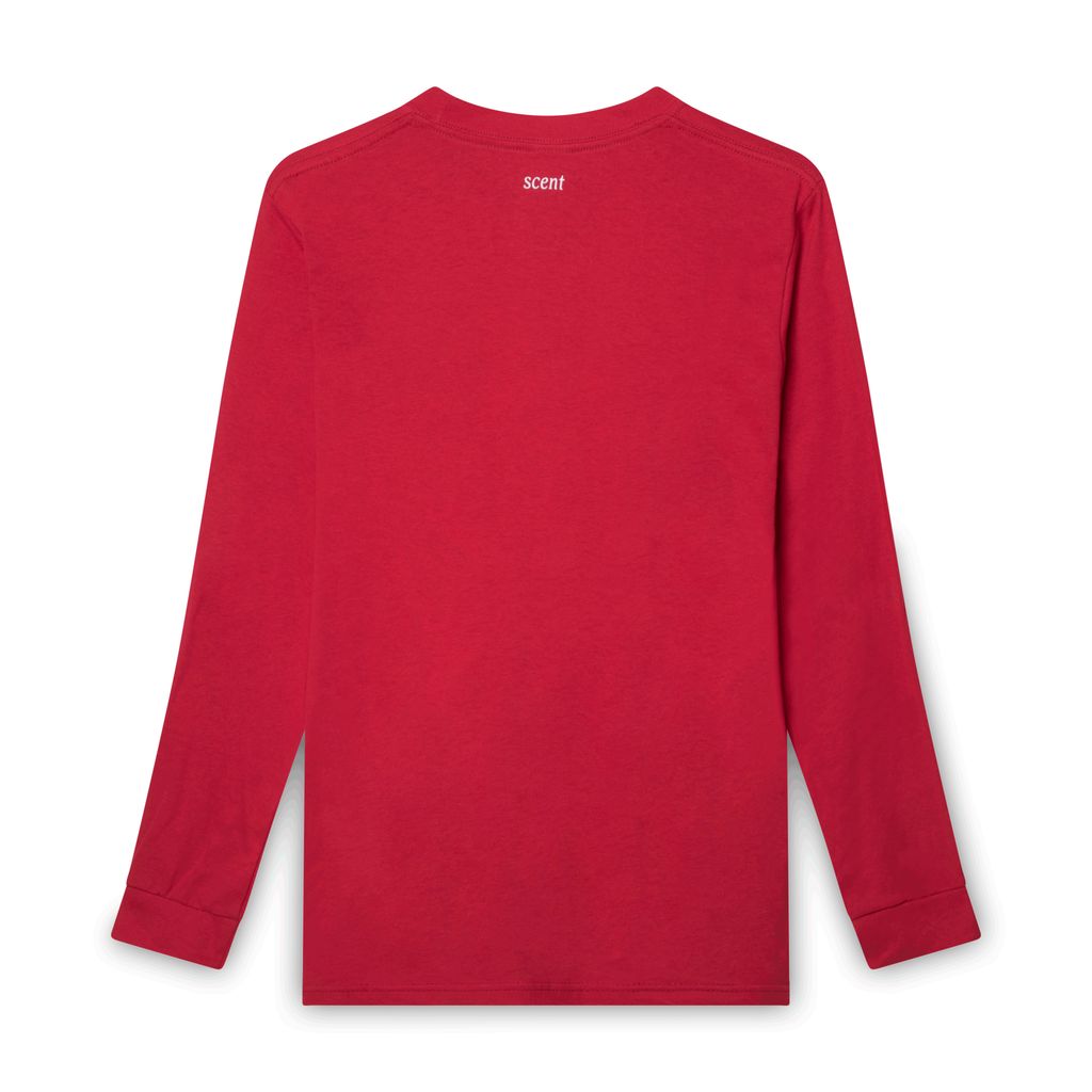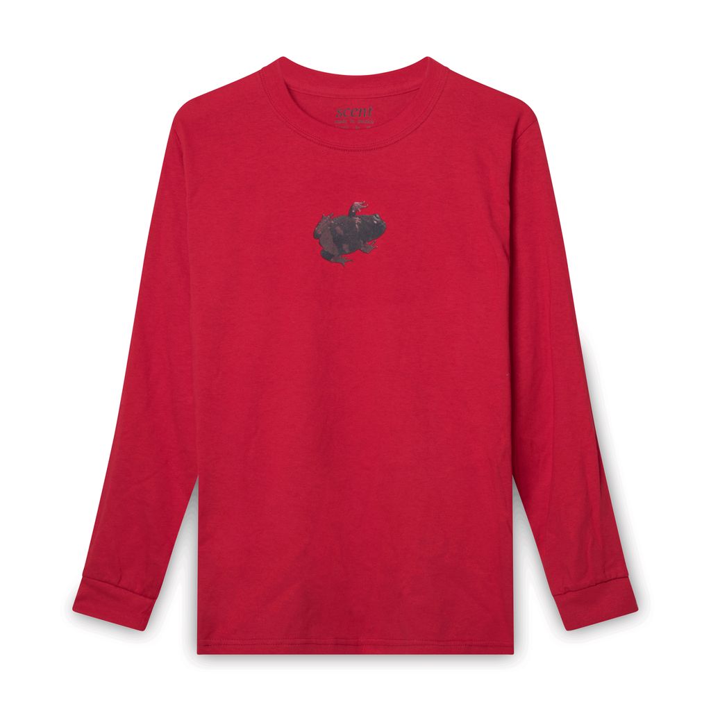 Sapito Darwin T-Shirt features a frog graphic printed on red long sleeve.