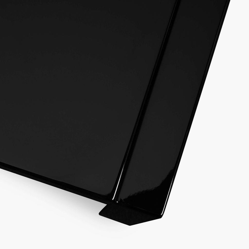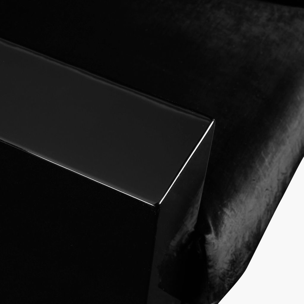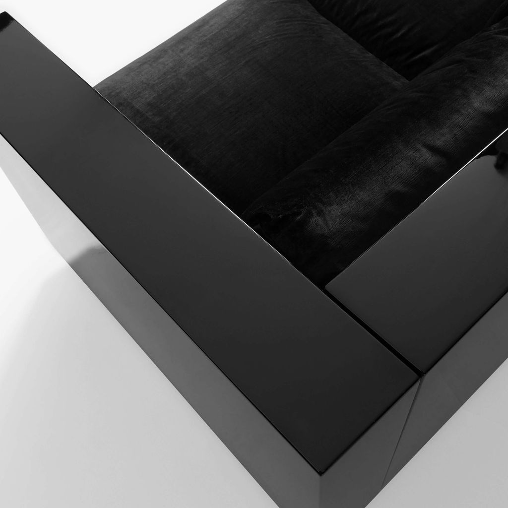 Designed by Italian couple Massimo and Lella Vignelli, this striking Saratoga Living set manifests uninhabited cool, its rigid lines juxtaposed against sumptuous lacquered surfaces and velvet upholstery. Massimo Vignelli was a celebrated twentieth-century designer whose work is known for its functional elegance.