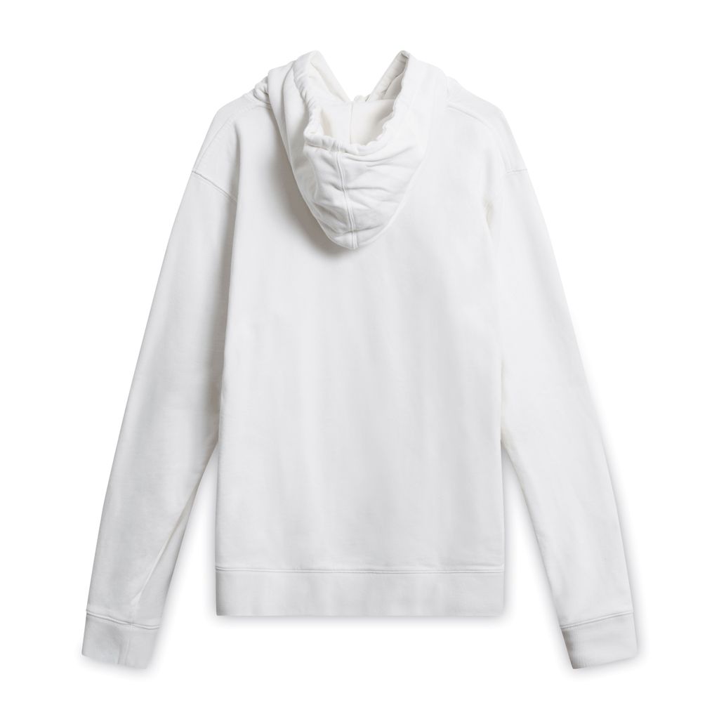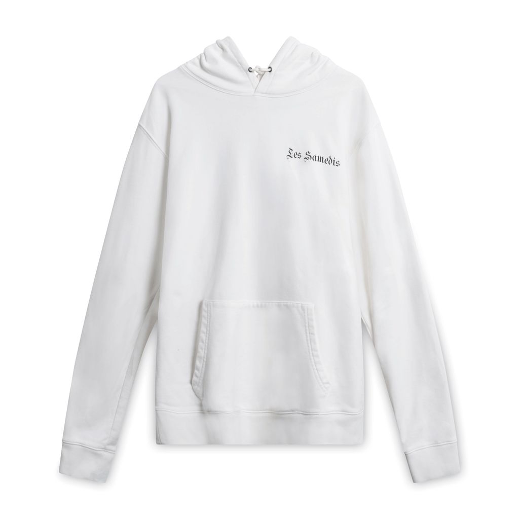 White hoodie with drawstrings. Les Samedis is written in black on the left chest.