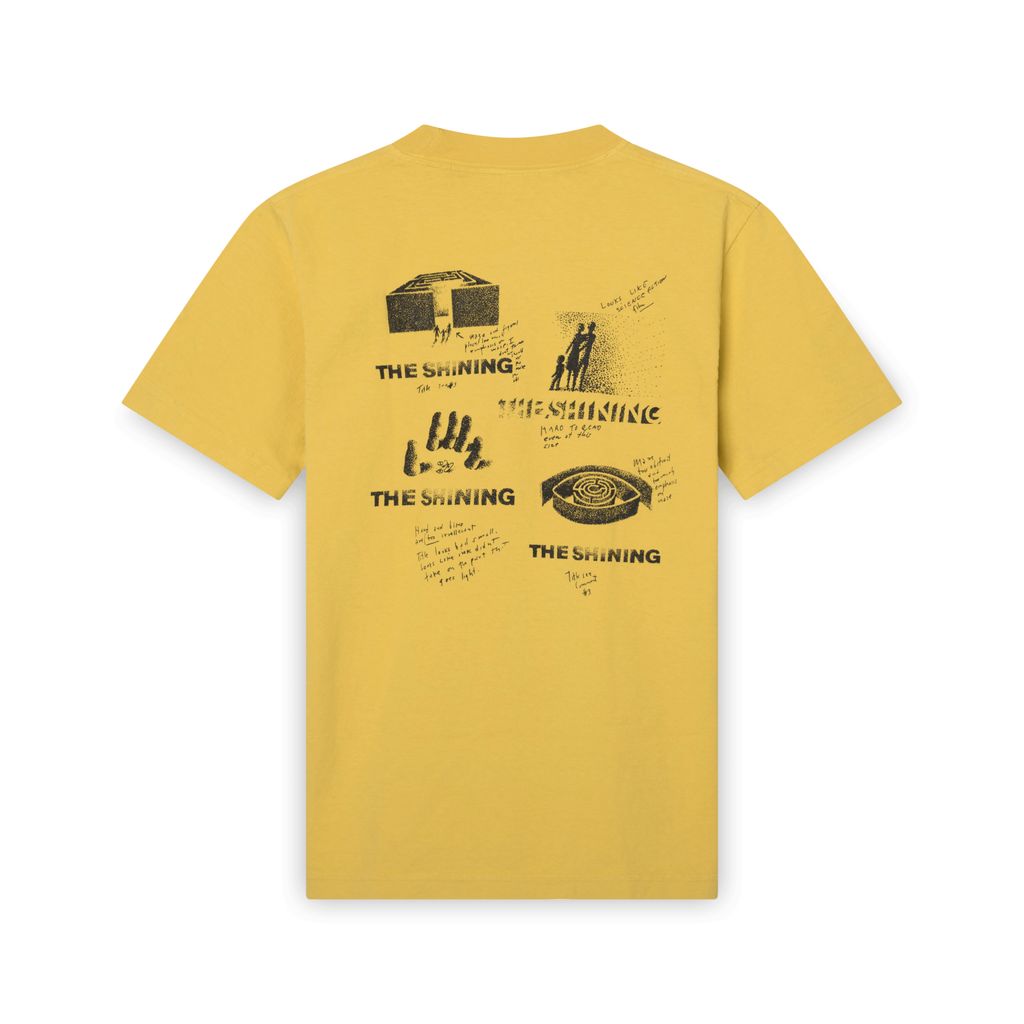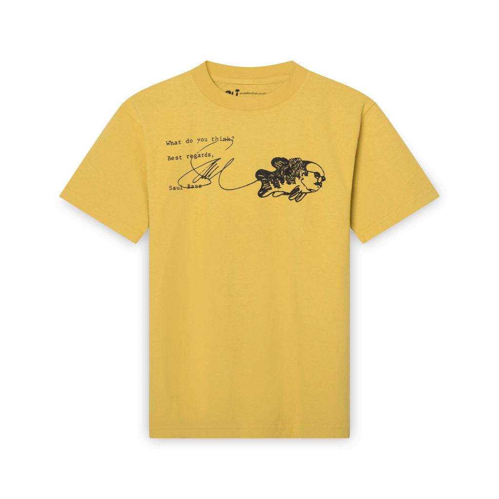 Saul Bass Tee in yellow features text and graphics on the front and back.