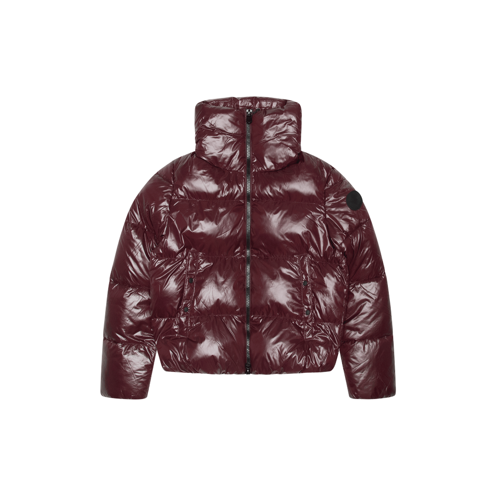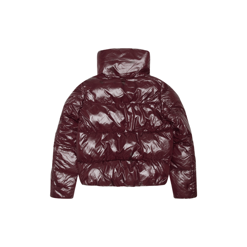 Save the Duck USA Isla Puffer in Burgundy Black features front zip closure, shiny quilted and padded shell, high neck, 2 side pockets, and logo detailing on sleeve.