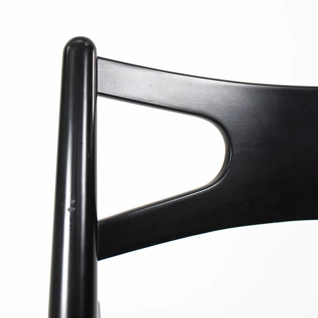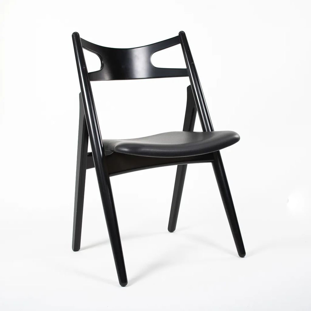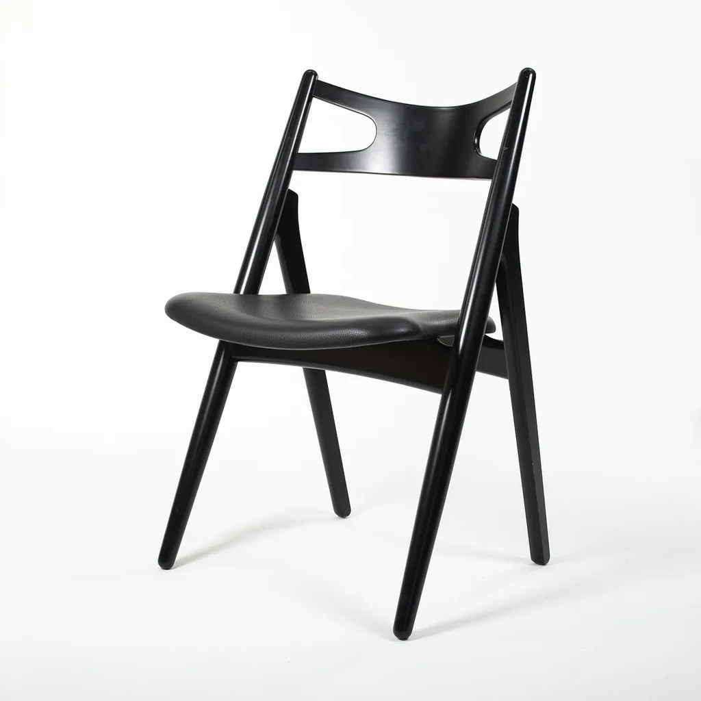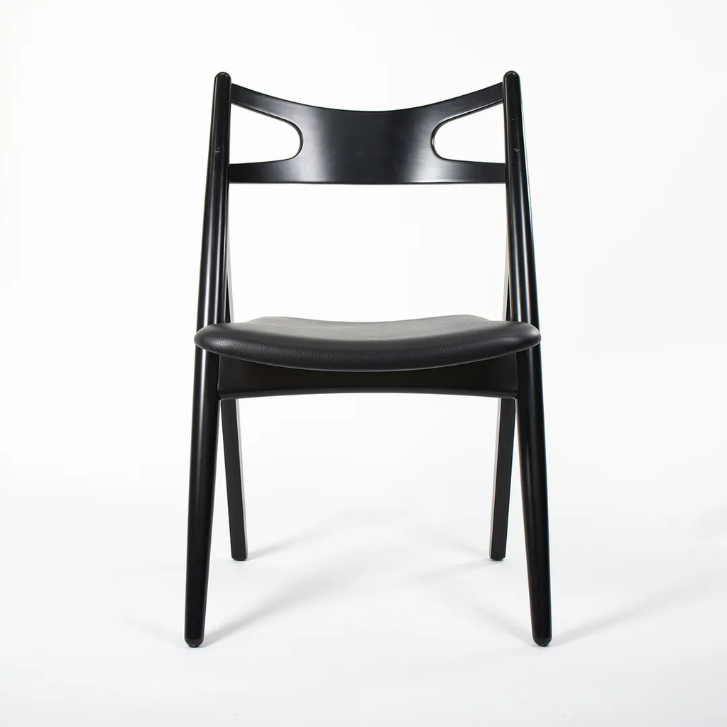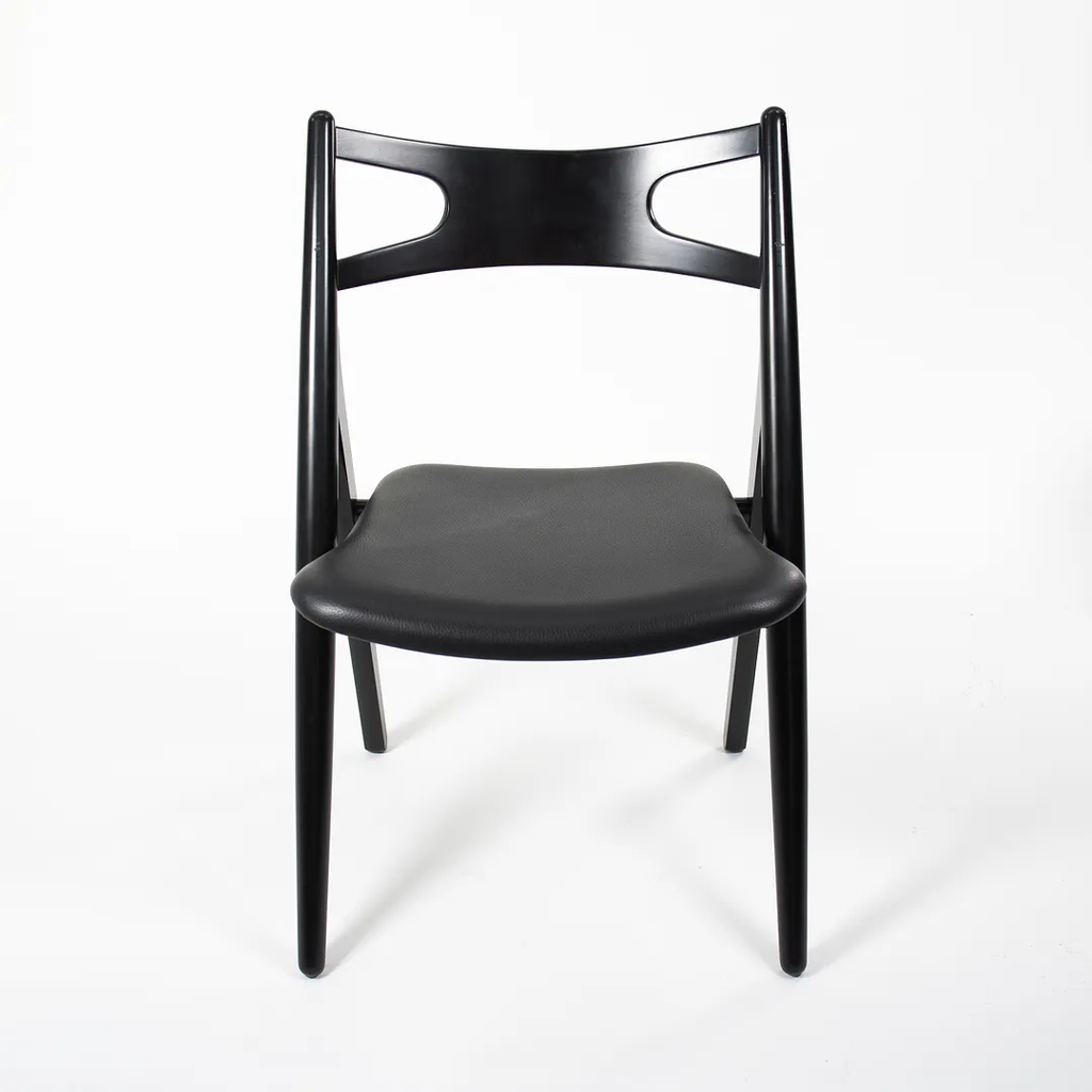 This is a CH29P Sawbuck Dining Chair made with a black beech frame and black leather seat. The seat leather appears to be Loke 7150. The chair, designed by Hans Wegner and produced by Carl Hansen & Son in Denmark, dates to circa 2021 and is guaranteed as authentic. Condition is very good to excellent with some nicks on the frame. See photos. By request, we could certainly do our best to touch up those spots prior to shipping. The chair came directly from Carl Hansen and was used as a floor / display model in one of their showrooms.