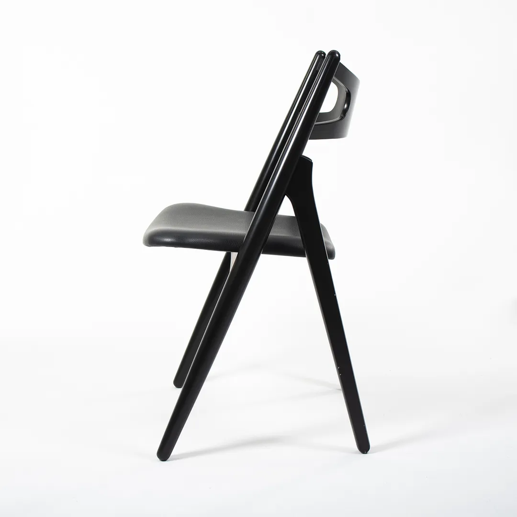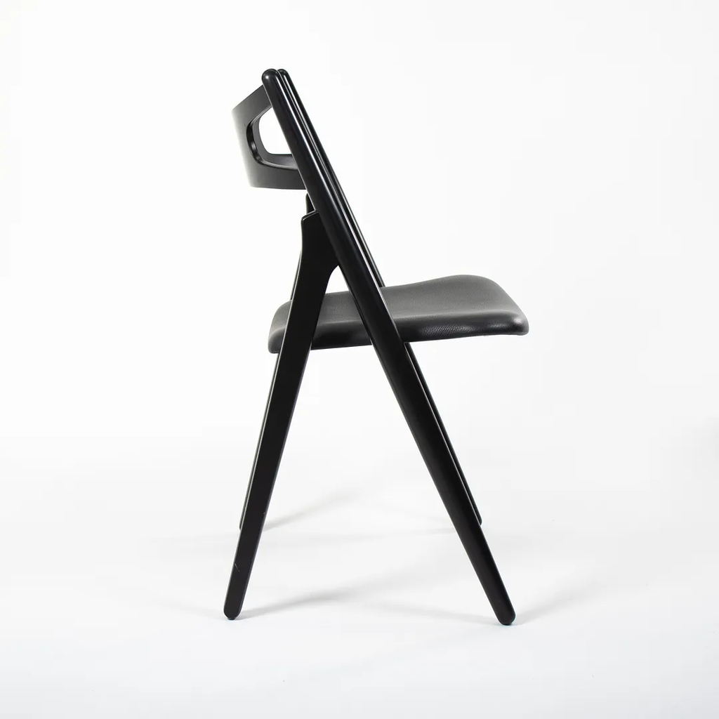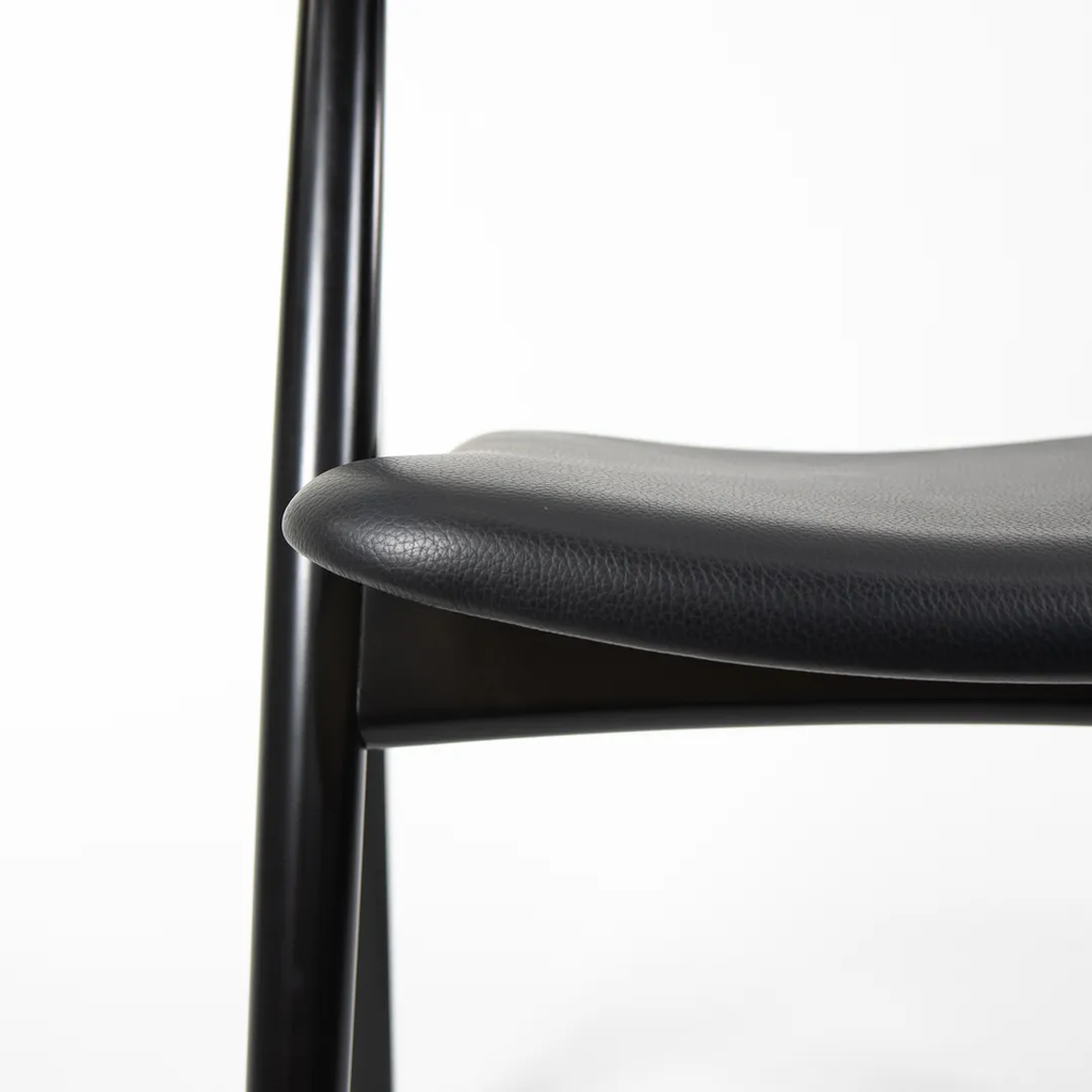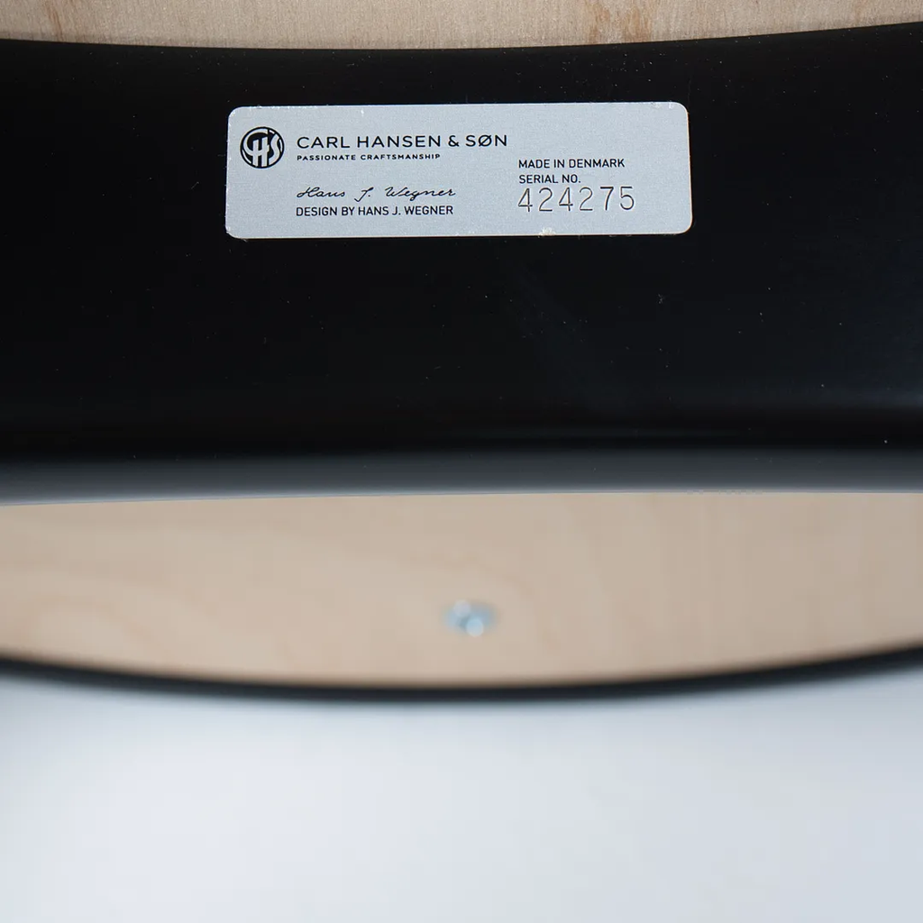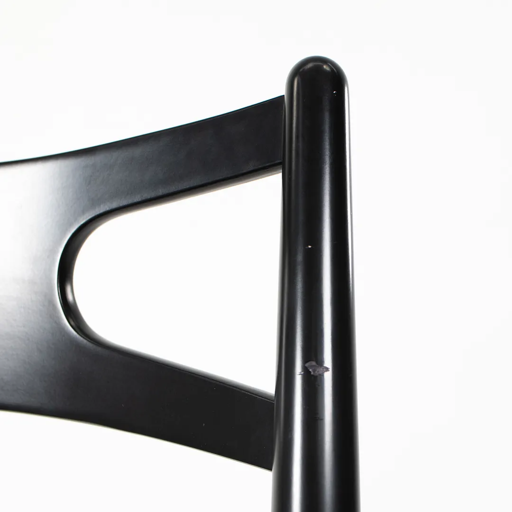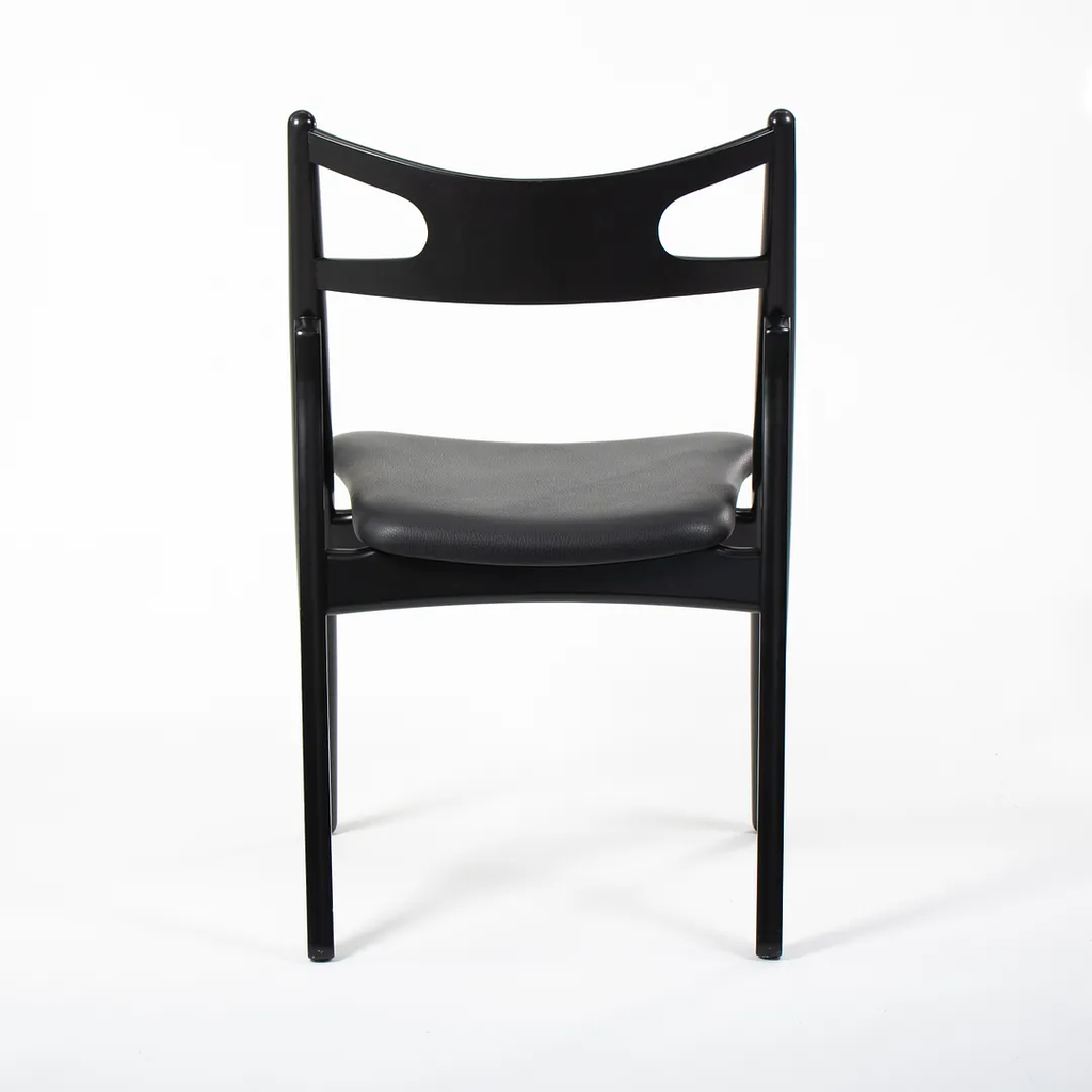 This is a CH29P Sawbuck Dining Chair made with a black beech frame and black leather seat. The seat leather appears to be Loke 7150. The chair, designed by Hans Wegner and produced by Carl Hansen & Son in Denmark, dates to circa 2021 and is guaranteed as authentic. Condition is very good to excellent with some nicks on the frame. See photos. By request, we could certainly do our best to touch up those spots prior to shipping. The chair came directly from Carl Hansen and was used as a floor / display model in one of their showrooms.