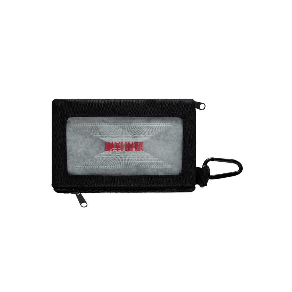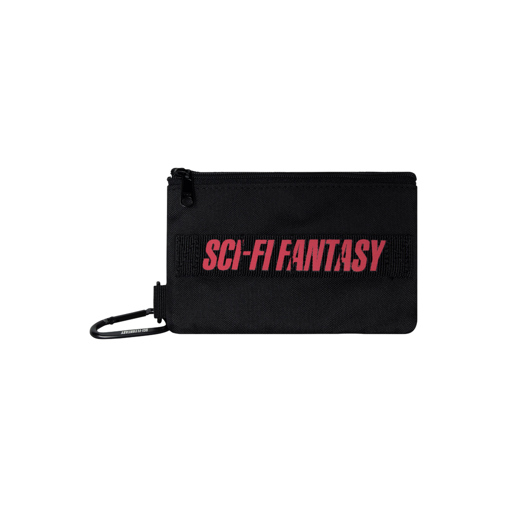 Sci Fi Fantasy Black Pouch features top zip closure, red logo on front and back, and carabiner clip.
