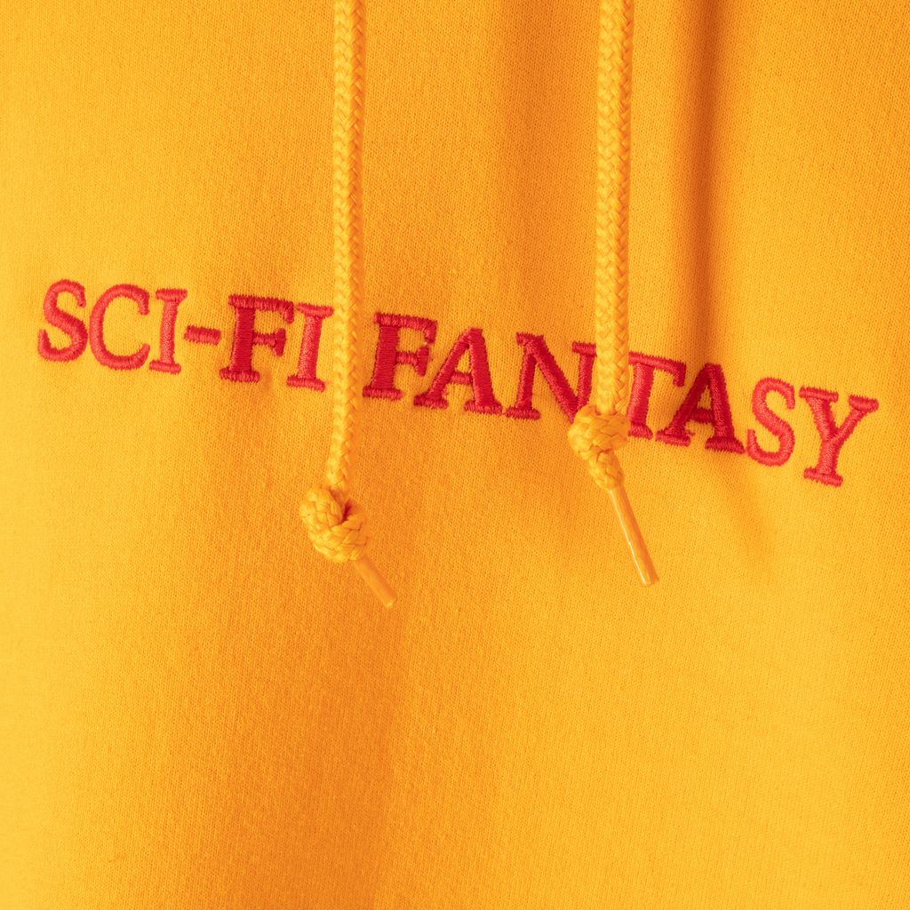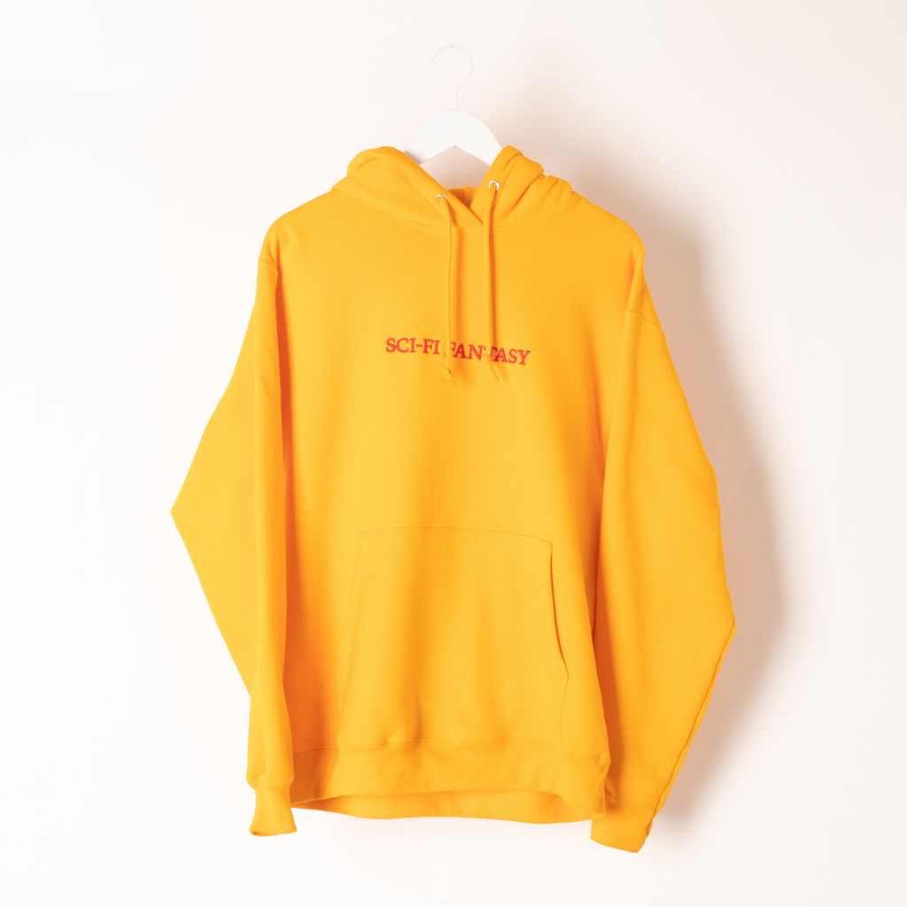 Gently worn, logo hoodie from Jerry Hsu's Sci-Fi Fantasy. Extremely limited, only available at Supreme and Dover Street Market. Yellow pullover hoodie, heavyweight, with drawstring hoo, kangaroo pocket and embroidered graphic.