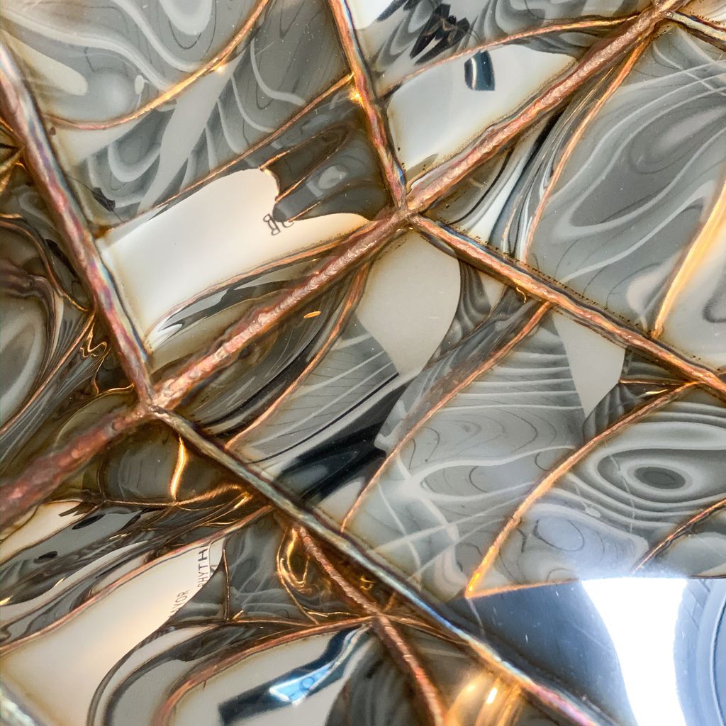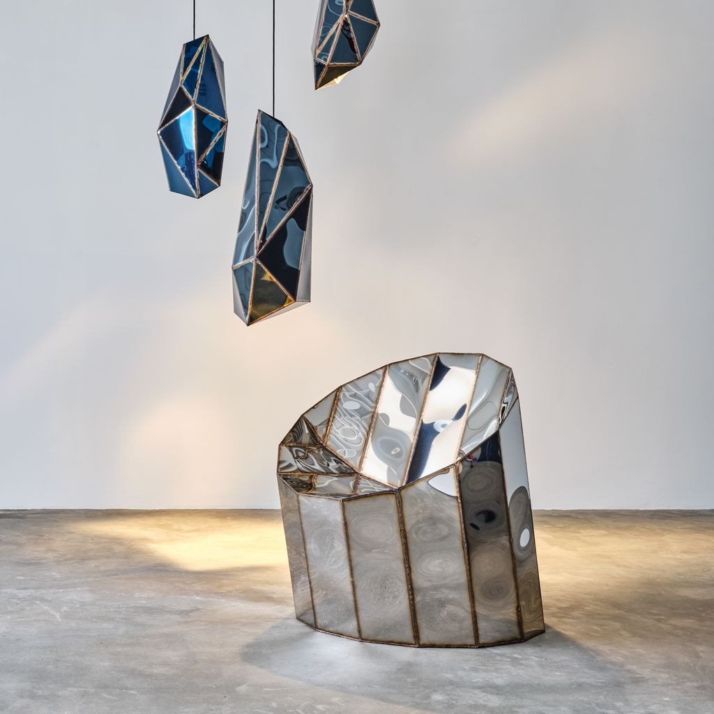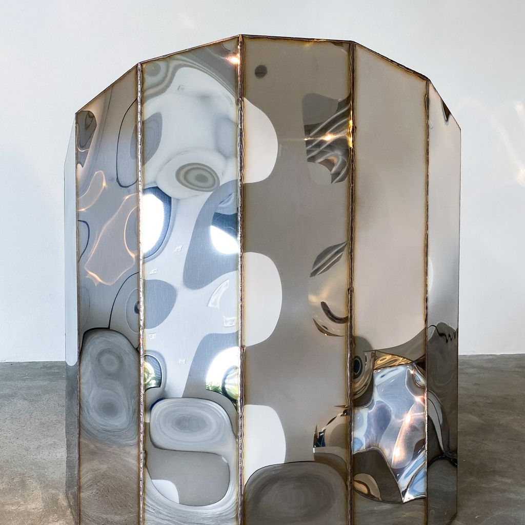 Mayor digitally designs his pieces using sophisticated CAD applications and then meticulously hand-makes each piece using traditional welding techniques. The surfaces are mirror-smooth anodized stainless steel that warps and twists when the seams are welded, allowing a viewer to experience and understand the craftsmanship behind the construction. Mayor’s technique is inspired by the sculptural possibilities of a high-tech approach while also embracing the idiosyncrasies and individuality of the hand-made.